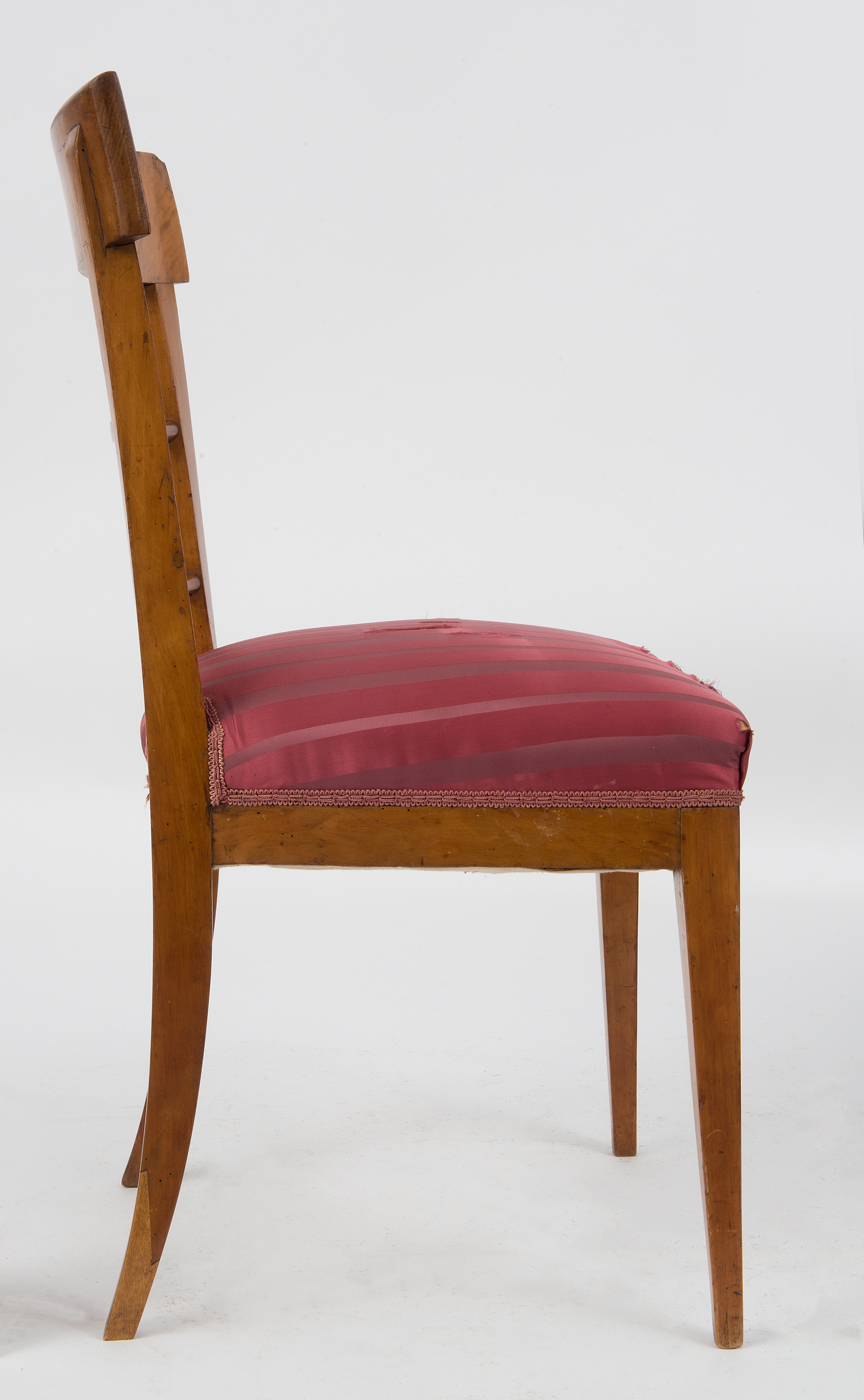 Krzesło o trapezoidalnym siedzisku, na czterech nogach o przekroju kwadratowym, lekko zbieżnych, nieco odgiętych ku tyłowi, płynnie przechodzących w ramiaki boczne oparcia, lekko odchylonego do tyłu. Oparcie ażurowe lekko łukowato wygięte, od tyłu o zaokrąglonych kantach. Szeroki ramiak górny wystający poza ramiaki boczne, poniżej dwie wąskie poziome łączyny w formie półwałka, wpuszczone w ramiaki boczne. Oskrzynienie proste, gładkie. Całość konstrukcji pokryta jasnym fornirem. Siedzisko tapicerowane, obite malinowym adamaszkiem w gładkie pasy naprzemiennie wąskie i szerokie.
