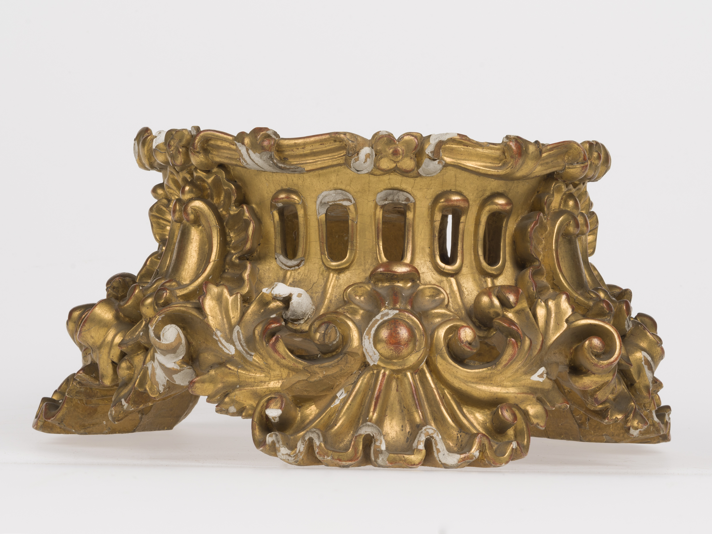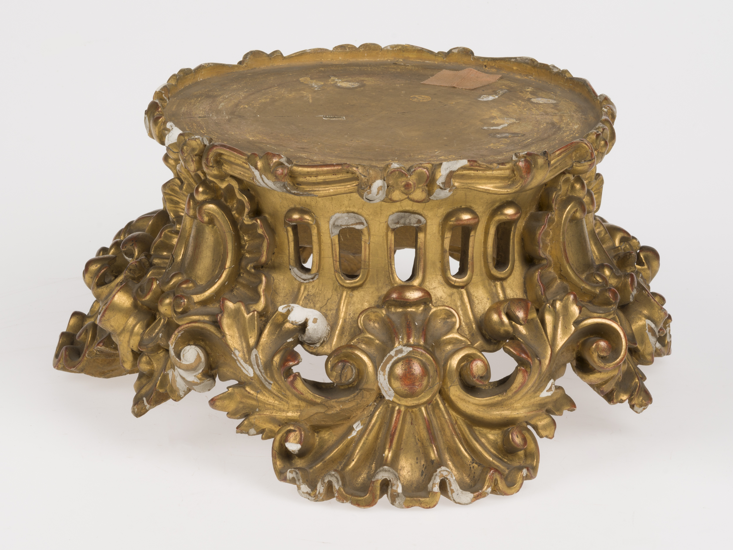 Niski postument o okrągłym przekroju, wsparty na trzech nóżkach rzeźbionych w formie muszli ujętej po bokach w pędy akantu, łączące się na bocznych osiach. Powyżej znajduje się ażurowy trzon, nad każdą nóżką ozdobiony pięcioma owalnymi otworami, a pomiędzy nóżkami – kartuszami złożonymi z par ceownic opatrzonych rocaillowymi grzebieniami. U góry wąski pas z wydłużonych liści akantu i pojedynczych czteropłatkowych kwiatków, okalający nieco zagłębiony okrągły blat.