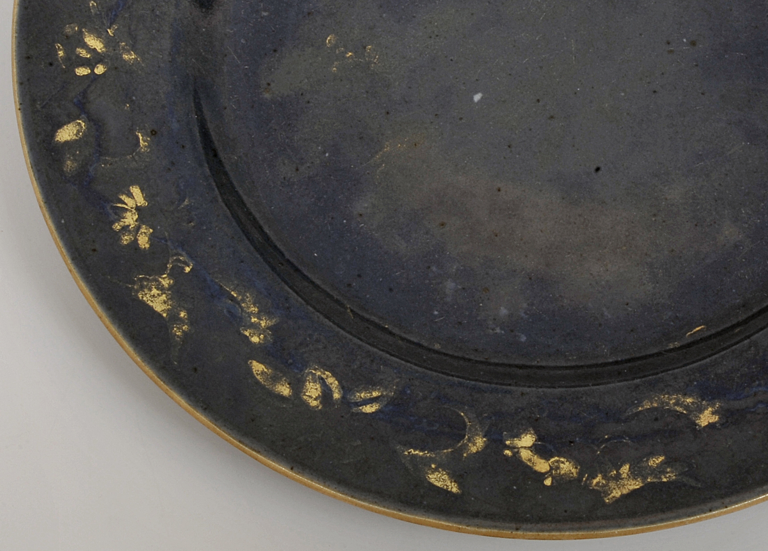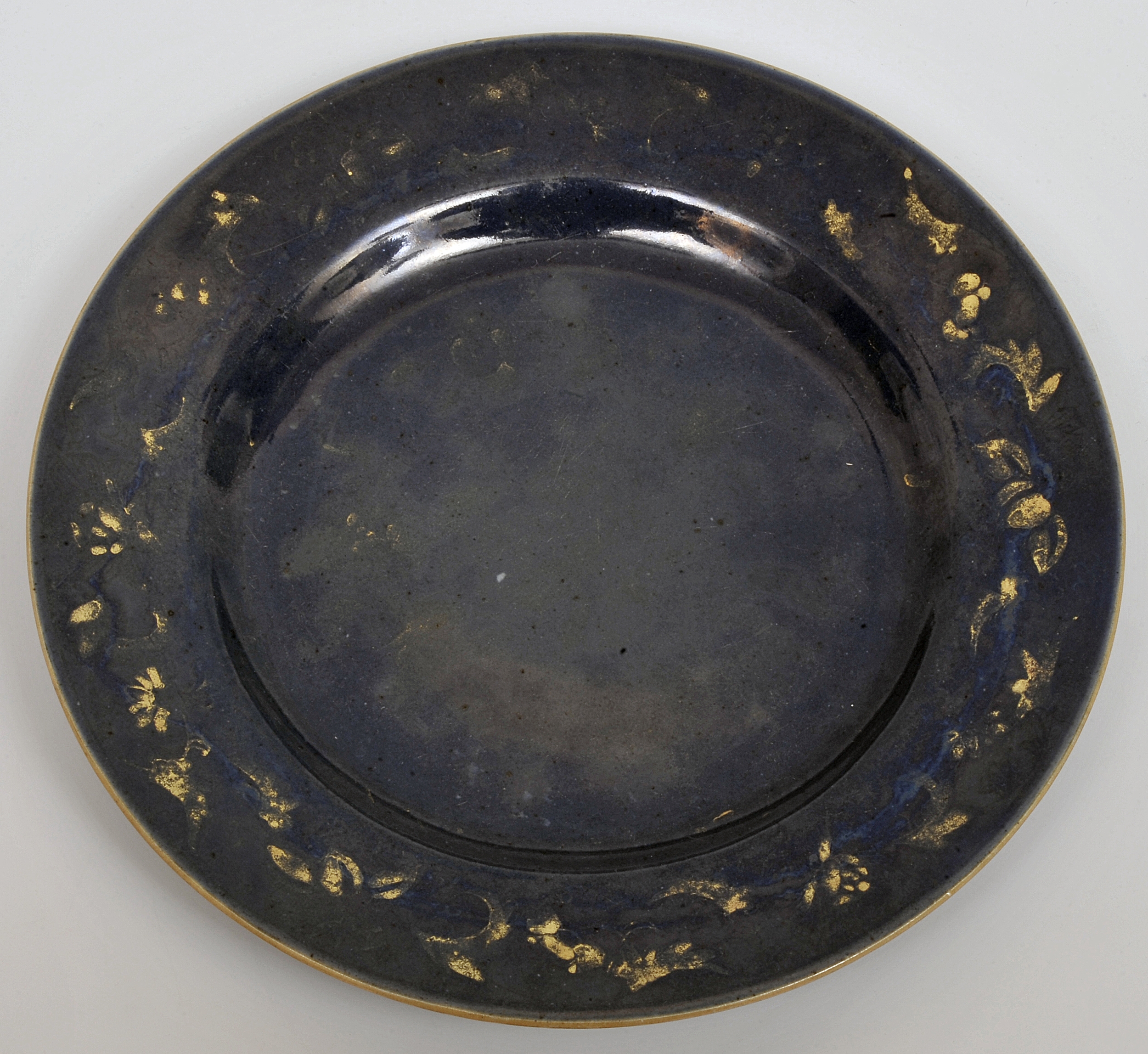 Porcelanowy talerz o dużym dnie płynnie połączonym z płaskim kołnierzem delikatnym uskokiem. Cała powierzchnia naczynia prócz spodu dna została pokryta dekoracją. Niezwykły ciemny kolor talerza i głębia jego zdobienia powstały poprzez nadmuchiwanie przez rurkę i gazę rozdrobnionego proszku kobaltowego na powierzchnię naczynia, i następnie pokrycie jej szkliwem. Złotą dekorację wykonano po wypaleniu talerza malując ją odpowiednio przygotowanym złotem. Na kołnierzu i częściowo na lustrze talerza zachowała się złota dekoracja - ze względu na charakter zdobień najbardziej narażona na zniszczenie. Przedstawia motywy floralne – stylizowaną wić roślinną na kołnierzu i być może stylizowaną peonię na lustrze. Na krawędzi kołnierza naczynia kolorystyka przechodzi w barwę beżową.