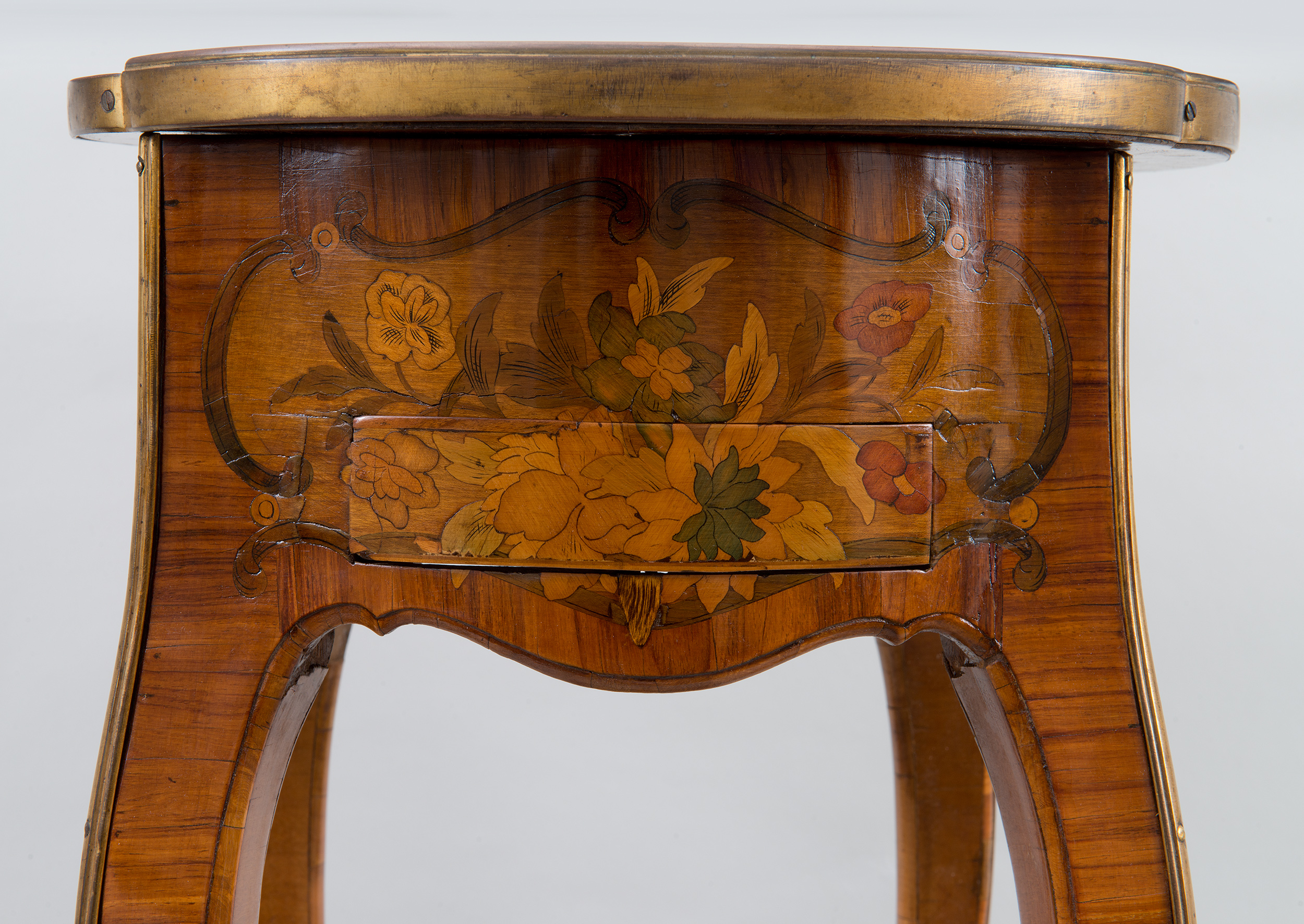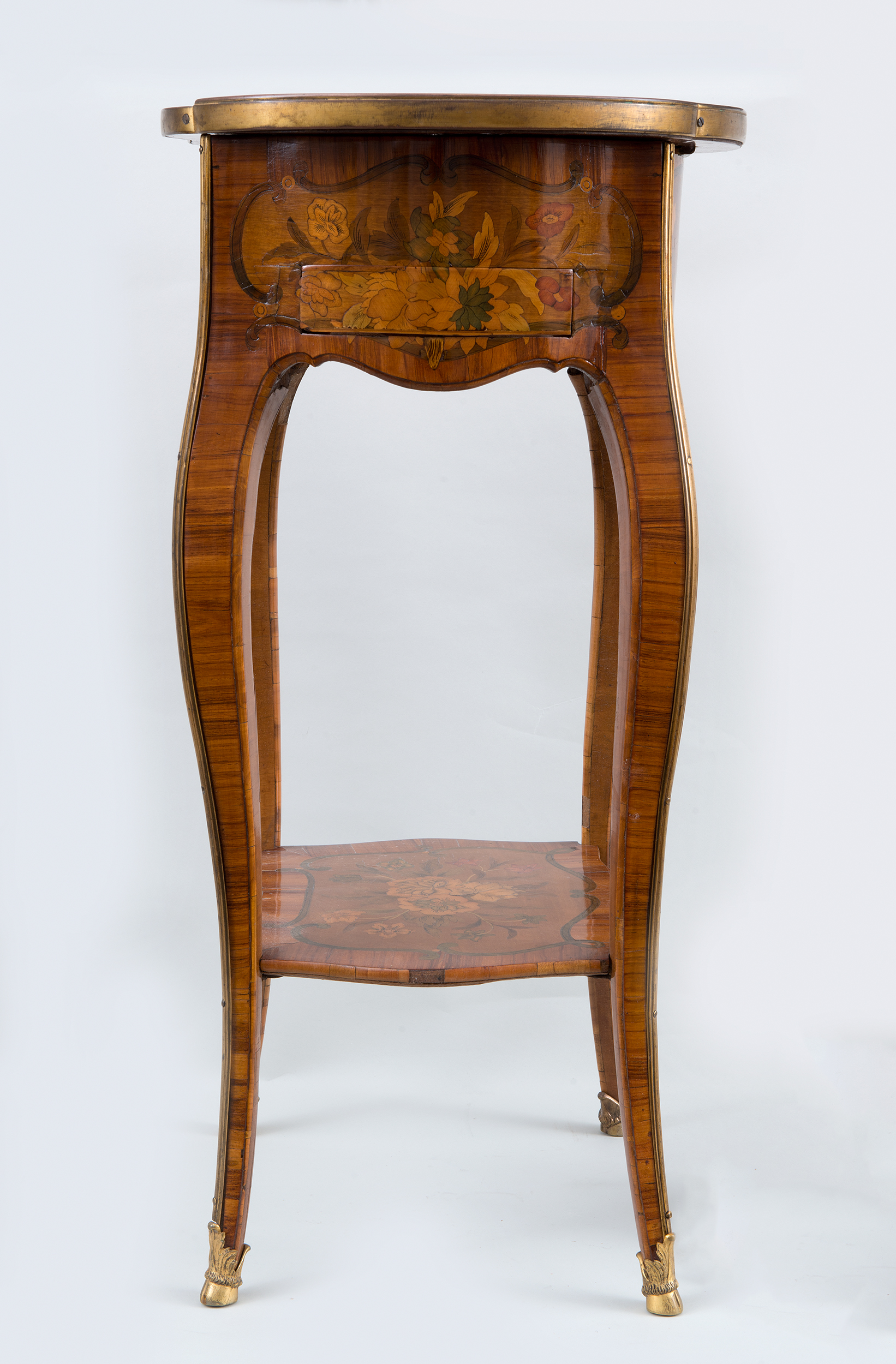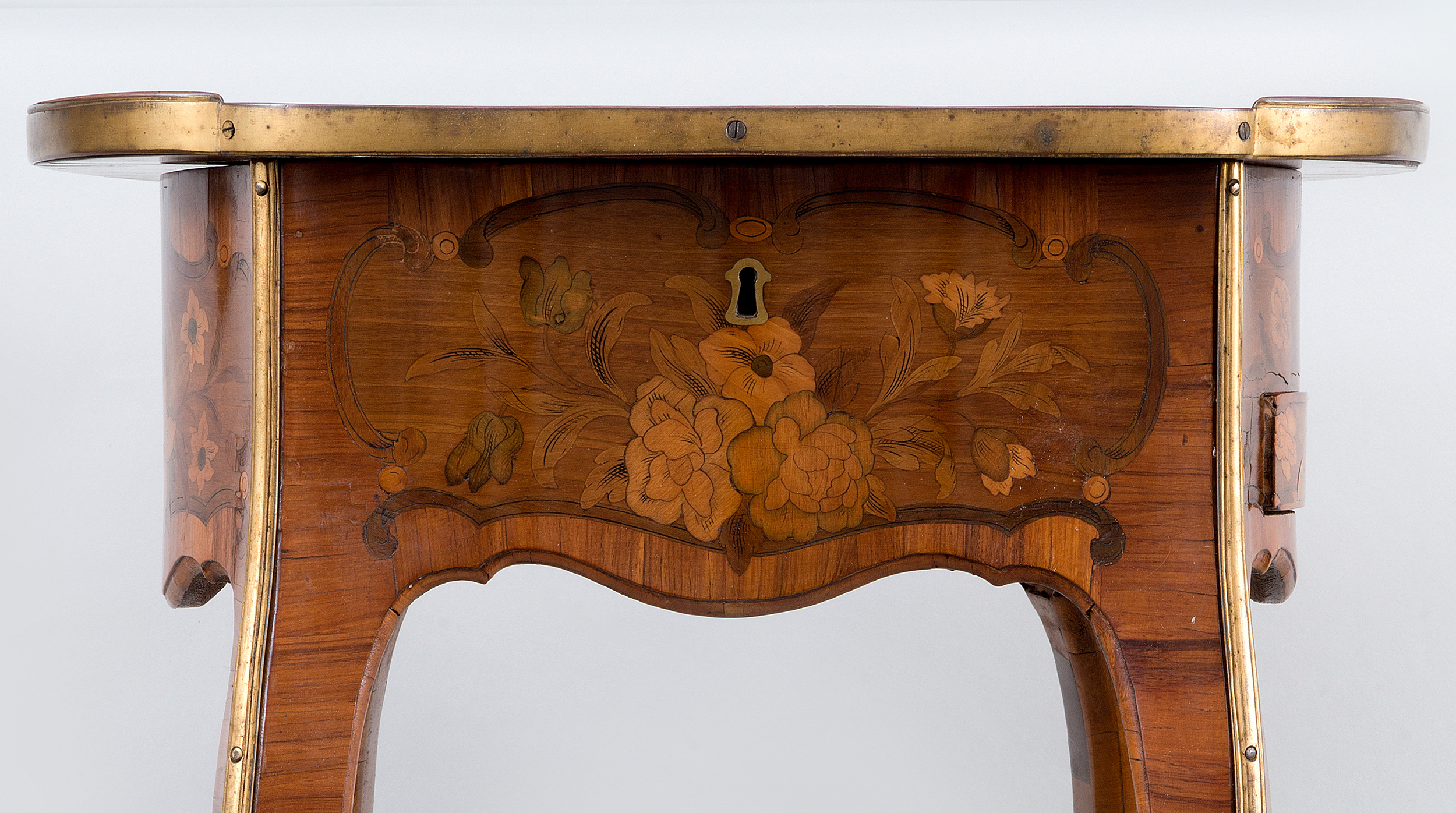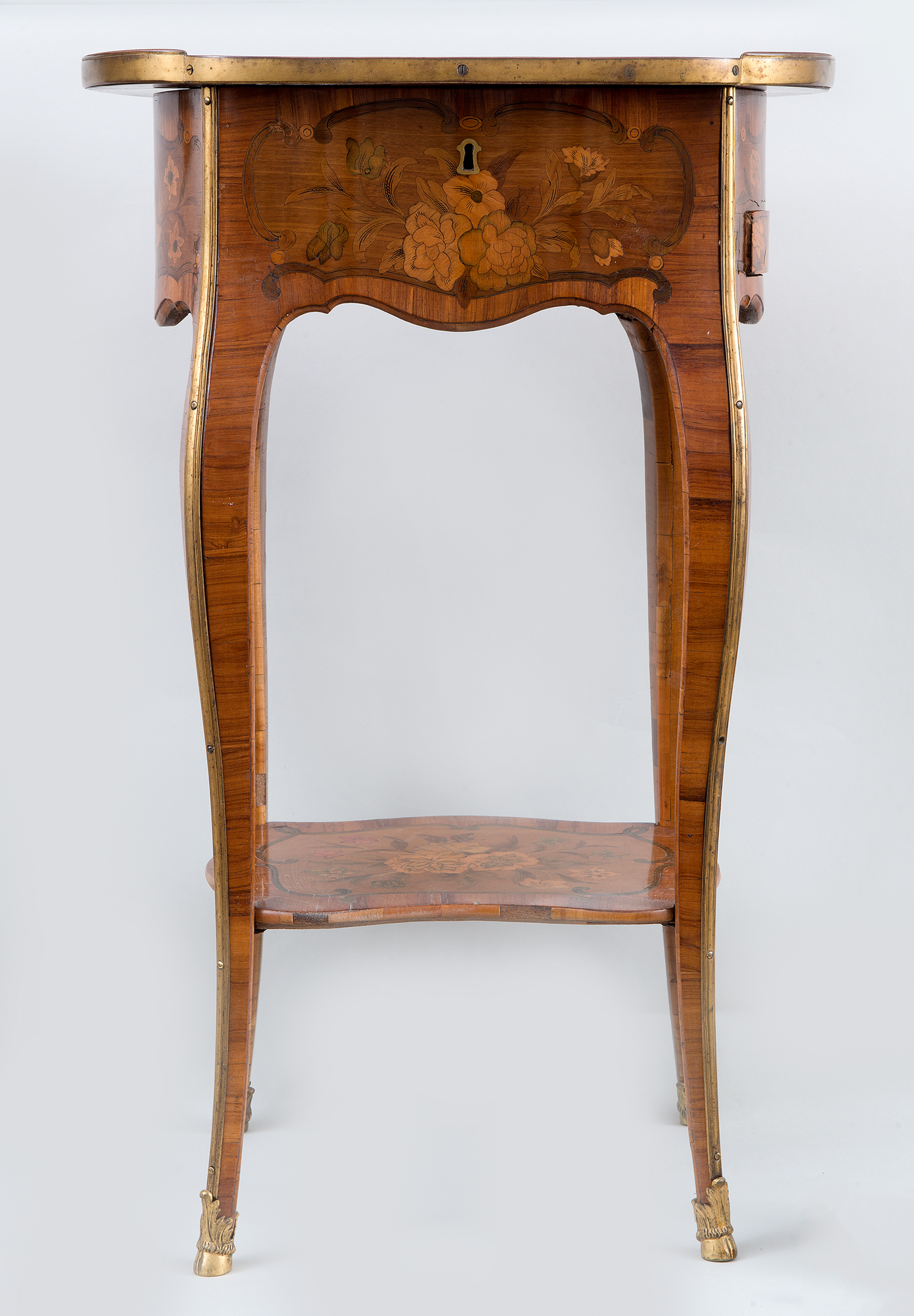 Niewielki stolik podręczny należy do mebli charakterystycznych dla wyrobów paryskich XVIII w. Nazywany był table à écrire - stolikiem do pisania, lub table rognon - stolikiem „nerką”- taką nazwę uzyskał od kształtu blatu zbliżonego do elipsy, z lekko wklęsłą krawędzią frontową. Korpus stolika kształtem dostosowany do blatu wspierają cztery wygięte smukłe nóżki typu cabriole, w 1/3 wysokości połączone półeczką. Podnoszony blat (zamykany na zamek kluczowy) odsłania wnętrze z zestawem niewielkich komór. Mieści się w nim również boczna szufladka.