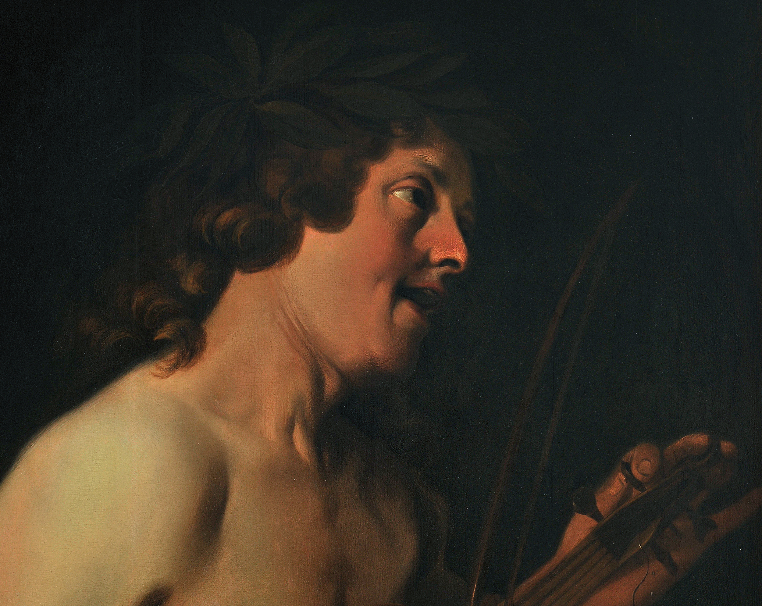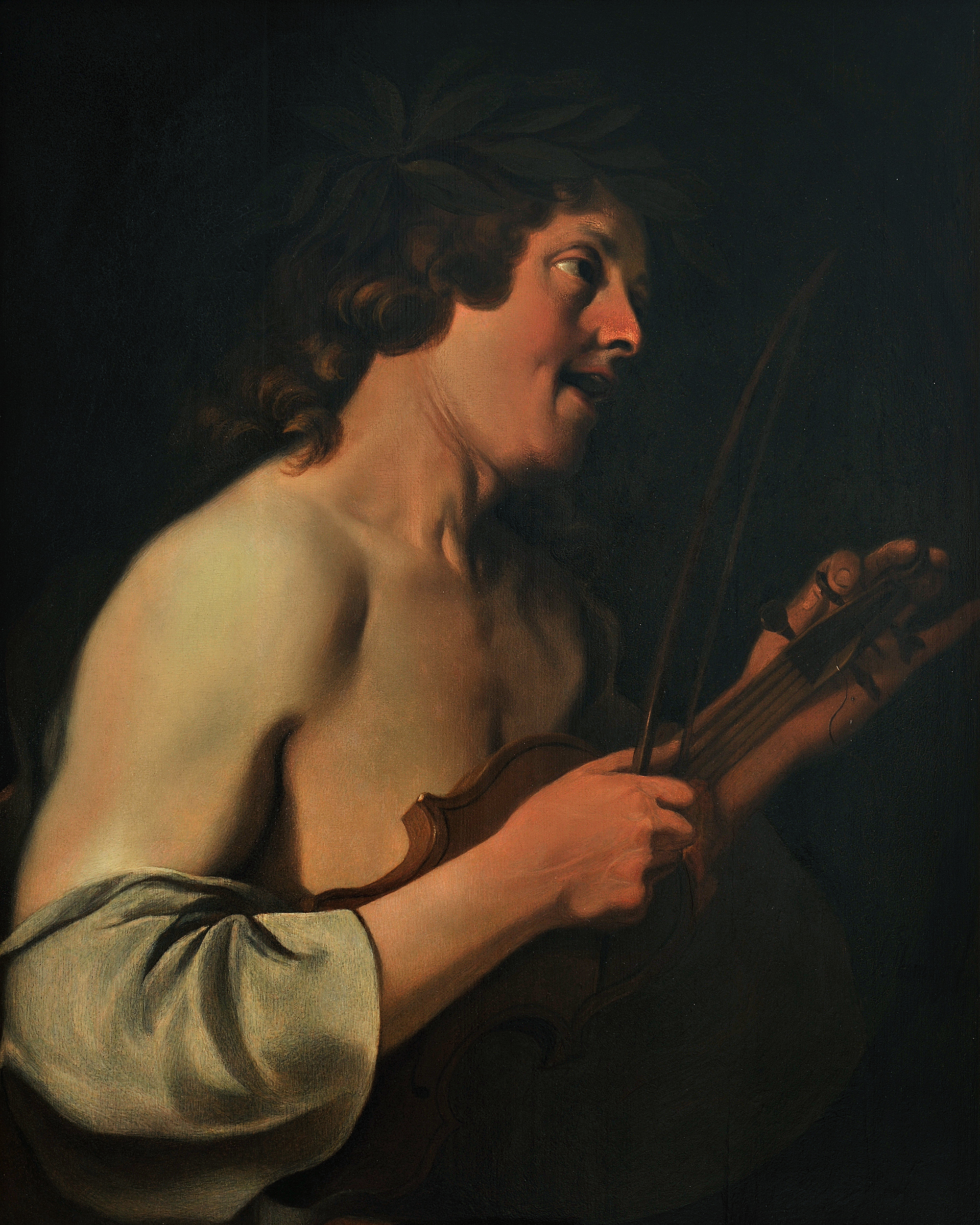 Półpostać zwróconego profilem w prawo młodego, barczystego mężczyzny ucharakteryzowanego na pasterza arkadyjskiego. Jego głowę wieńczy wieniec laurowy, twarz oblewa zdrowy rumieniec. Struktura częściowo obnażonego torsu i ramienia, z którego zsunęła się jasna tkanina płaszcza, o dość sztywno malowanych fałdach, pozwala domyślać się atletycznej sylwetki. Pukle długich włosów spływają na szyję i na ramiona. Prawą ręką trzymającą smyczek szarpie on struny dociśniętego do ciała intrumentu, lewą go dostraja. Jest to lira da braccio. Wzrok kieruje ku górze w poszukiwaniu natchnienia. Tło ciemne, z ciemnymi narożnikami nadającymi przedstawieniu kształt owalu. Czynnikiem konstuującym przestrzeń w obrazie jest skośne, ostre światło, które realistyczne modeluje umięśnione ramię mężczyzny, uwydatnia anatomię torsu. Choć trzyma skrzypce, nie kij pasterski, pastoralna konwencja przedstawienia (niezwykle popularna w szkole utrechckiej w 2. ćwierci XVII w., a później także w kręgach amsterdamskich) pozwala dopatrywać się tu aluzji do pewnego znanego wątku mitologicznego, a mianowicie służby boskiego Febusa u Adneta, w charakterze pasterza.
