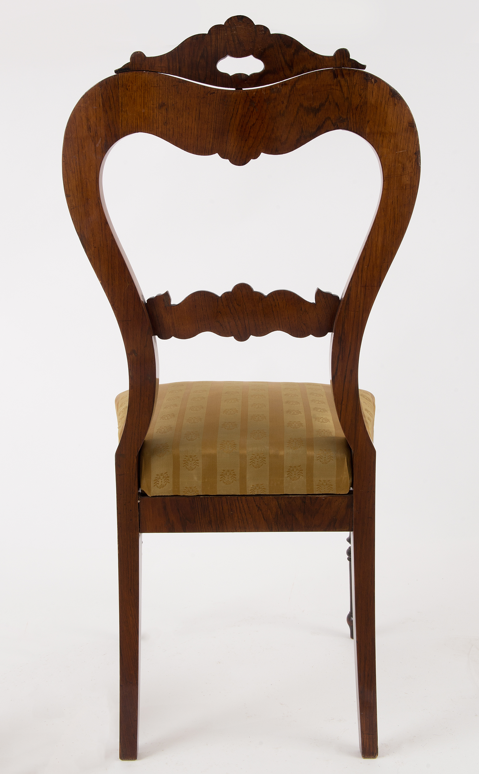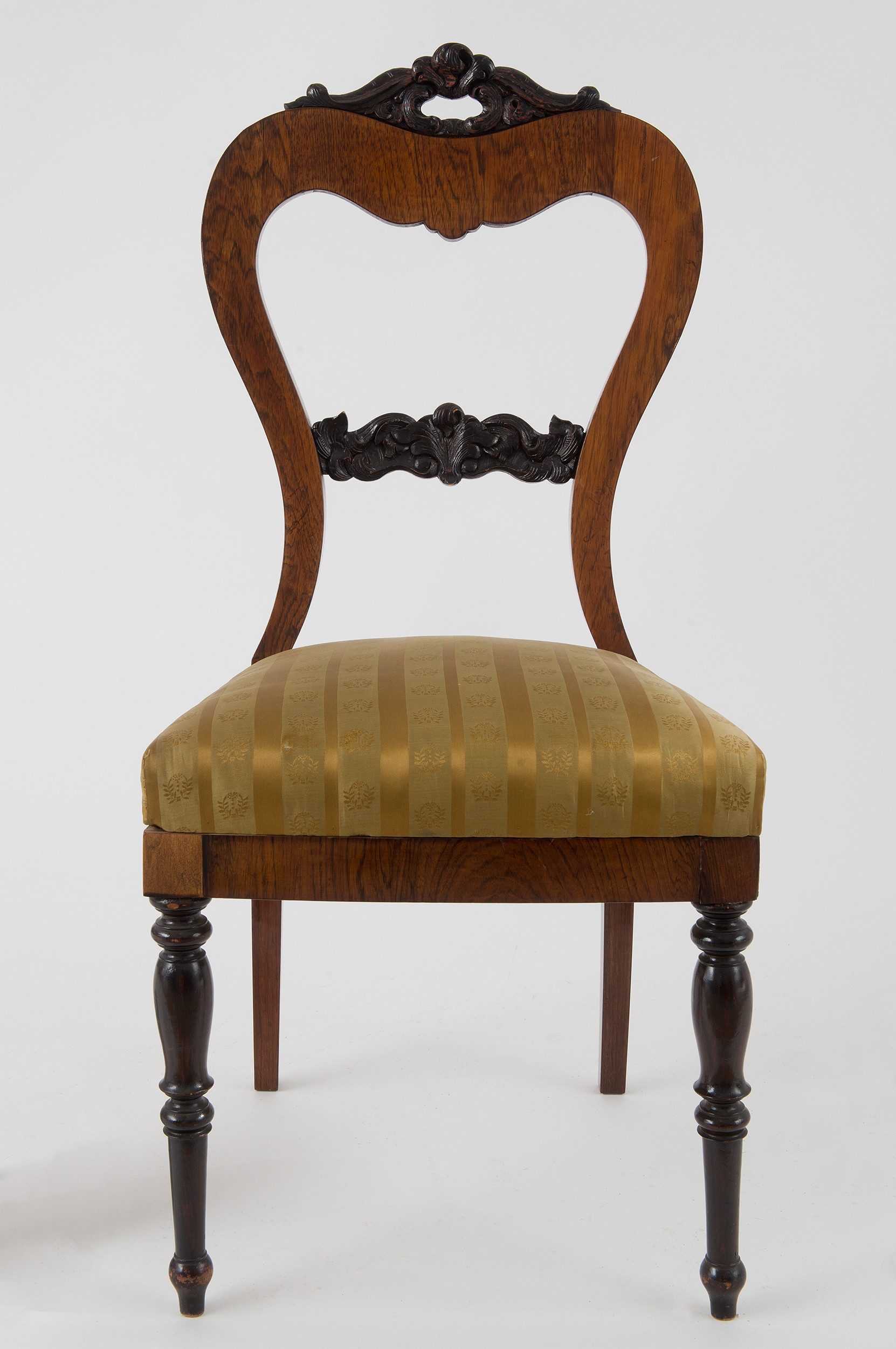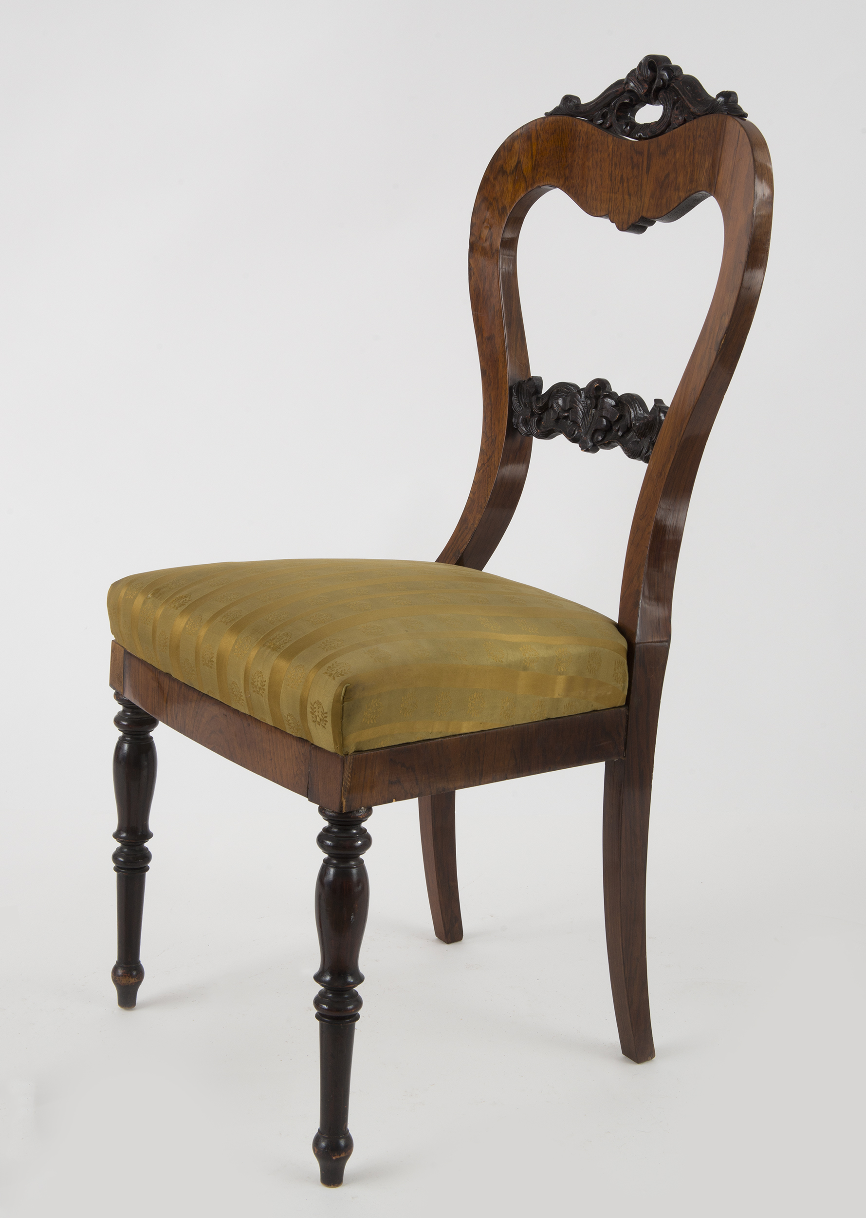 Krzesło o trapezoidalnym siedzisku, na czterech nogach z których przednie są tralkowo toczone, zaś tylne o przekroju kwadratowym, lekko zbieżne, nieco odgięte ku tyłowi, płynnie przechodzą ramiaki boczne oparcia, esowato odchylonego do tyłu. Oparcie ażurowe o kształcie balonowym, szersze u góry, w dolnej partii przewężone i związane rzeźbioną łączyną o motywach roślinnych. Szerokiego ramiak górny z wyraźnym ugięciem, od dołu ozdobnie podkrojonym, od góry ozdobiony ażurowym rzeźbionym zwieńczeniem o motywach roślinno-muszlowych. Ramiaki boczne oparcia zwężające się ku dołowi, tuż nad siedziskiem przełamane, poniżej przełamania przechodzące w tylne nogi. Okrzynienie proste. Ramiaki oparcia, oskrzynienie oraz tylne nogi pokryte fornirem palisandrowym, przednie nogi oraz elementy rzeźbione lakierowane, w kolorze ciemnobrązowym. Siedzisko tapicerowane, obite złotym adamaszkiem w parzyste kremowe pasy pokryte deseniem z wieńców laurowych.