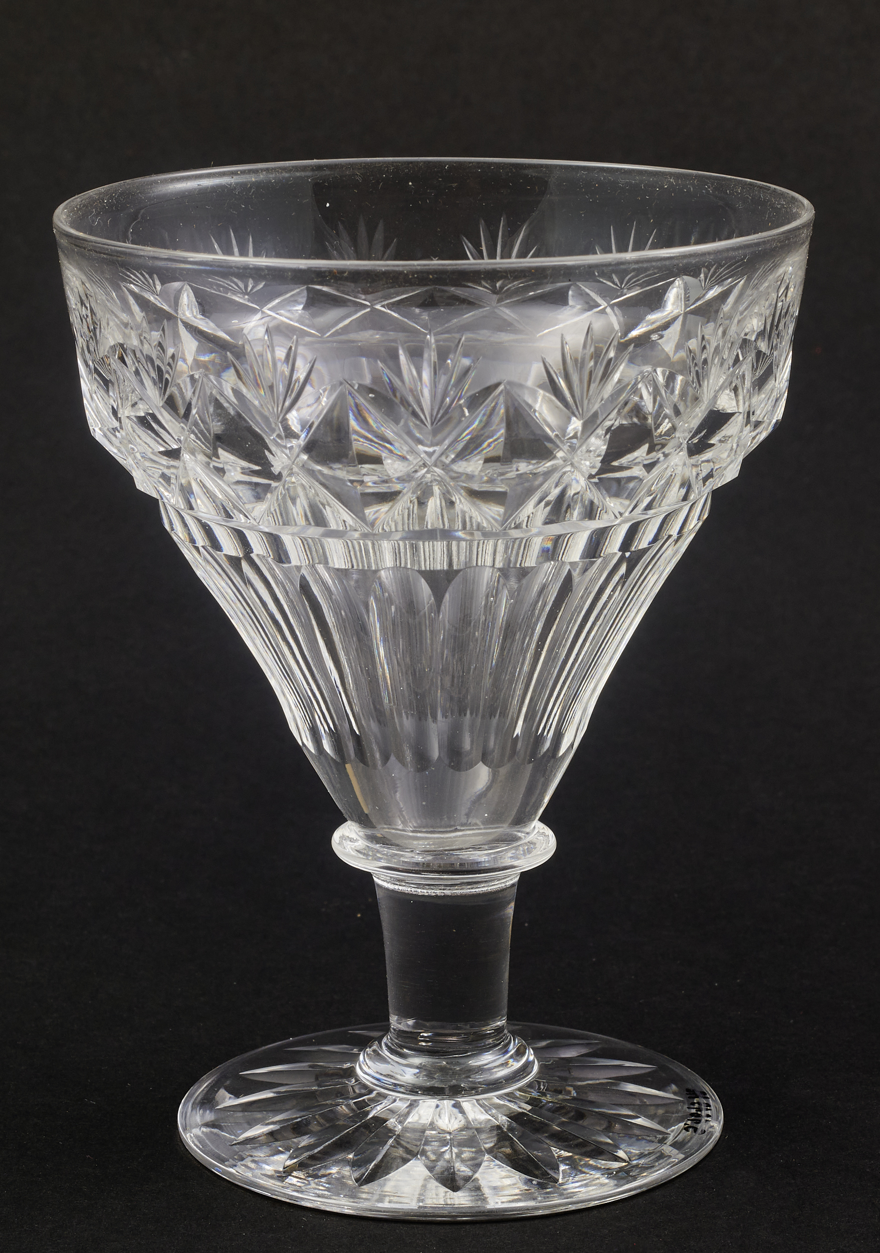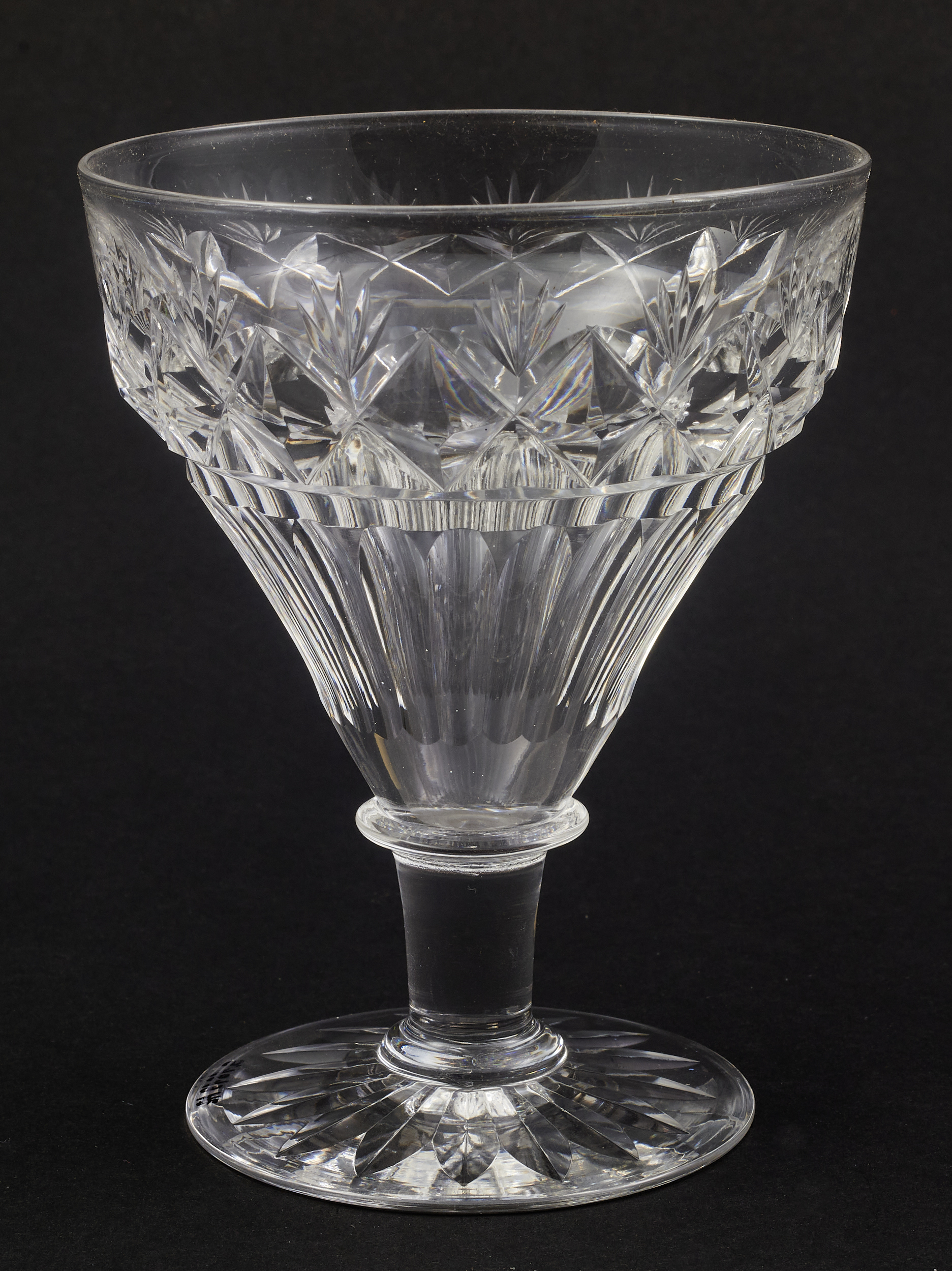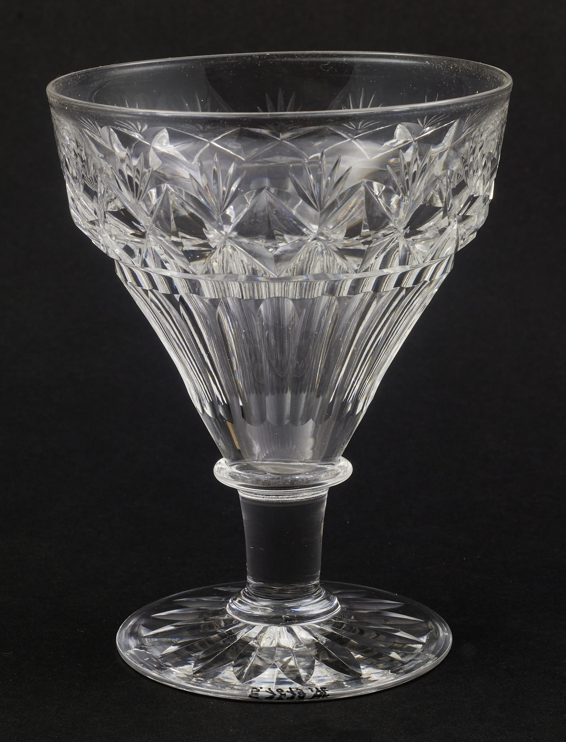 Kieliszek duży, wykonano ze szkła kryształowego. W zbiorach łańcuckich znajduje się także jeszcze pięć takich kieliszków. Zostały wykonane na przełomie XIX-XX wieku w Anglii, w stylu secesyjnym.