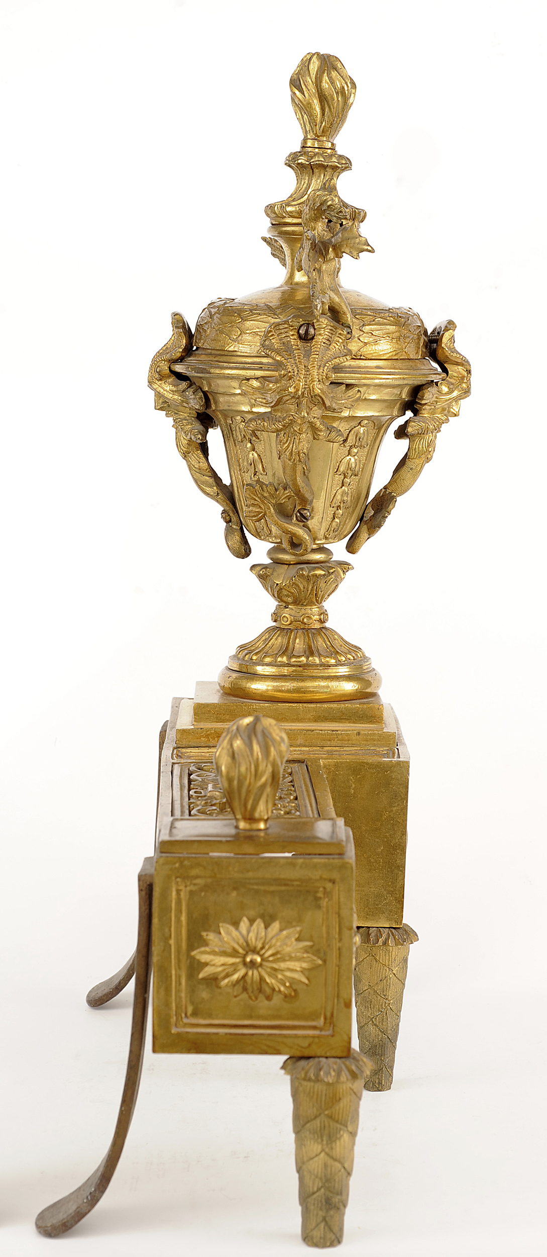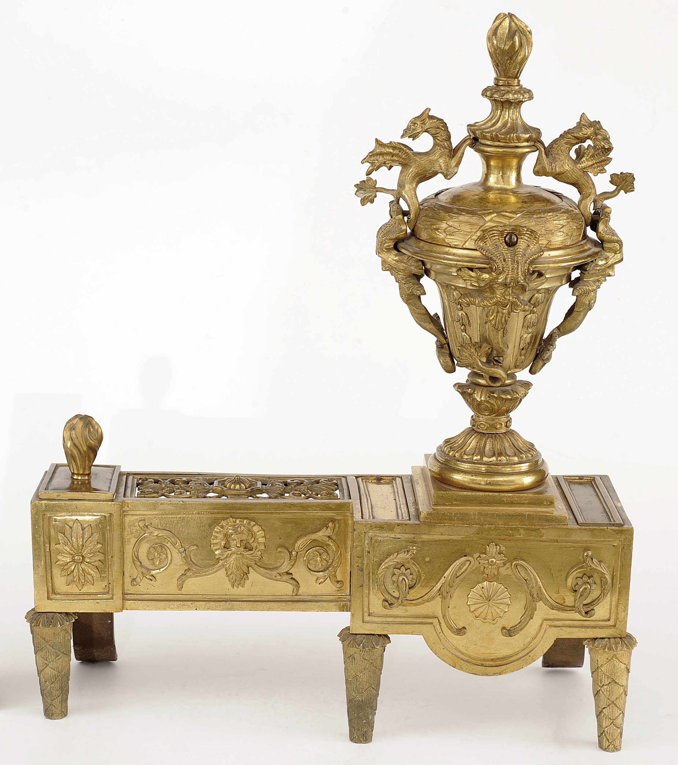 Dekoracyjny wilk kominkowy z brązu złoconego, o części tylnej w formie prostopadłościennej belki bez ścianki tylnej i dolnej. Ściana przednia ozdobiona płaskorzeźbioną dekoracją o motywach wici roślinnych rozdzielonych maską a górna ażurowa, w motywy roślinne. Całość z tyłu zakończona kostką, opartą na dwóch nogach z blachy i zwieńczoną u góry niewielką sterczyną w formie płomienia a z przodu i z boku ozdobioną owalnymi rozetami. Część przednia w formie spłaszczonej kostki od przodu wspartej na dwóch nóżkach pokrytych łuską, opatrzonej na przedniej ściance półkolistym fartuszkiem oraz dekoracją z motywem pary wici roślinnych i rozety. Ściana górna stanowi profilowany cokół dla wydatnej sterczyny w formie pełnoplastycznej wazy z pokrywą zwieńczoną płomieniem, ujętej w parę gryfów wyłaniających się z roślinnych pędów.