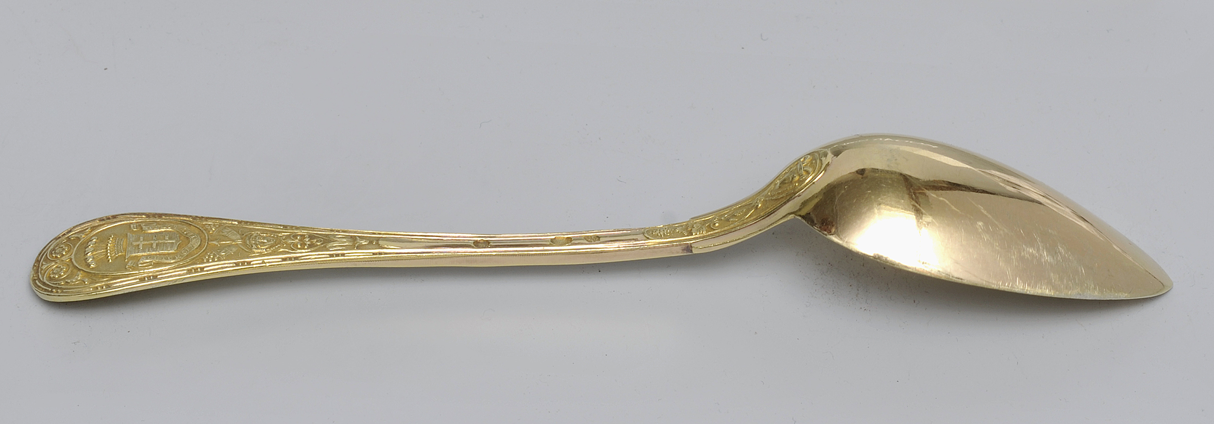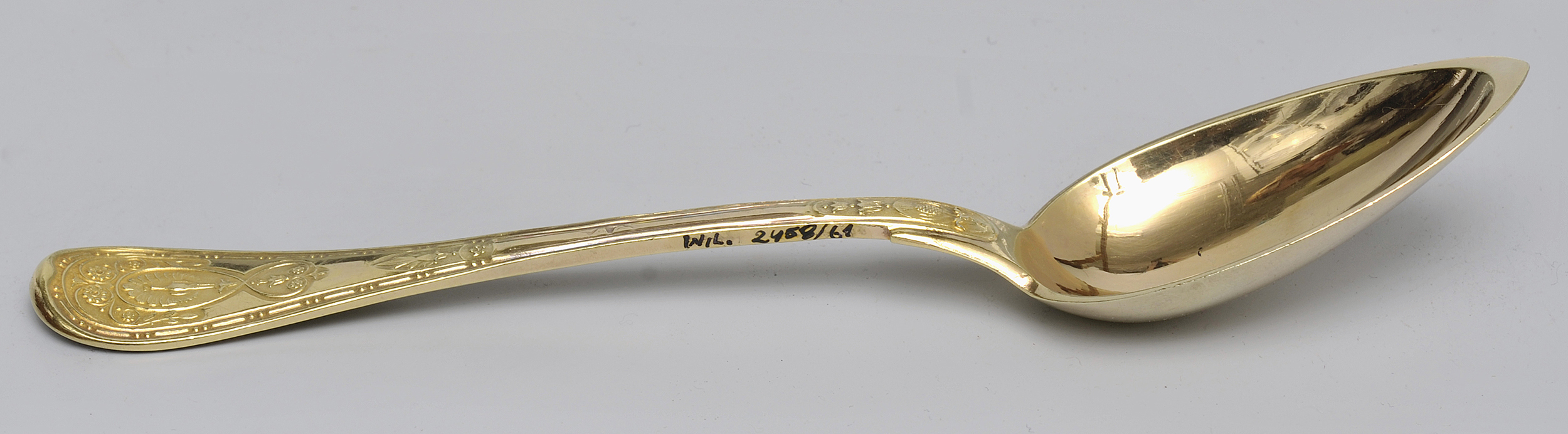 Łyżka deserowa o wydłużonym owalnym czerpaku jest jedną z siedemdziesięciu dwóch łyżek zachowanych w wilanowskiej kolekcji.