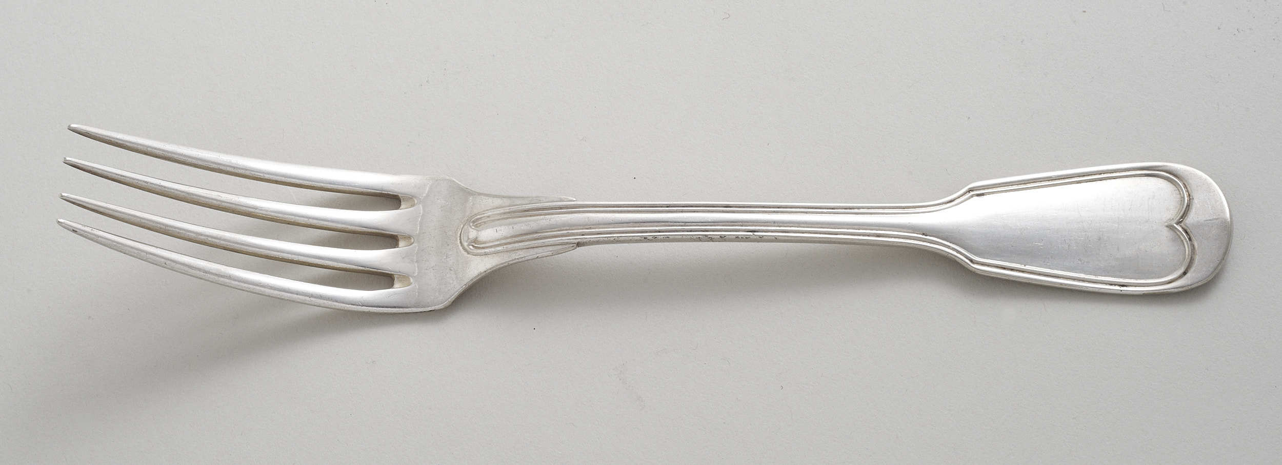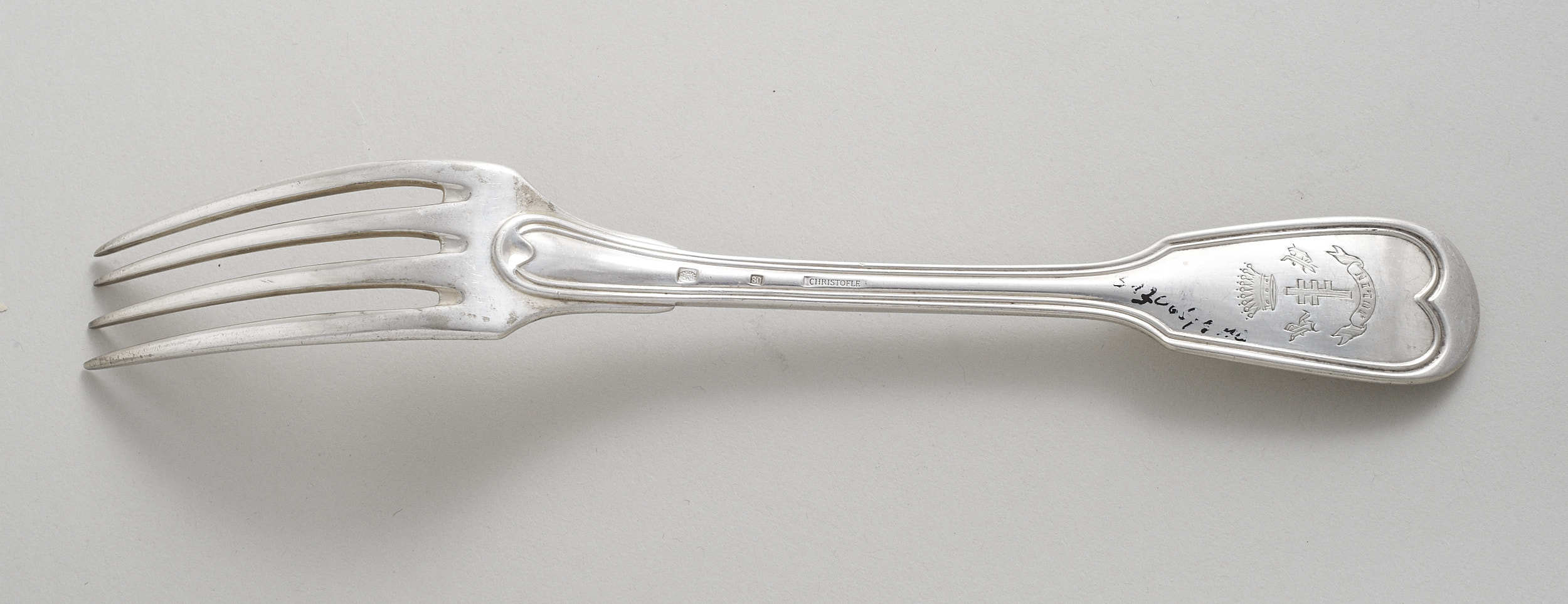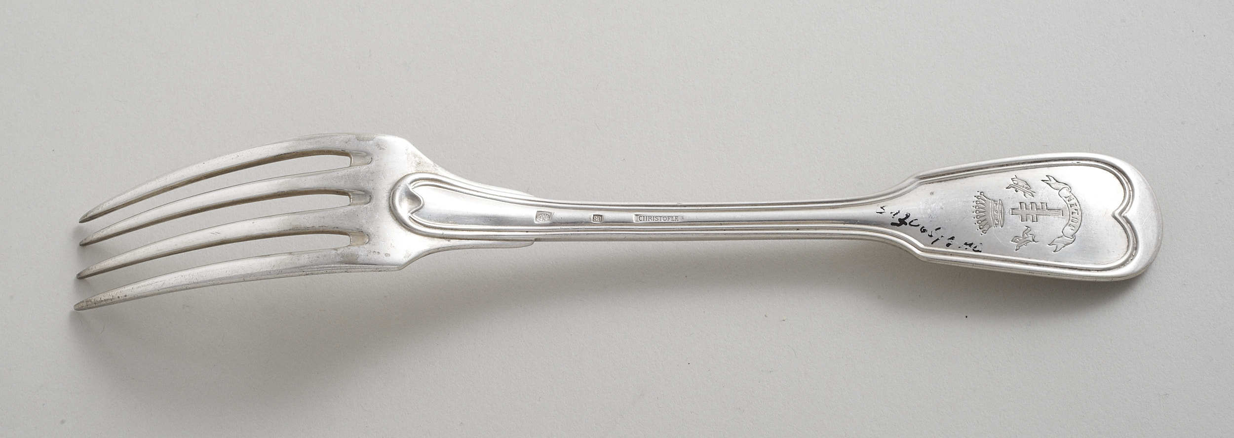 Czterozębny widelec stołowy posiada płaski trzonek z rozszerzonym zakończeniem ozdobiony podwójnym profilowaniem. Na rewersie w dolnej części trzonka widoczna jest korona hrabiowska a pod nią herb Potockich - Pilawa. Po bokach symetrycznie rozmieszczone litery R i P a pod herbem widoczna szarfa z napisem „Julin”. Ponadto na przewężeniu trzonka, od spodu wybito punce i stempel producenta „Christofle”.