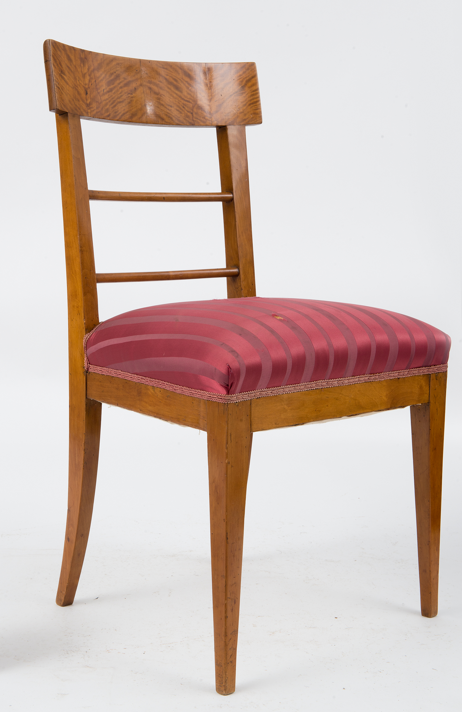 Krzesło o trapezoidalnym siedzisku, na czterech nogach o przekroju kwadratowym, lekko zbieżnych, nieco odgiętych ku tyłowi, płynnie przechodzących w ramiaki boczne oparcia, lekko odchylonego do tyłu. Oparcie ażurowe lekko łukowato wygięte, od tyłu o zaokrąglonych kantach. Szeroki ramiak górny wystający poza ramiaki boczne, poniżej dwie wąskie poziome łączyny w formie półwałka, wpuszczone w ramiaki boczne. Oskrzynienie proste, gładkie. Całość konstrukcji pokryta jasnym fornirem. Siedzisko tapicerowane, obite malinowym adamaszkiem w gładkie pasy naprzemiennie wąskie i szerokie.