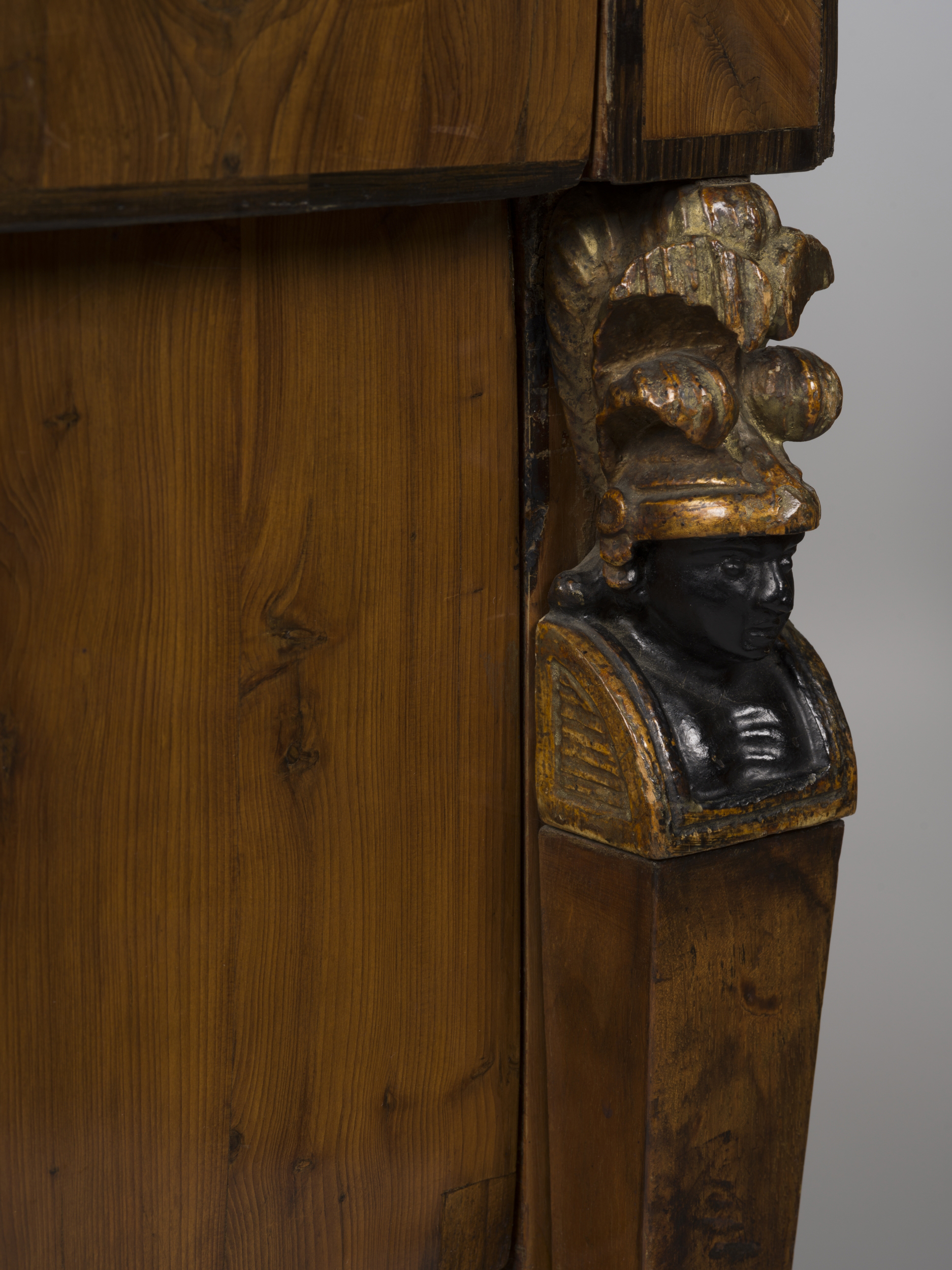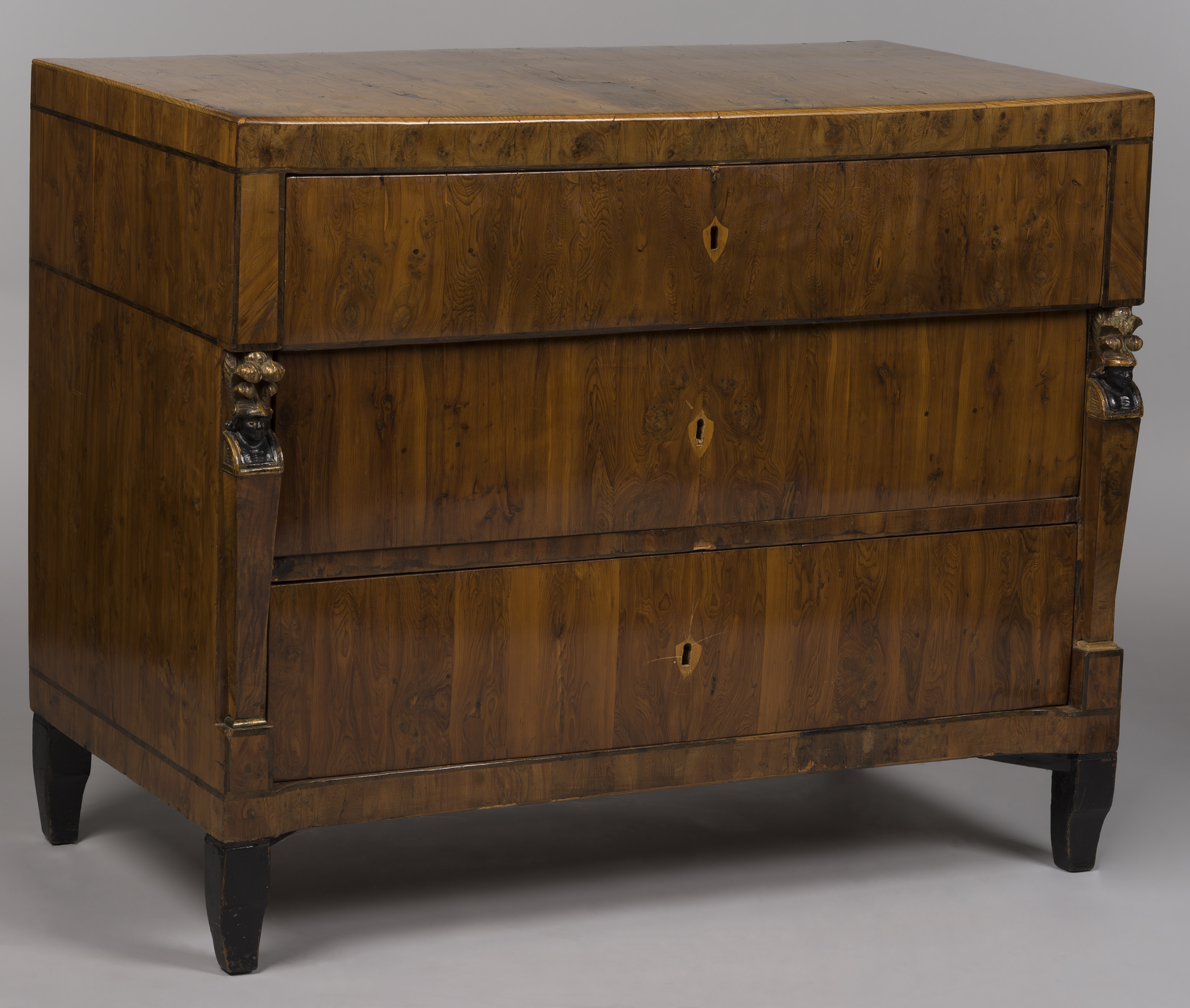 Prostopadłościenna komoda o trzech szufladach, z których dolne są nieco cofnięte wobec górnej, kompozycyjnie włączonej w cargę. Blat jest zlicowany z korpusem, podobnie jak cokół u dołu. Carga w przednich narożach zostałą wsparta na dwóch smukłych hermach o kobiecych głowach w ozdobionymi pióropuszami szyszakach. Dół herm spoczywa na wysokich postumentach ustawionych na falistych występach cokołu. Nogi o przekroju kwadratu, zbieżne, u nasady podwyższone o kwadratową kostkę, z przodu łukowato podebrane.