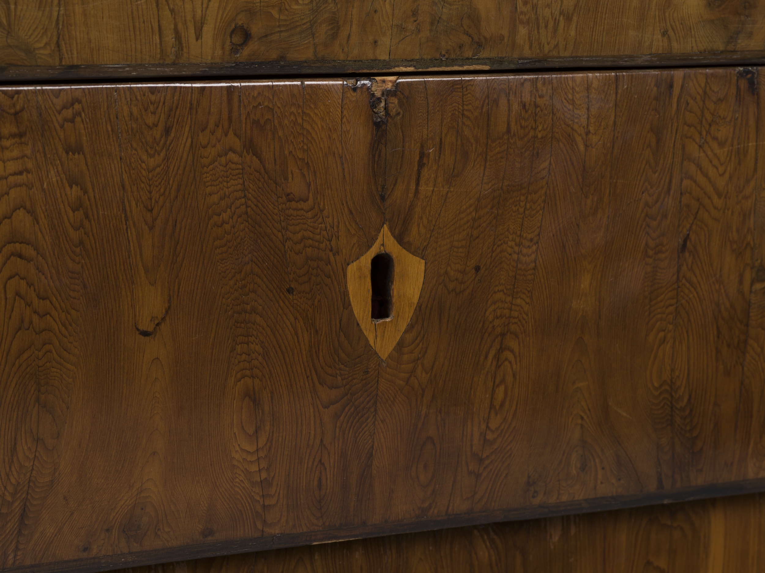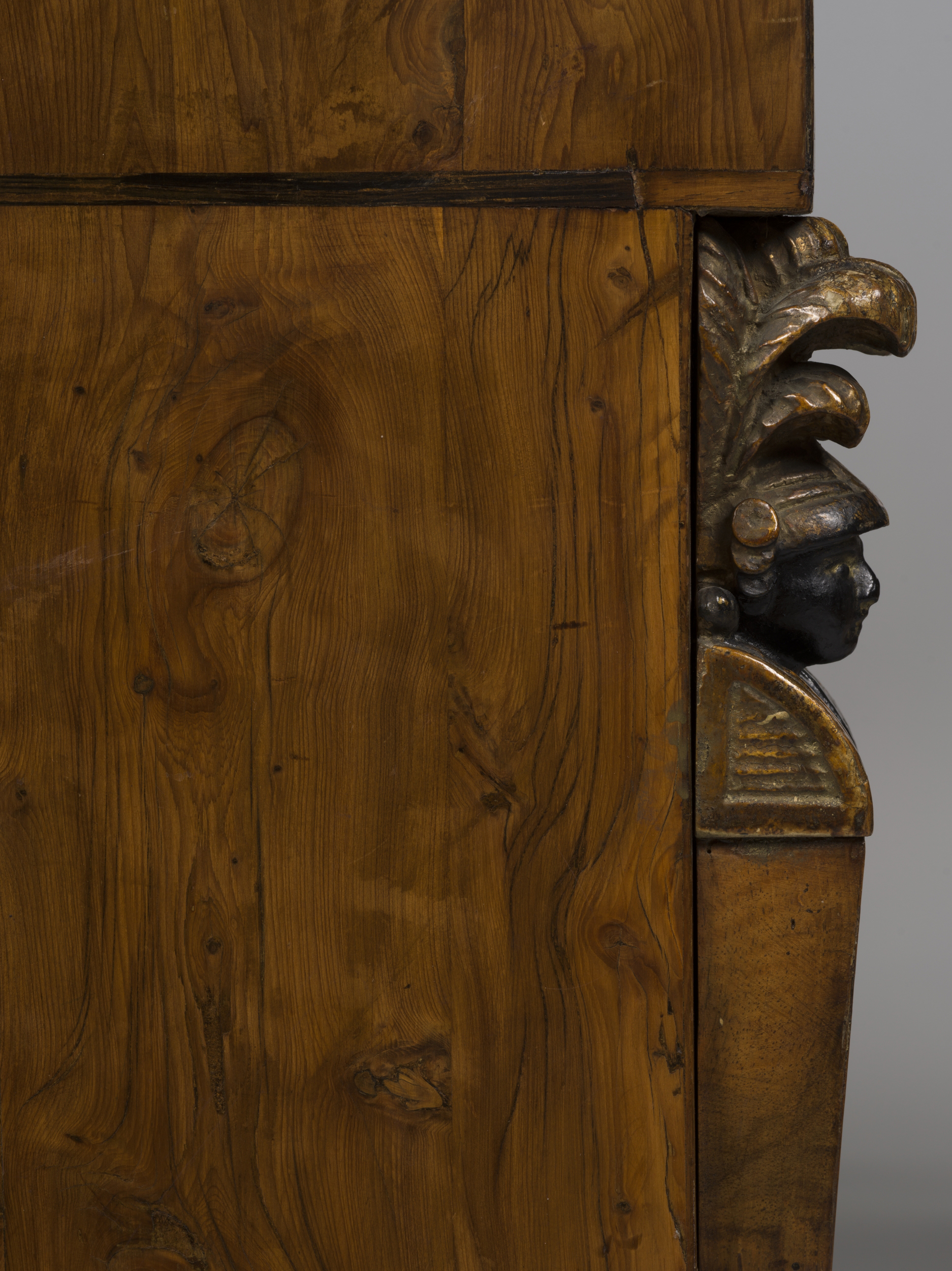 Lica szuflad opatrzone zostały pośrodku kluczynami od zamków, o szyldach w formie intarsjowanych wąskich tarcz z jasnego forniru. Wąskie paski ciemniejszego forniru zaznaczają poszczególne części kompozycyjne komody: blat, cargę, płycinę i niski cokół u dołu.