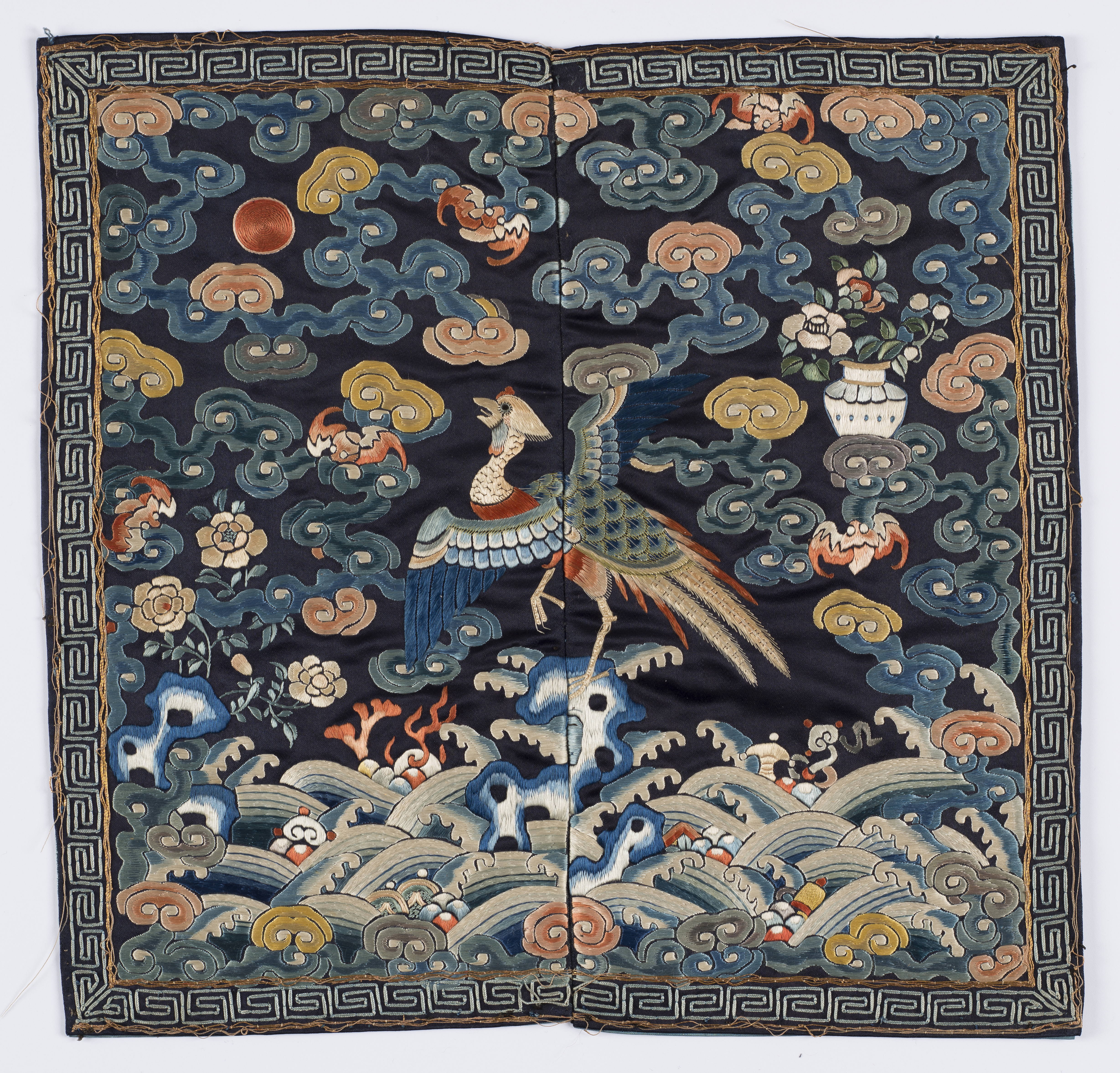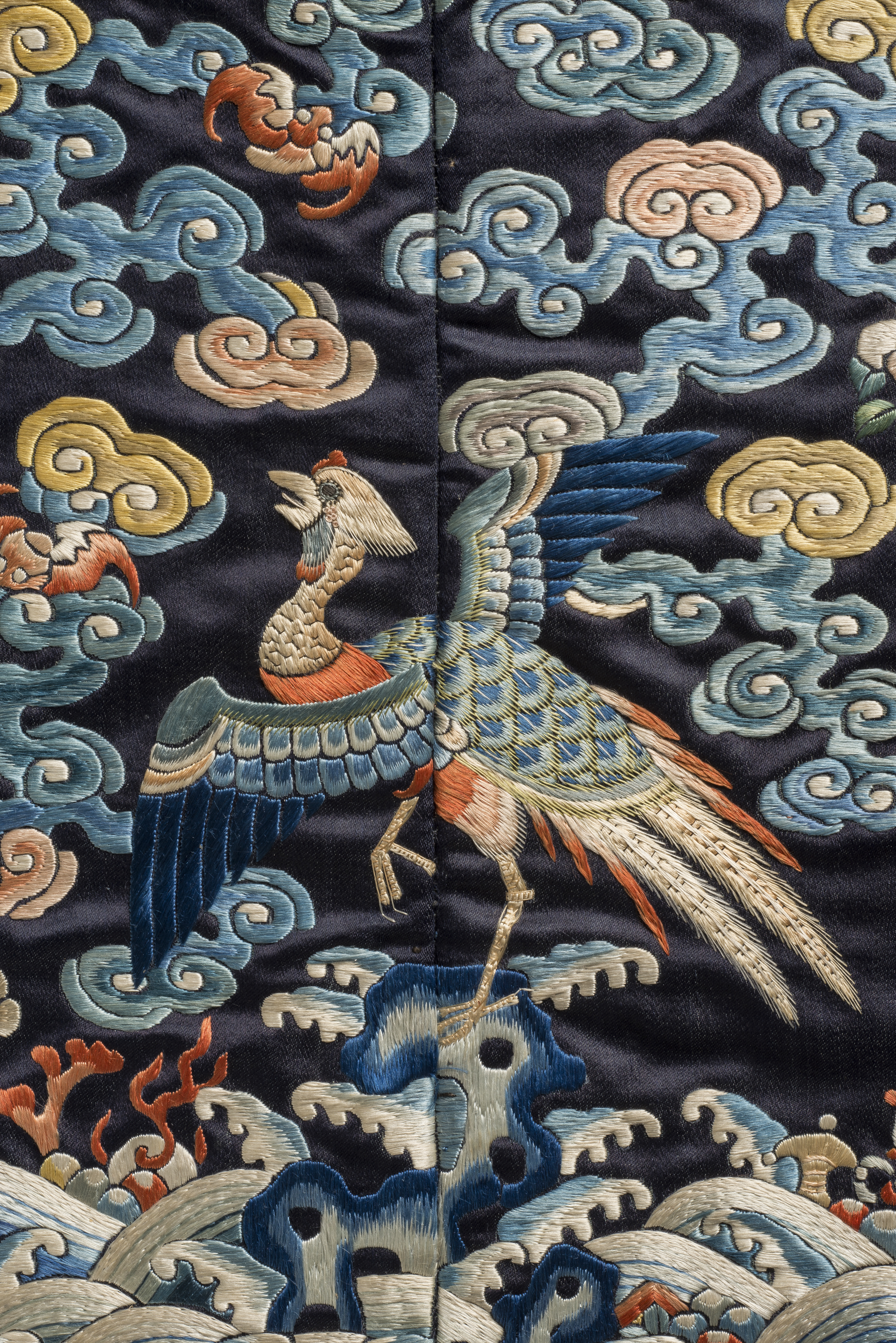 Emblemat przeznaczony na przód kaftana. Kwadrat z granatowego jedwabiu, haftowany jedwabnymi nićmi, z wizerunkiem bażanta złocistego.
