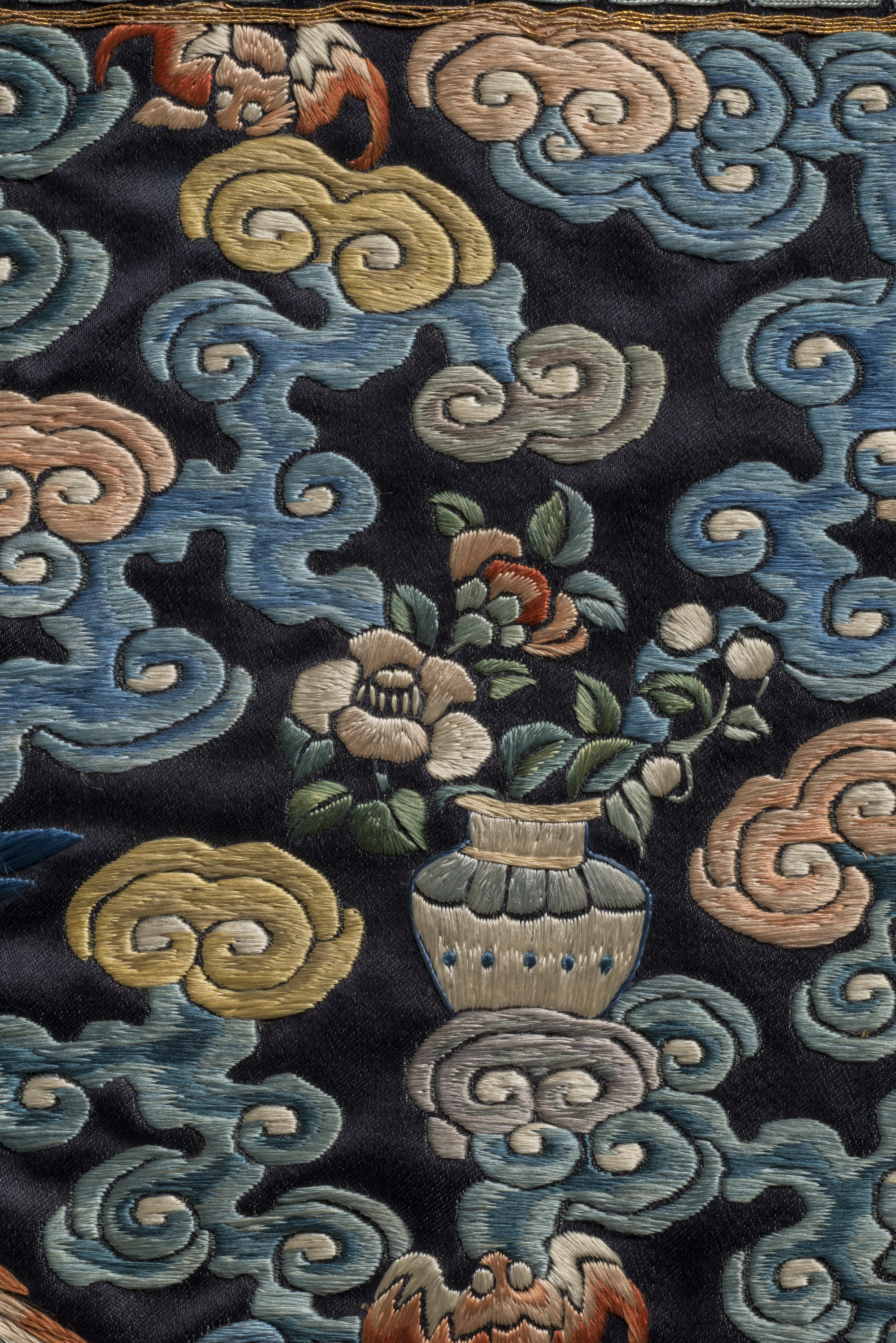 Przedstawienie na emblemacie stało się bardziej dekoracyjne. Tło jest ornamentalne z motywem Ośmiu Drogocenności, którym towarzyszą nietoperze, symbole szczęścia i długowieczności. Pojawiają się rośliny przynoszące szczęście, jak święte grzyby lingzhi.
