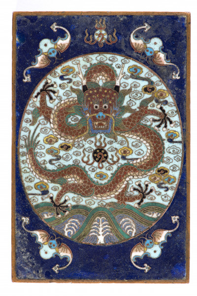 Smok, który uosabiał w Chinach władzę cesarską, został tutaj ukazany podobnie jak smoki umieszczane na szatach urzędniczych. Na plakiecie przedstawione zostało schematycznie uniwersum: od fal wody u dołu do nieba z chmurami (brakuje jedynie pierwiastka ziemskiego – czyli skał). Smokowi unoszącemu się nad falami, wśród chmur, z płonącą perłą towarzyszą cztery nietoperze, które były uważane w chińskiej kulturze za symbol szczęścia. Ideogram oznaczający nietoperza, odczytany, brzmi w języku chińskim tak samo jak słowo „szczęście”. Pięć nietoperzy oznacza pięć błogosławieństw: dożycia późnego wieku, bogactwa, zdrowia, umiłowania cnót i naturalnej śmierci.