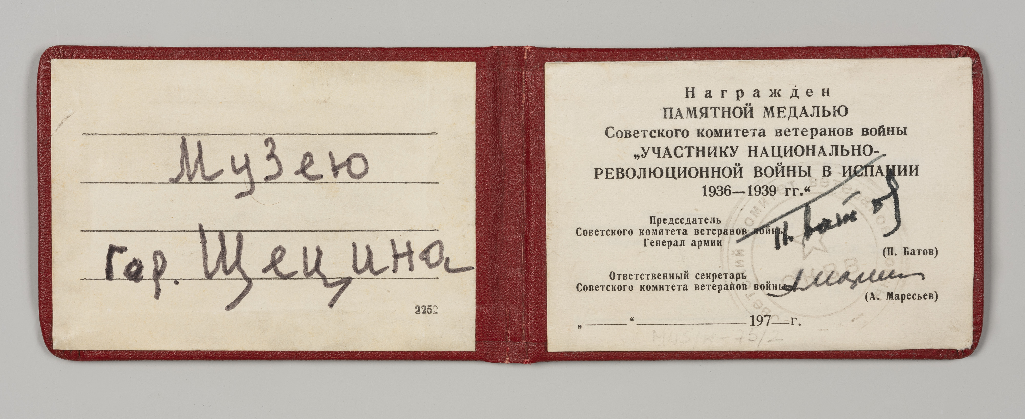 Za swoje zasługi w czasie wojny domowej w Hiszpanii został wyróżniony medalem Uczestnika Wojny Narodowo-Rewolucyjnej w Hiszpanii 1936-1939, nadawanym przez Radziecki Komitet Weteranów Wojny. W 1976 roku, generał Batow przekazał w darze kolekcję swoich pamiątek, wraz z tym wyjątkowym medalem (MNS/H/75/1) Muzeum Narodowemu w Szczecinie. W towarzyszącej odznaczeniu legitymacji, znaku autentyczności i pamięci, umieścił dedykację stanowiącą wyraz uznania wobec instytucji kultury i historii.