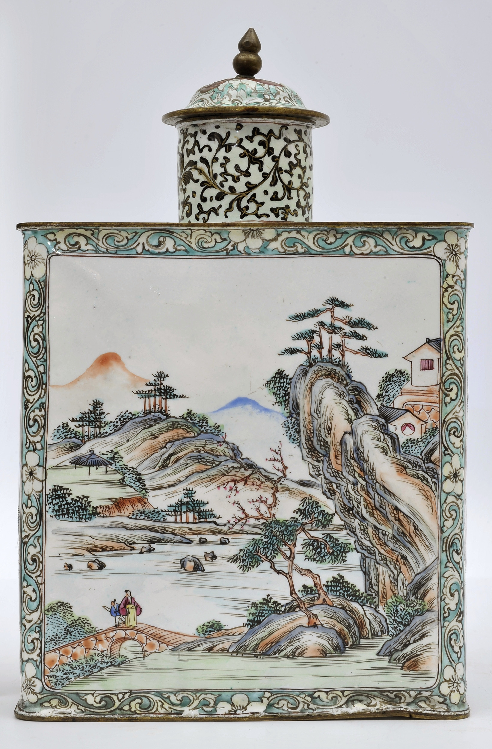 Miedziane czworoboczne naczynie z cylindryczną, wysklepioną pokrywą zwieńczoną dwudzielną gałeczką. Brzusiec naczynia zdobią cztery rozległe rezerwy, czyli pola wyodrębnione krawędzią, wypełnione dekoracją. Wszystkie rezerwy prezentują sceny przedstawiające typowe chińskie krajobrazy – z wysokimi górami, z drzewami, skałami, z akwenami wodnymi, z elementami architektury, i majaczącymi drobnymi postaciami ludzkimi. Pozostała powierzchnia została pokryta gęstymi, mocno stylizowanymi wiciami roślinnymi. Cylindryczna pokrywka została ozdobiona ornamentem nawiązującymi do bordiur obiegających rezerwy.