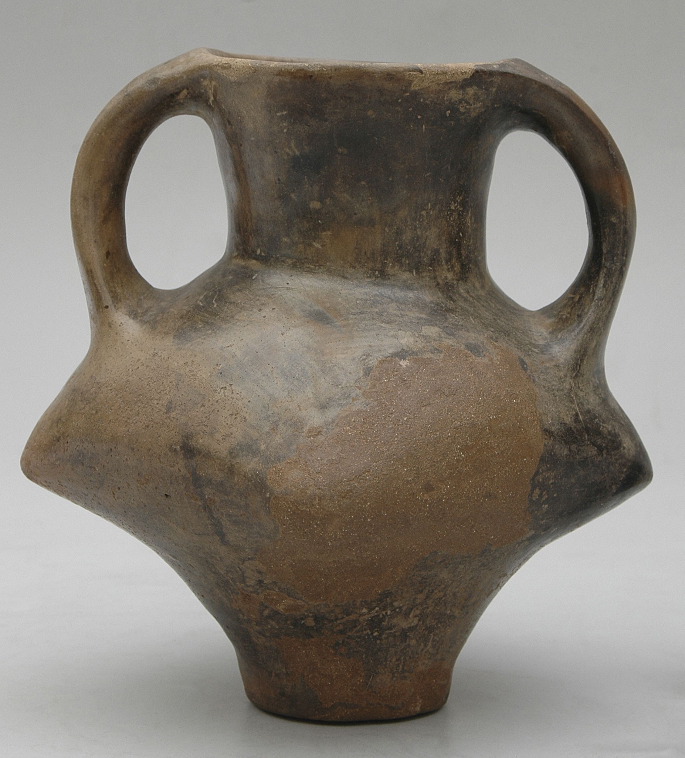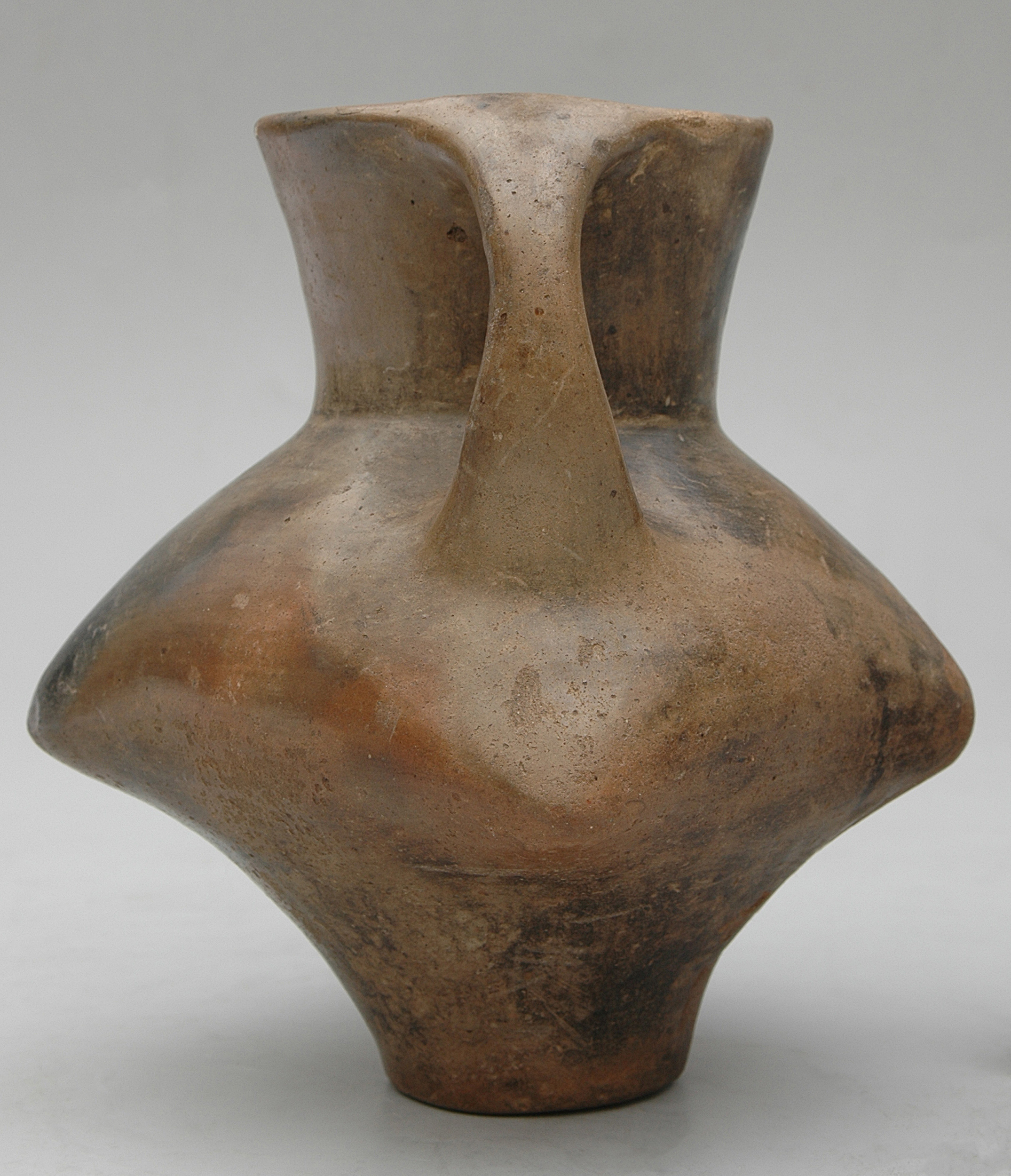 Niewielka amforka o nietypowym kształcie. Górna część brzuśca ma profil lekko wklęsły, a dolna partia wraz z ramionami profil lekko wypukły. Szyjka naczynia rozszerza się ku górze. Po bokach umieszczono dwa grube uchwyty, wstęgowe, przewężone w środku. Powierzchnia w o niejednolitym kolorze, w odcieniach brązu.