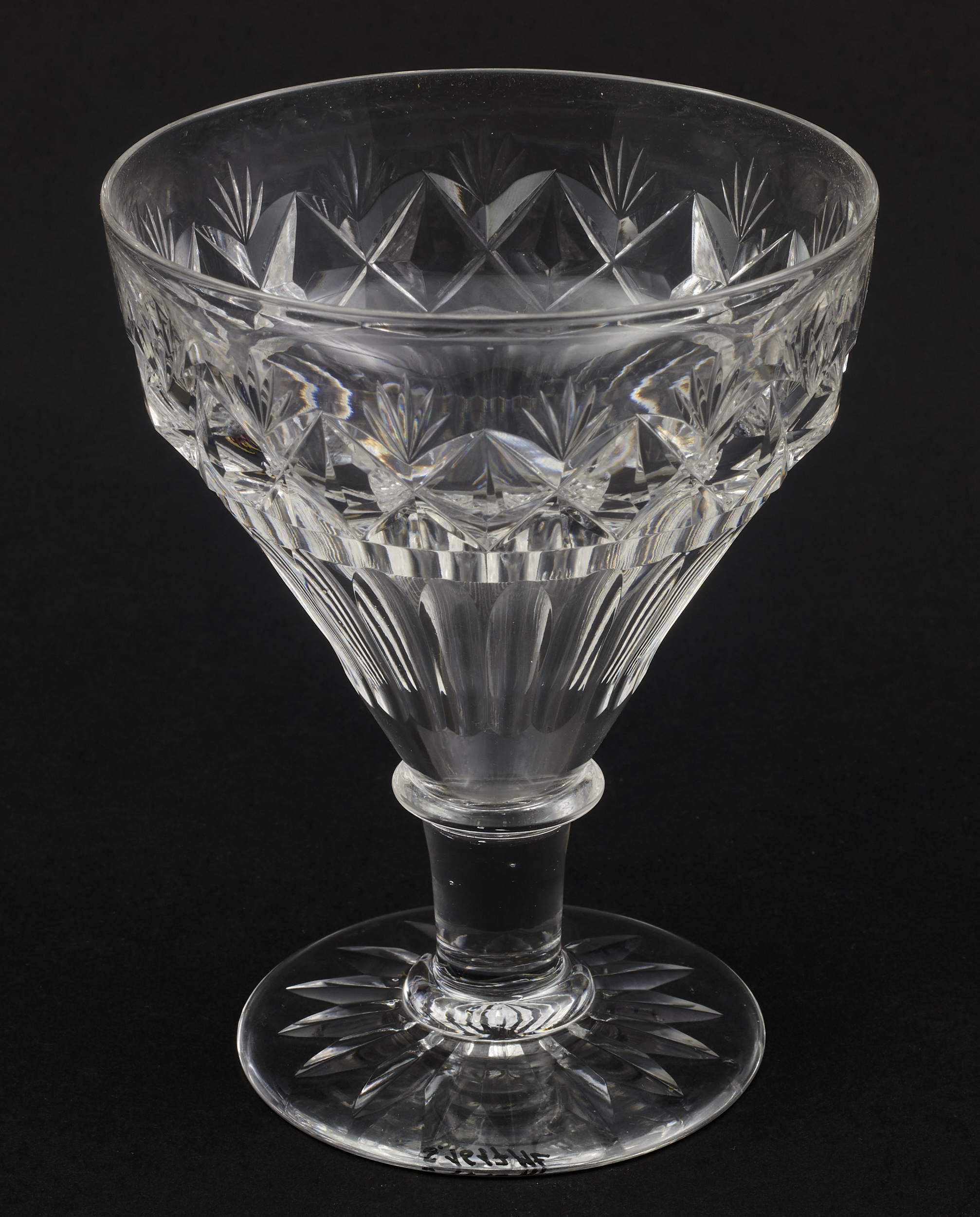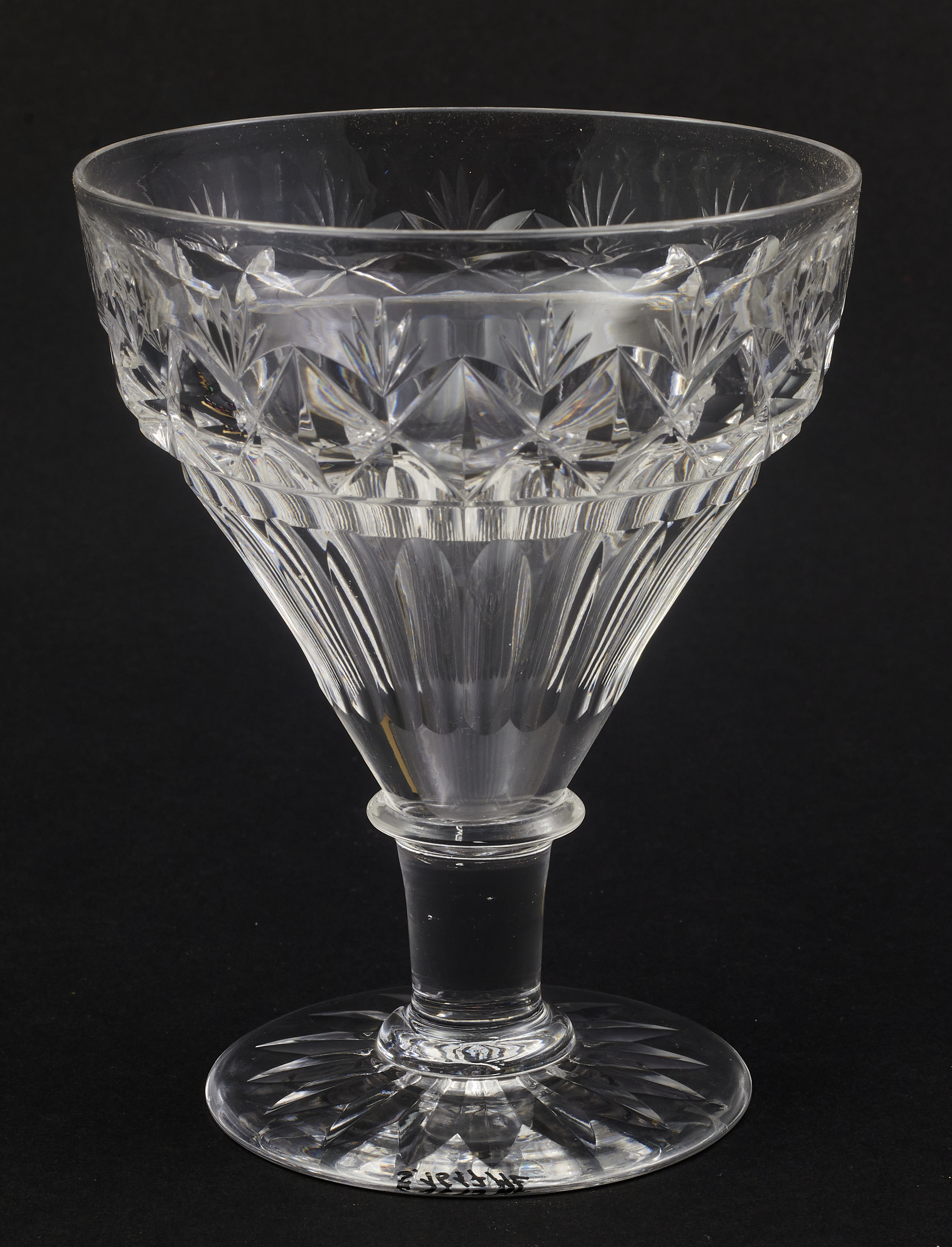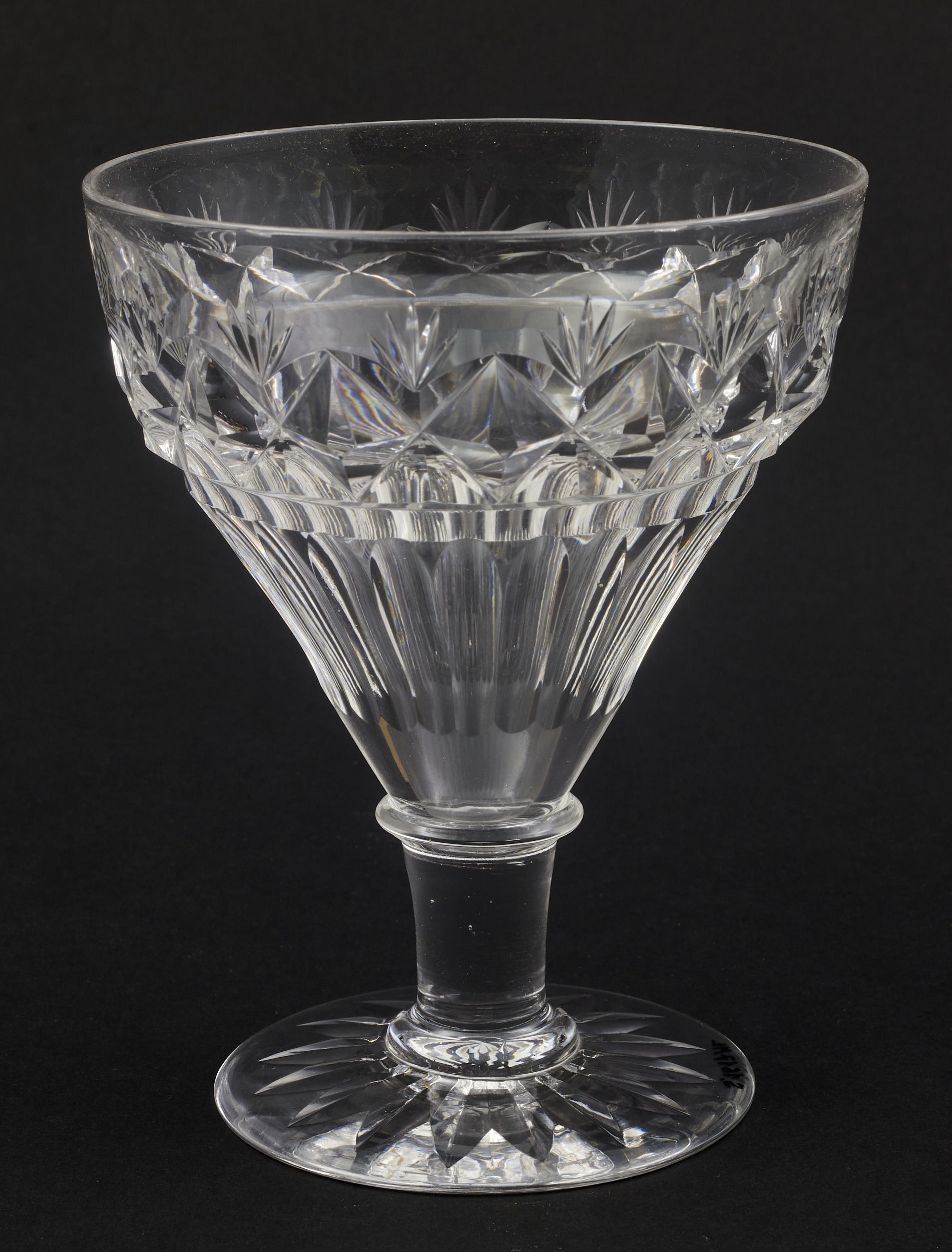 Kieliszek duży, wykonano ze szkła kryształowego. W zbiorach łańcuckich znajduje się także jeszcze pięć takich kieliszków. Zostały wykonane na przełomie XIX-XX wieku w Anglii, w stylu secesyjnym.