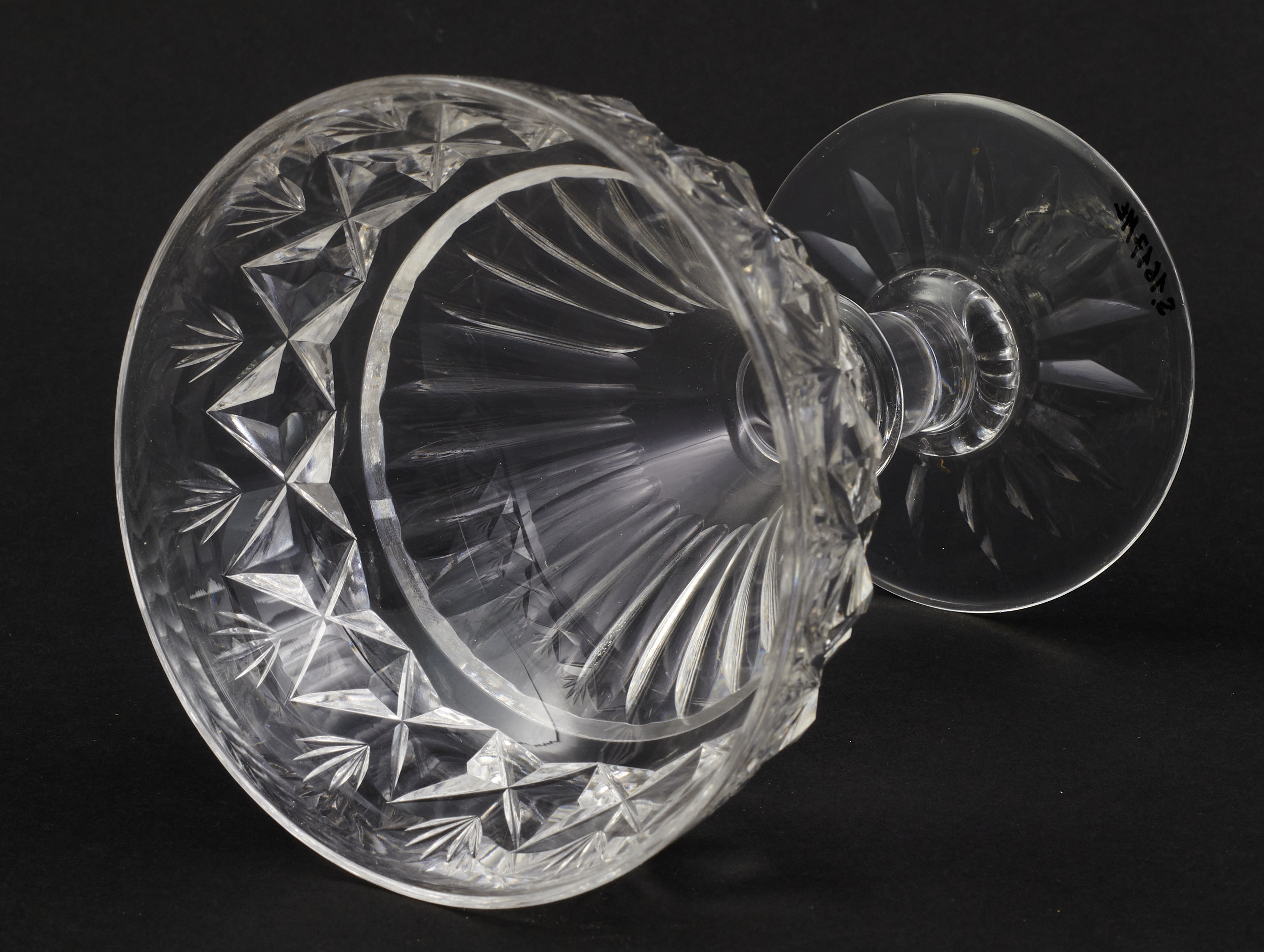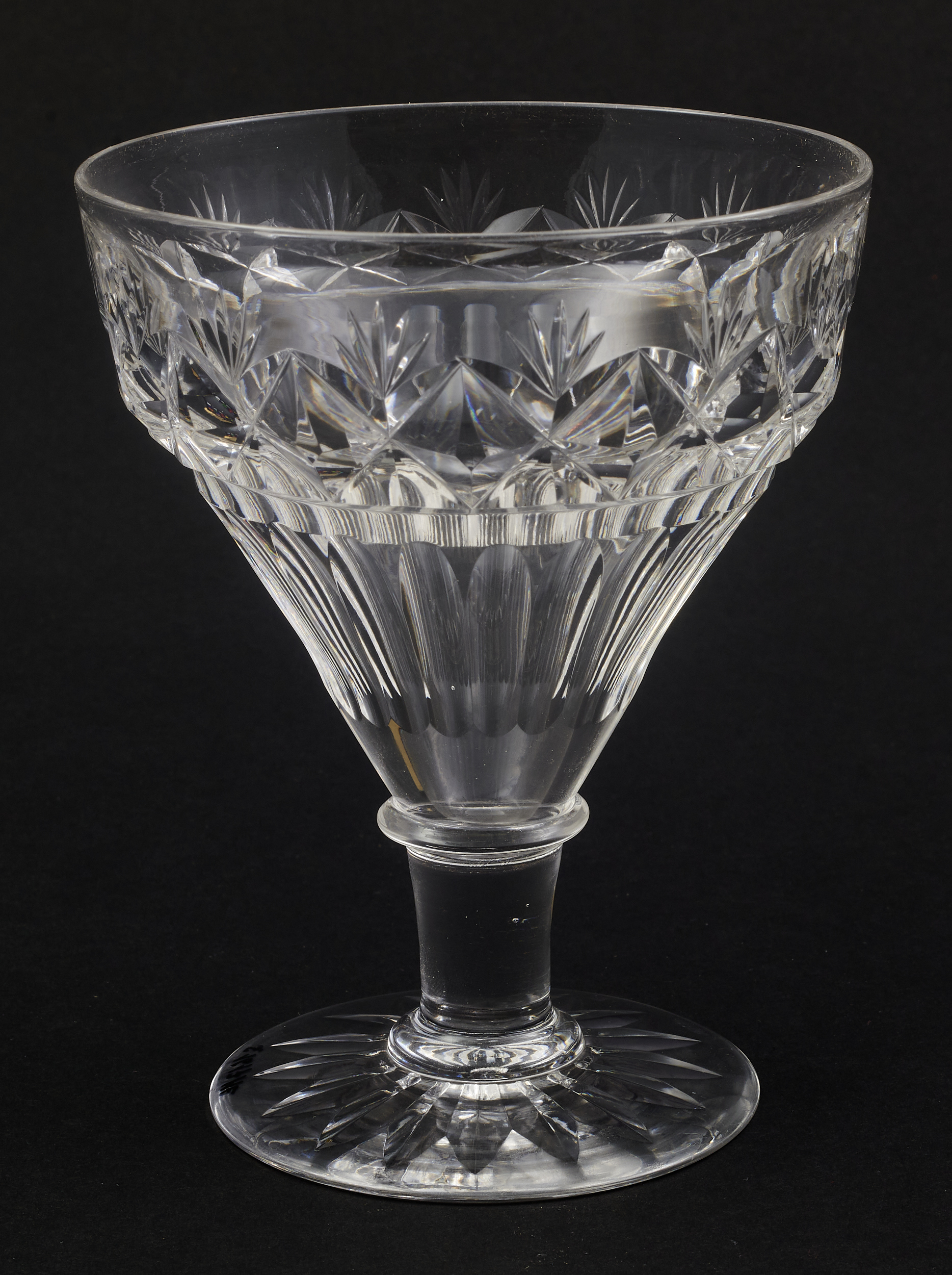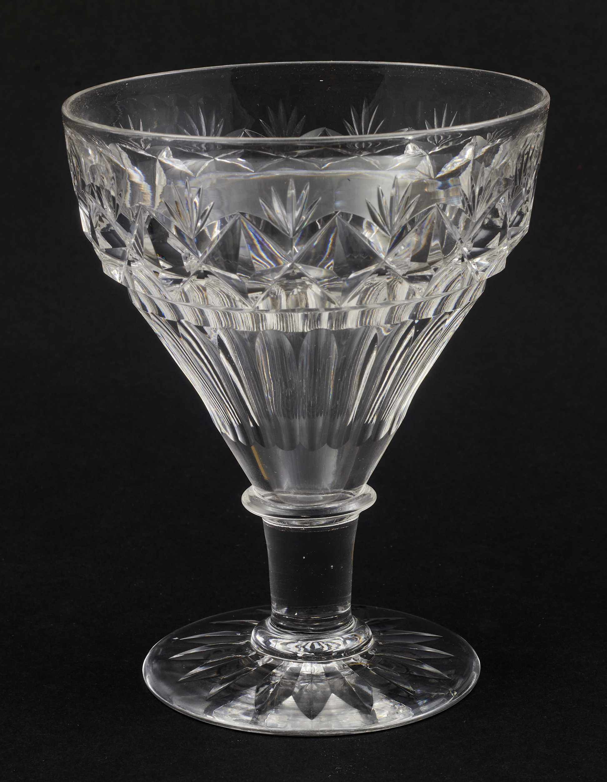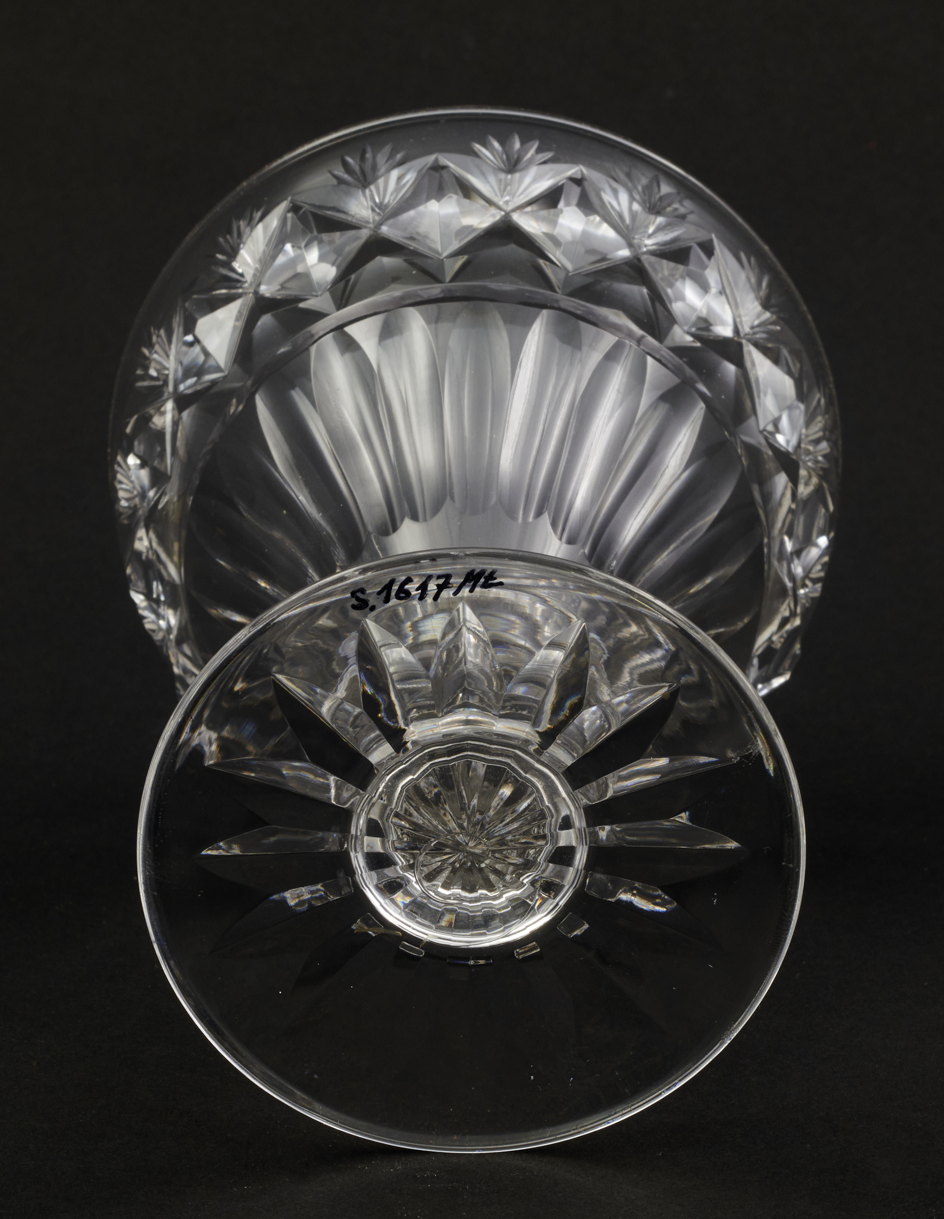 Kieliszek duży, wykonano ze szkła kryształowego. W zbiorach łańcuckich znajduje się także jeszcze pięć takich kieliszków. Zostały wykonane na przełomie XIX-XX wieku w Anglii, w stylu secesyjnym.