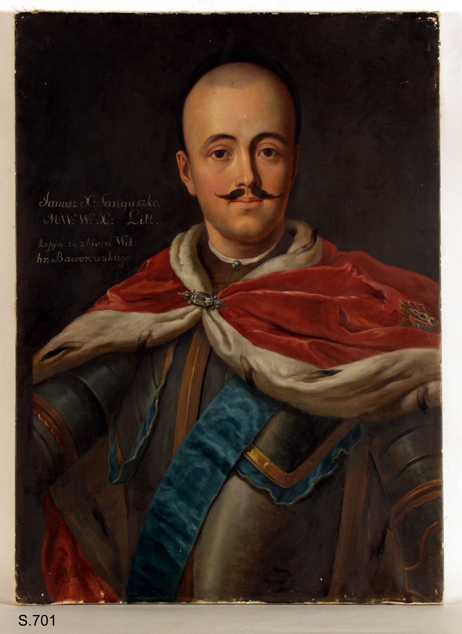 Po lewej stronie obrazu znajduje się napis, wykonany białą farbą: „Janusz X: Sanguszko. M:W:W:X: Litt. Kopja ze zbioru Wik: hr: Baworowskiego”.