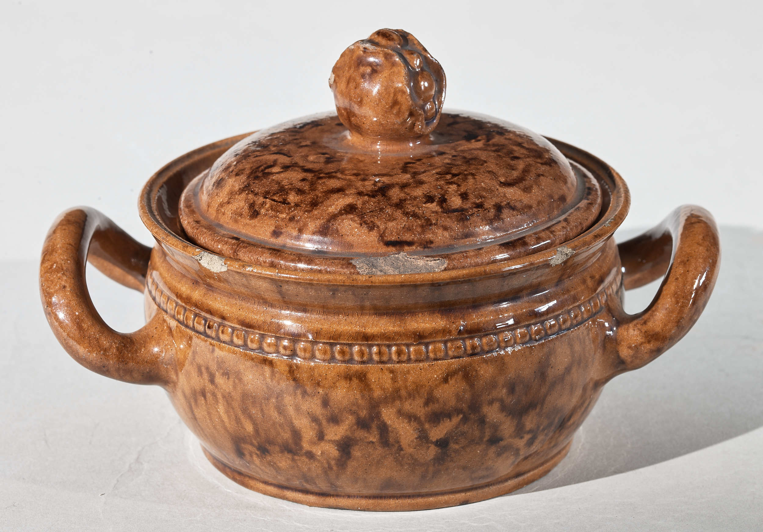 Okrągła miseczka z dwoma wystającymi uchwytami, w kolorze wypalonej glinki. Od spodu wytłoczona sygnatura producenta Feuerfest Meissen. Założenie manufaktury zawdzięczamy elektorowi saskiemu, a później królowi Polski Augustowi II Mocnemu. Monarcha był miłośnikiem i kolekcjonerem porcelany wschodniej.