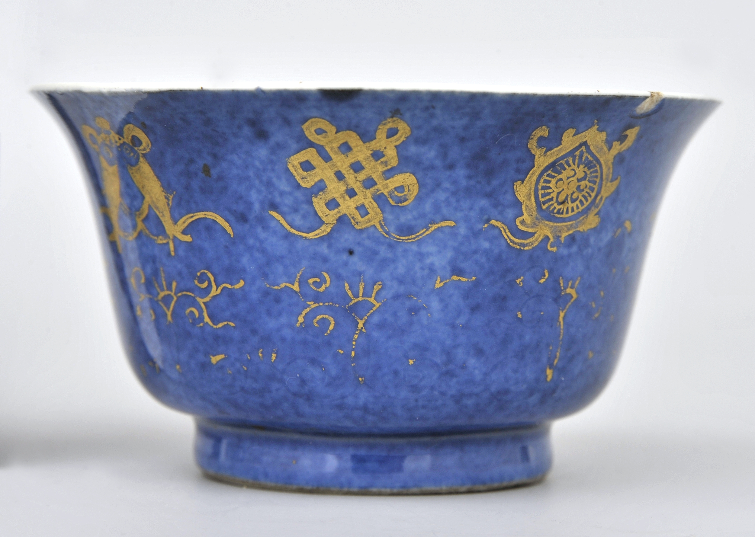 Porcelanowa czarka o dzwonowatym kształcie, na stopce, z lekko rozchylonym wylewem. Niezwykły kolor czarki i głębia jej zdobienia powstała poprzez nadmuchiwanie przez rurkę i gazę rozdrobnionego proszku kobaltowego na powierzchnię naczynia, i następnie pokrycie jej szkliwem. Złotą dekorację wykonano po wypaleniu czarki malując ją odpowiednio przygotowanym złotem. Zachowała się jedynie fragmentarycznie - ze względu na charakter zdobień najbardziej narażona na zniszczenie. Najlepiej widoczne jest osiem symboli buddyjskich umieszczonych w górnej części czarki oraz częściowo zachowane znajdujące się poniżej delikatne powtarzające się motywy.