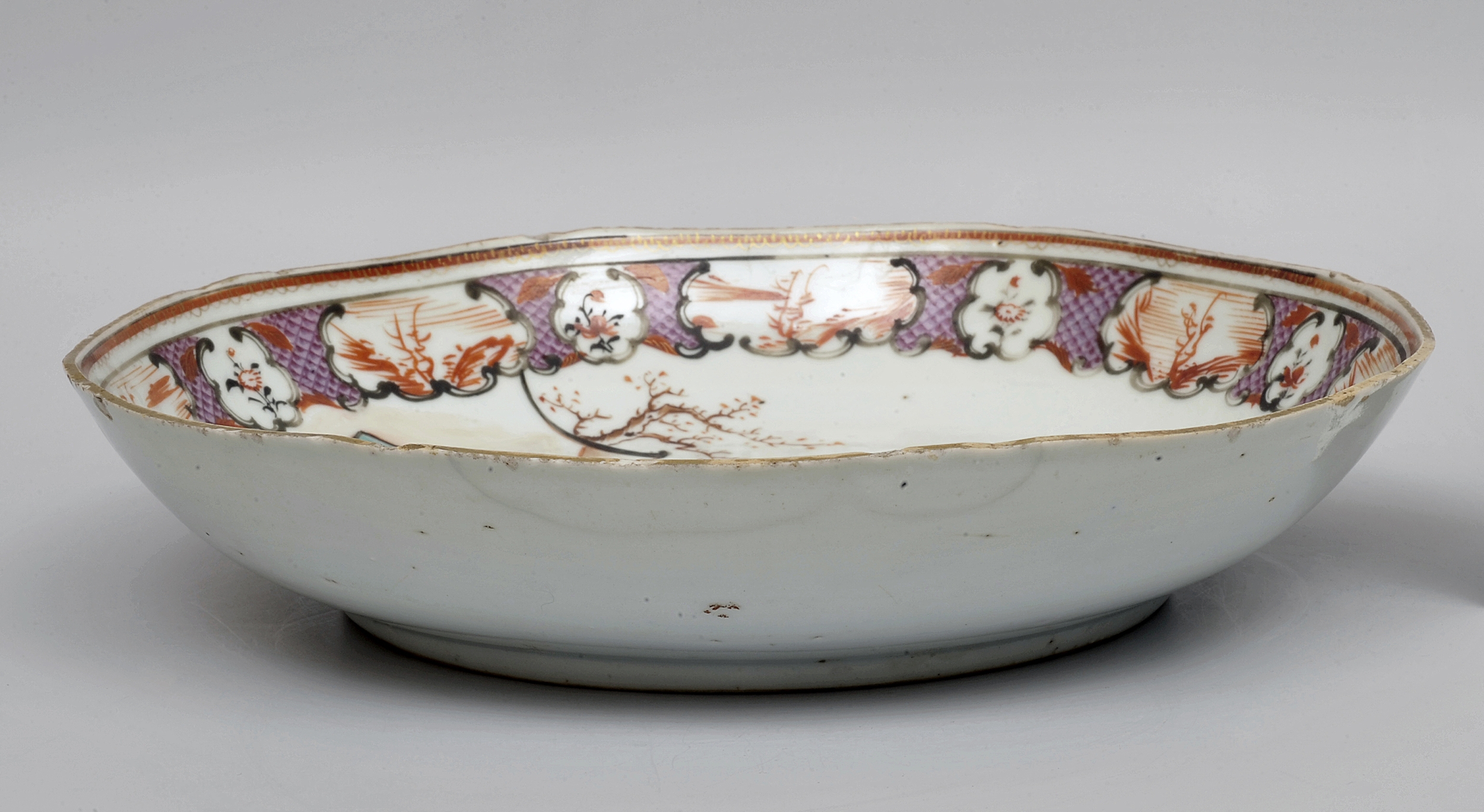 Porcelanowa okrągła misa o lekko pofalowanej krawędzi dekorowana w typie famille rose. Famille rose to francuski termin oznaczający przynależność do określonej grupy porcelany chińskiej. W tym przypadku jest to tzw. rodzina różowych, czyli wyroby dekorowane naszkliwnymi farbami z przewagą odcieni różu i purpury. Chińczycy określali je jako yangcai - „obce kolory”. Zaczęły być używane w chińskich manufakturach do zdobienia porcelany na przełomie lat 20. i 30. XVIII wieku. Najwyższy poziom artystyczny wyrobów w typie famille rose osiągnięto w wytwórniach Jingdezhen w okresie Yongzheng (1722-1735).
