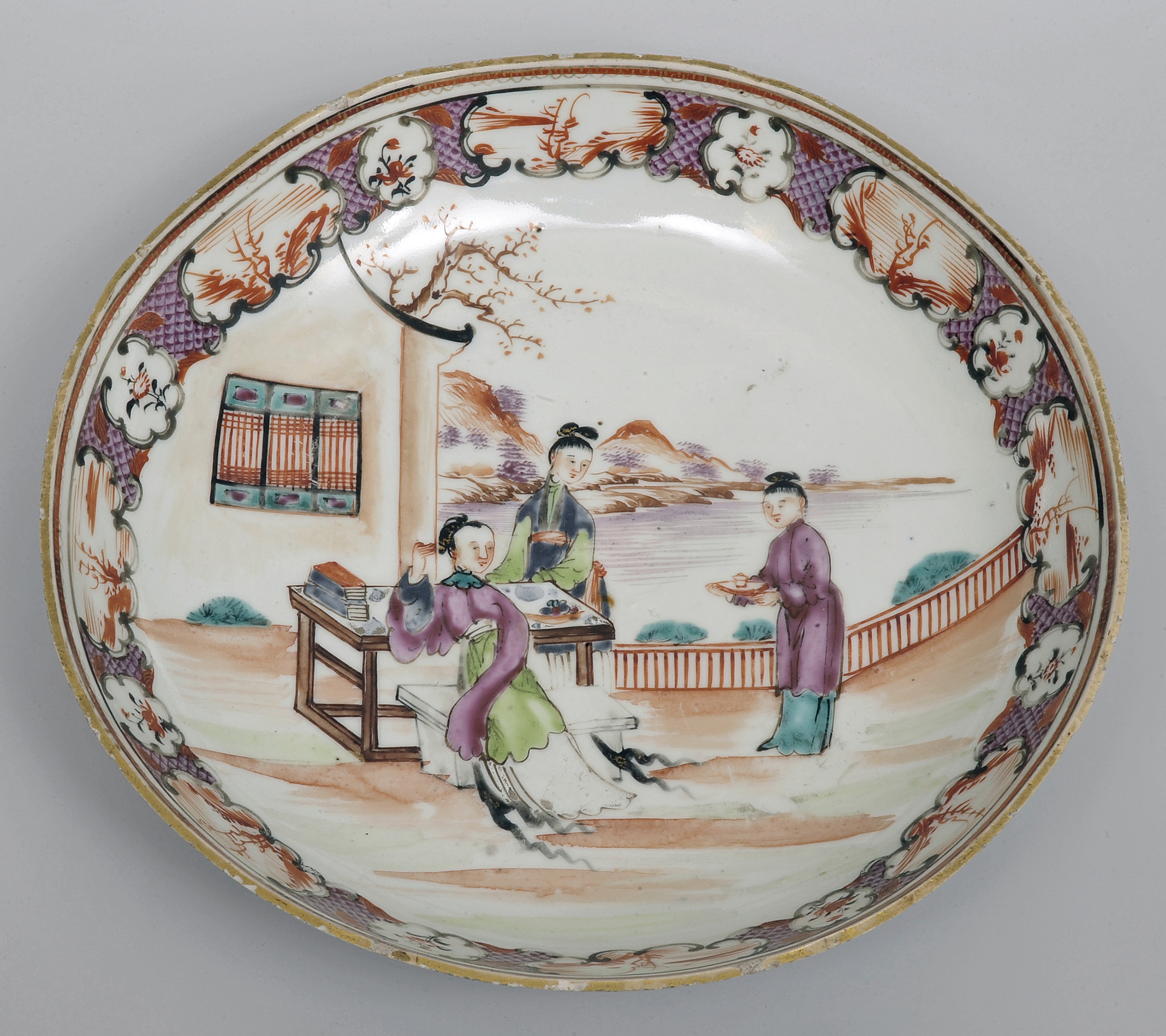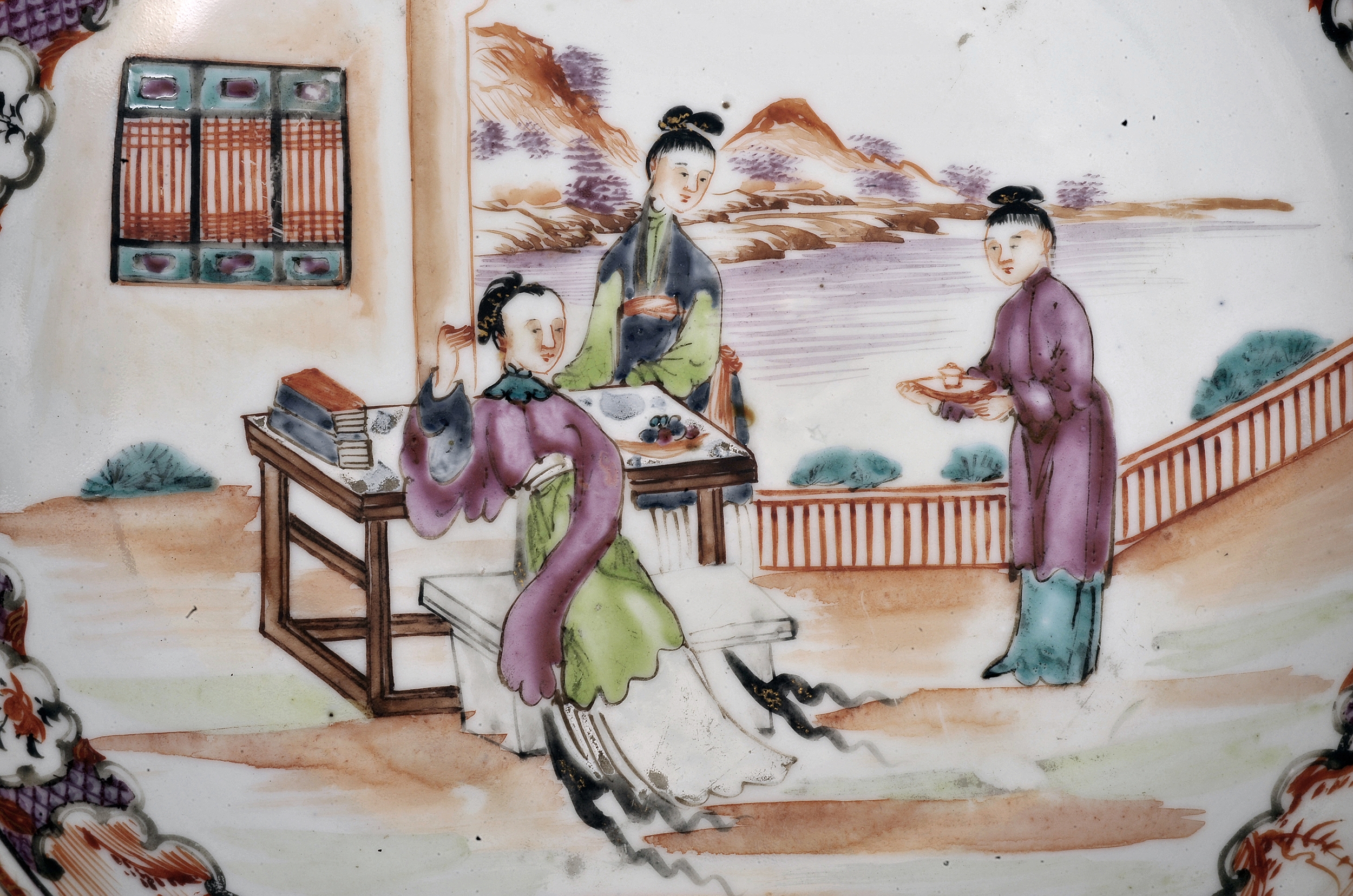 Dekoracja lustra misy przedstawia scenę figuralną przedstawiającą trzy kobiety wokół niewielkiego stołu umieszczonego na przydomowym tarasie. W tle zarysowano krajobraz chiński w postaci piętrzącego się pasma górskiego porośniętego lasem nad zatoką. Szeroka dekoracja krawędzi kołnierza obejmuje szesnaście rezerw – wyodrębnionych pól obwiedzionych krawędzią i wypełnionych dekoracją, oraz ciemnoróżowy motyw siateczki. Charakter dekoracji prezentuje motywy zdobnicze wykorzystywane specjalnie do eksportowych wyrobów odpowiadającym gustom zachodnim.