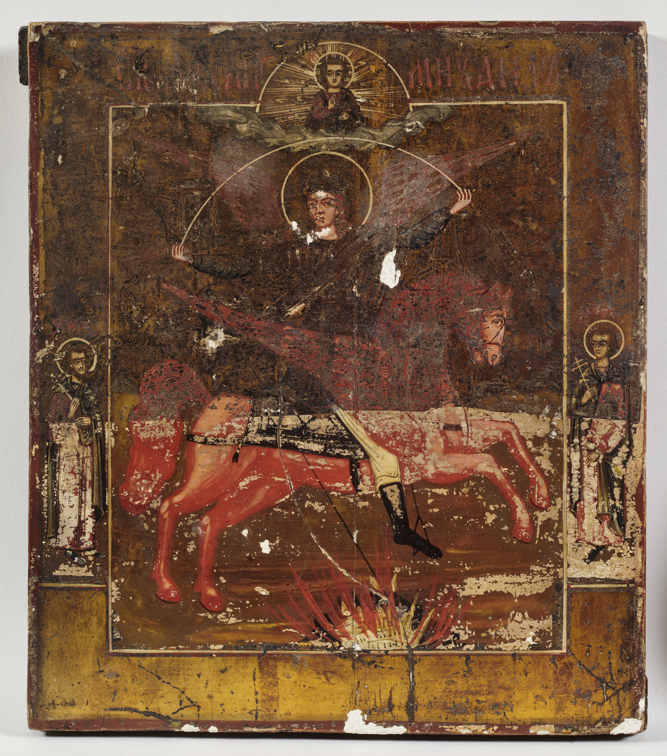 Szczególnym wizerunkiem w tradycji prawosławia moskiewskiego jest ikona św. Archanioła Michała Archistratega Niebiańskich Mocy. Obraz odwołuje się do Księgi Apokalipsy św. Jana, ale nie jest ilustracją jej treści. Na prezentowanej ikonie Archanioł Michał jako uskrzydlony zbrojny jeździec o czerwonym jak słońce obliczu, z obłokiem pod stopami, jest zwiastunem czasów ostatecznych (Ap. 10,1), galopuje na czerwonym skrzydlatym koniu nad otchłanią, z której wyłania się smok – strącony szatan (Ap. 20, 2-3). Przy ustach Archanioła pojawia się obwieszczająca Sąd trąba, w szeroko rozpostartych rękach – Ewangelia, kadzidło i włócznia (Ap. 8,3), krzyż, pomiędzy dłońmi rozpięty łuk tęczy (Ap. 10, 1-2 i 7-8). W narożu ikony popiersie młodzieńczego Chrystusa Emmanuela za stołem przywołuje tajemnicę Wcielenia i Ofiarę Zbawczą Chrystusa. Wzorem dla tego typu ikon były starsze bizantyjskie i ruskie przedstawienia Archanioła jako przewodnika na drodze ku zbawieniu. Wizerunek apokaliptycznego Archanioła Michała ukształtował się w kręgach państwowo-cerkiewnej władzy w Moskwie w XVI w. Niewykluczone, że temat został opracowany w otoczeniu metropolity Makarego za rządów Iwana IV Groźnego. Ikona zawierała przesłanie teologiczno-dydaktyczne. Po upadku Bizancjum państwo moskiewskie miało być kontynuatorem chrześcijańskiego Konstantynopola – Trzeciego Rzymu wybranego przez Boga na drodze do zbawienia i krzewienia wiary. Temat miał wyrażać między innymi ideę bożego wybraństwa państwa moskiewskiego, którego szczególnym opiekunem był Archanioł Michał Archistrateg – przewodnik carstwa rosyjskiego w czasach ostatecznych, jako ostoi prawowiernego chrześcijaństwa.