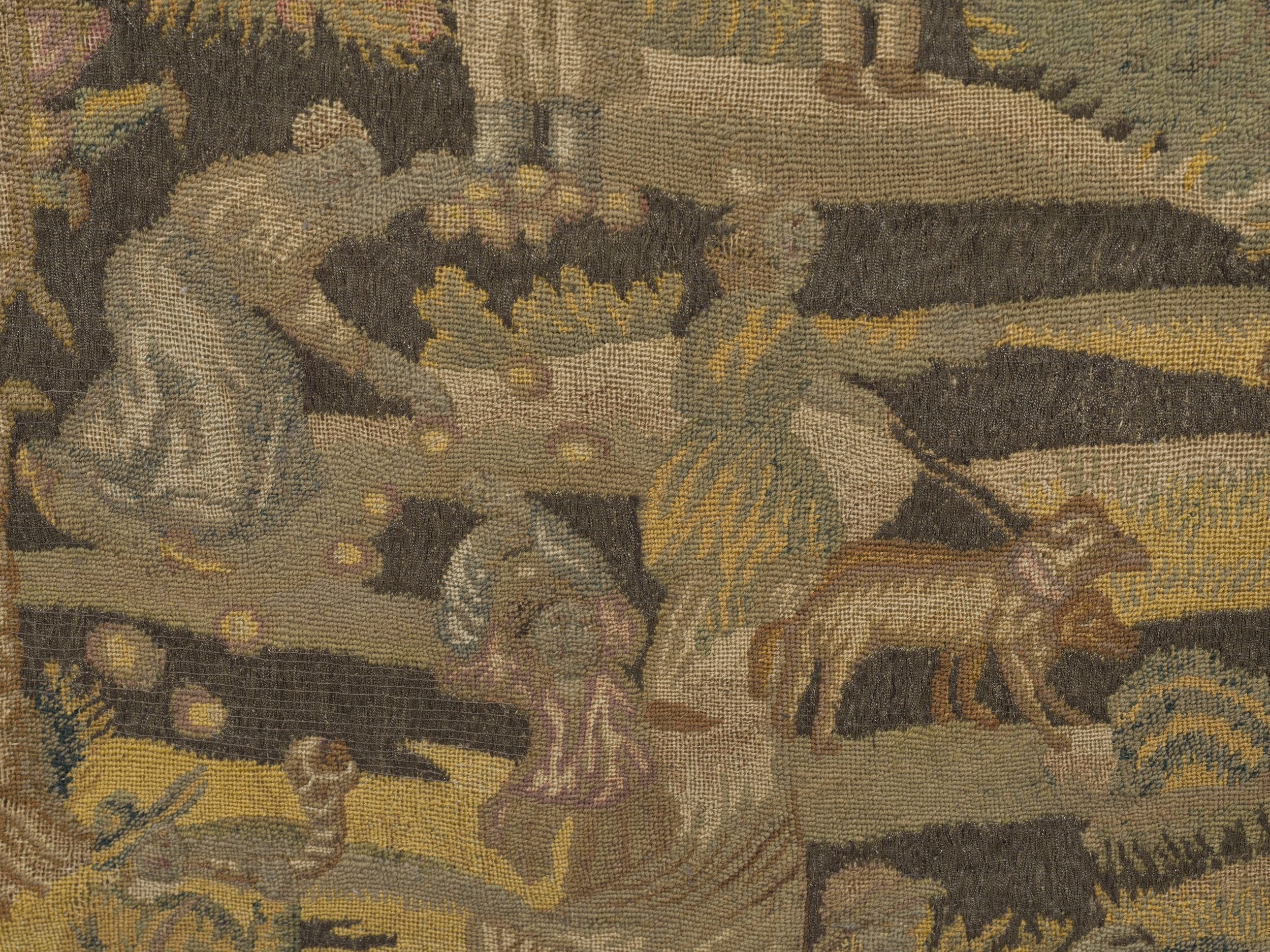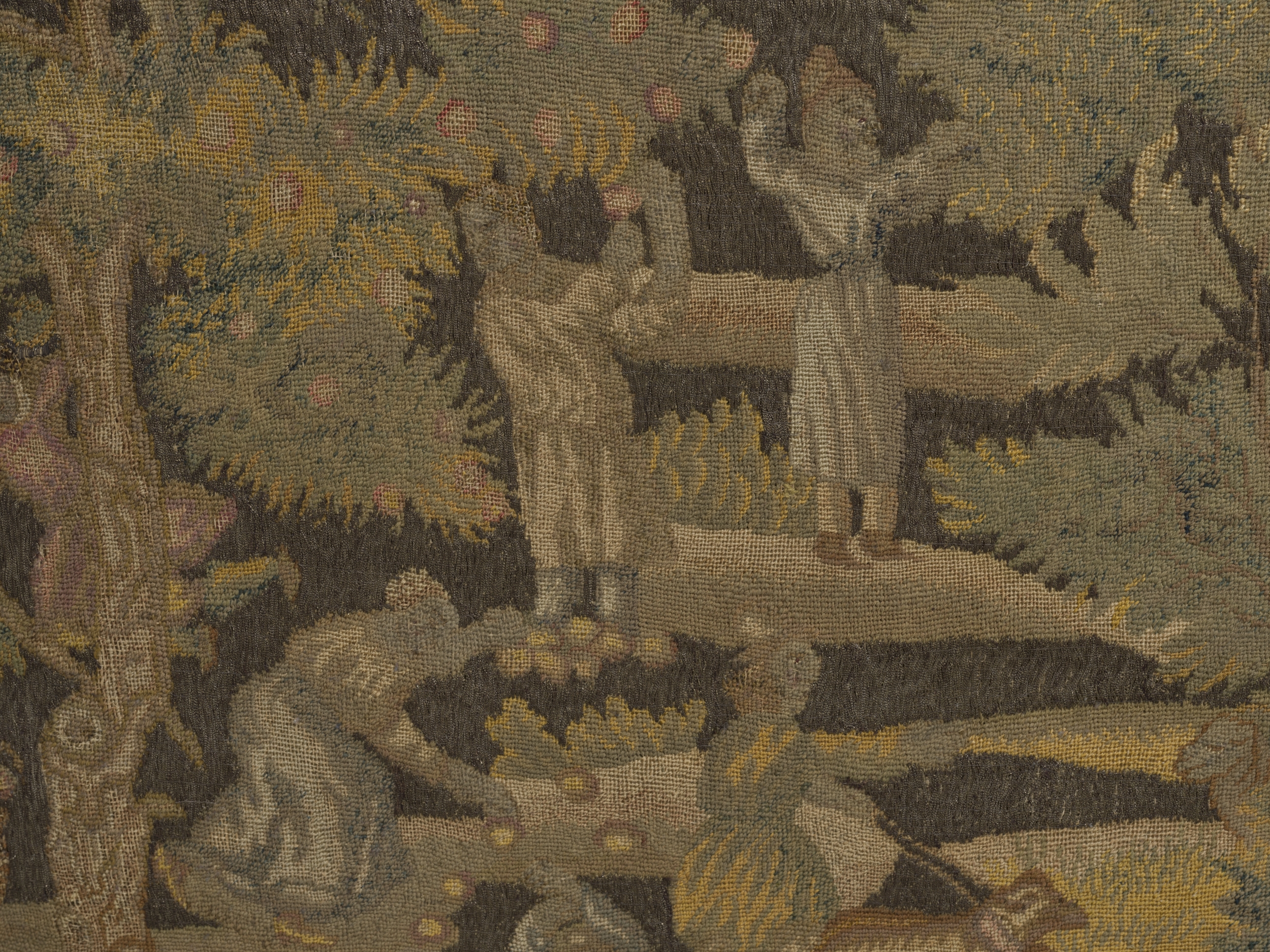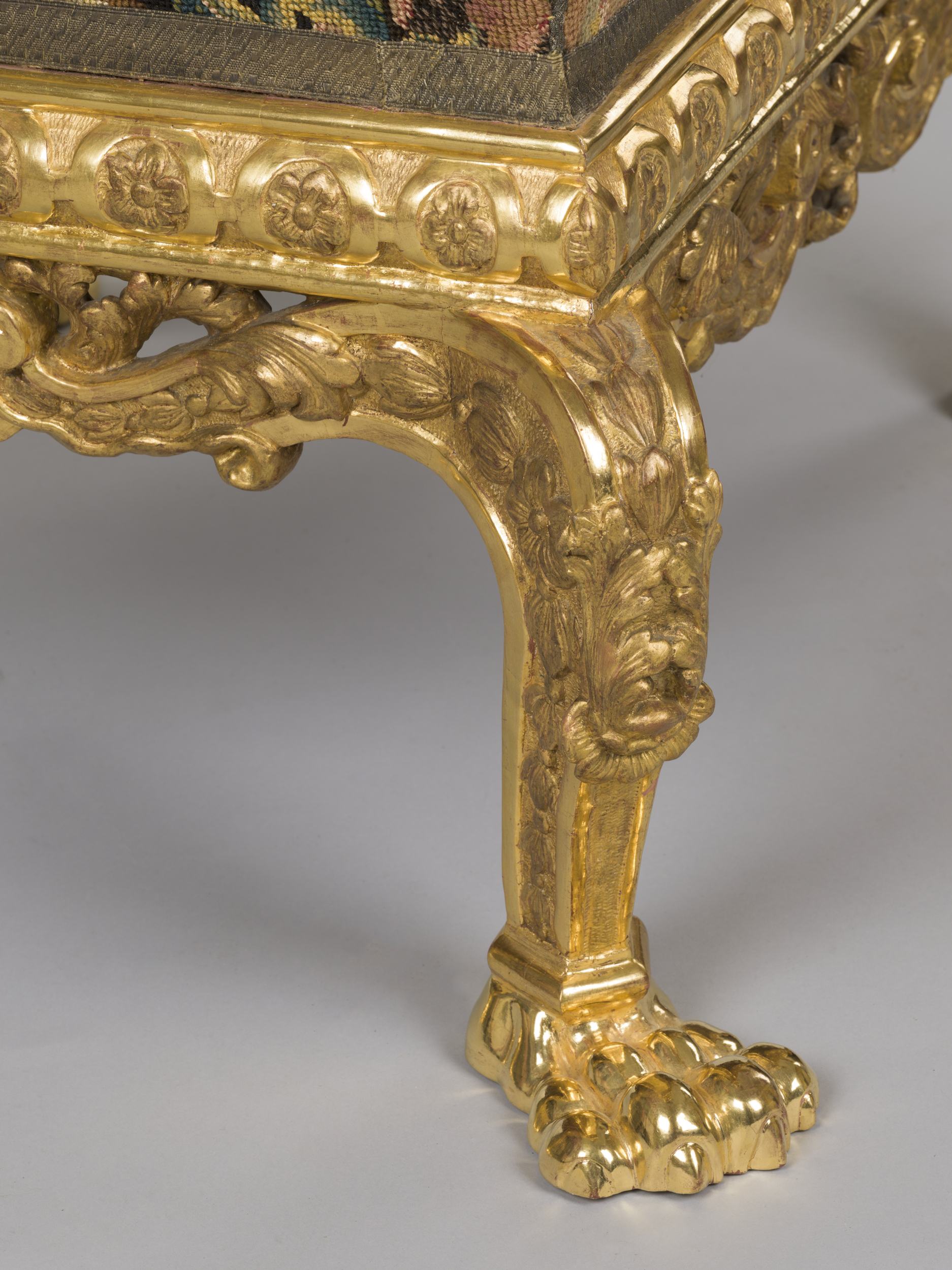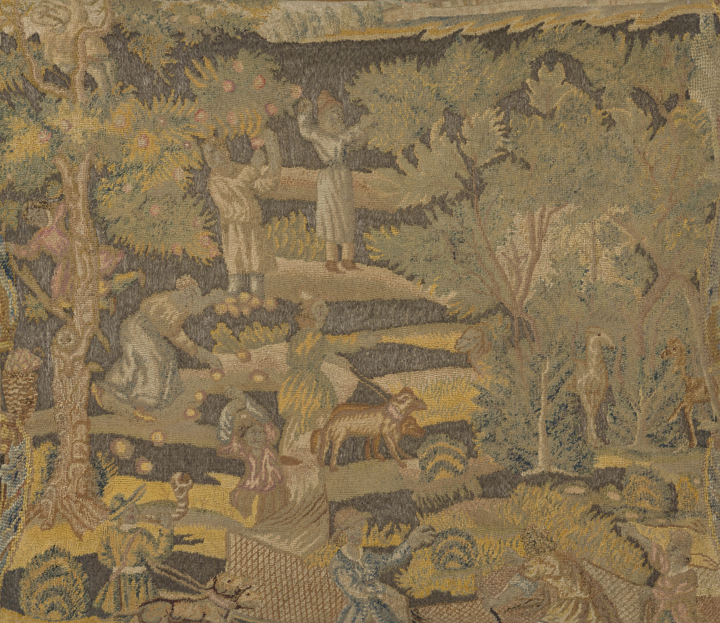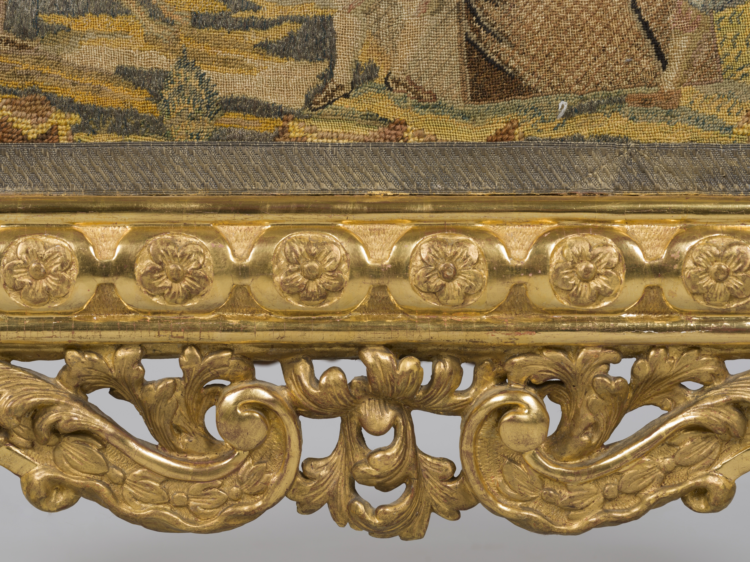 Poduszka tapicerowanego siedziska pokryta jest tkaniną z wielobarwnym haftem krzyżykowym gros points i petite points przedstawiającym scenę zbiorów wpisując się tym samym w narrację pozostałych mebli w zespole, ilustrujących prace rolne w różnych porach roku. Połączenie poduszki z drewnianą konstrukcją przykrywa dekoracyjna taśma galonu ze złotą nitką. Użytkowanie mebla i często niesprzyjające warunki przechowywania wpłynęły na degradację walorów tkaniny odbierając jej żywe barwy, blask metalowej złotej i srebrnej nitki. Jednak niezwykle bogata, złocona dekoracja rzeźbiarska drewnianej konstrukcji o wyszukanej symetrycznej kompozycji motywów oraz ręcznie haftowana tkanina pokrycia nadaje mu reprezentacyjny charakter godny królewskich apartamentów. Stanowią wyposażenie apartamentu króla Jana III i jego małżonki Marii Kazimiery w pałacu wilanowskim, notowane we wszystkich jego zachowanych rejestrach inwentarzowych.