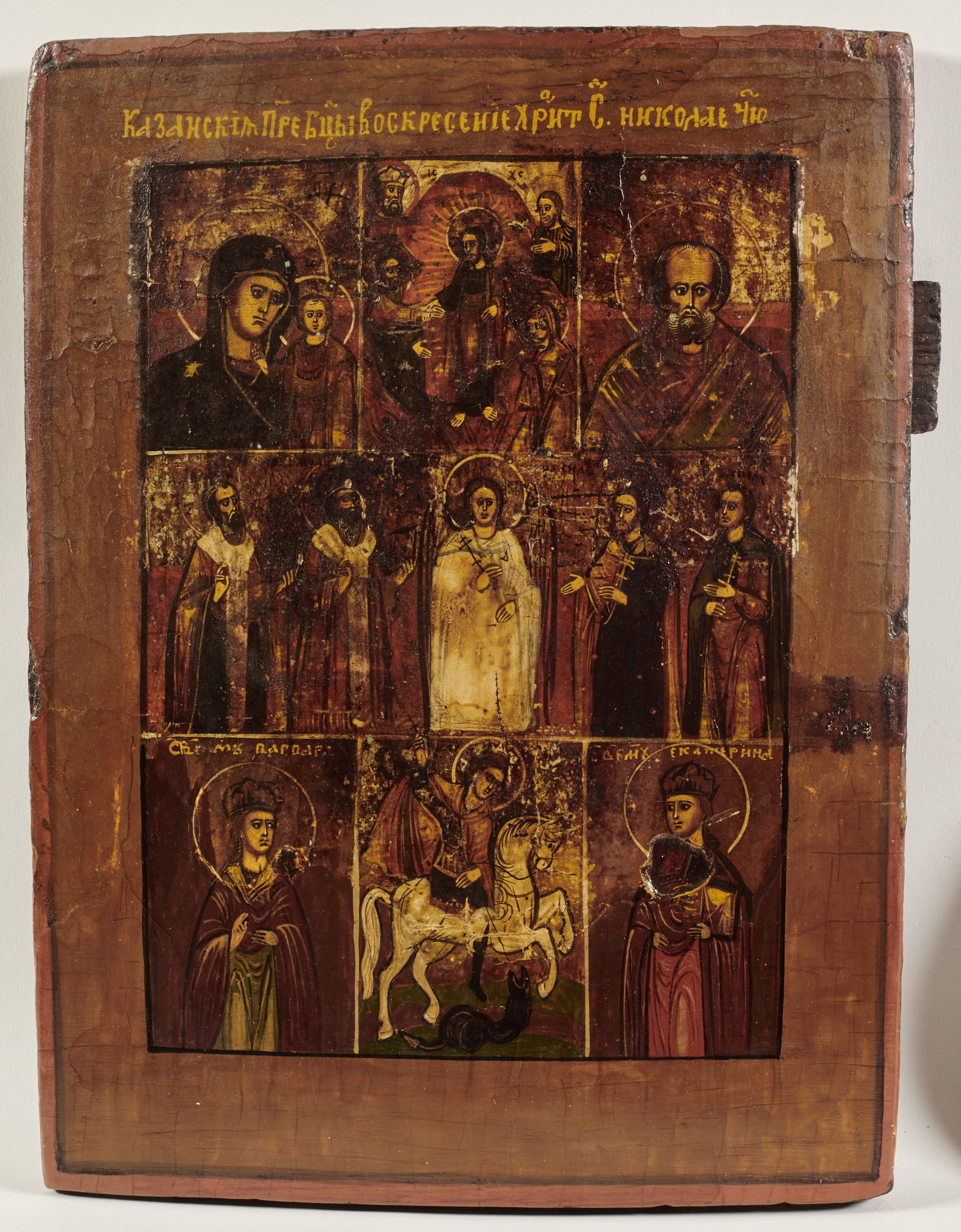 Tradycja tworzenia ikon złożonych z kilku różnych wizerunków zestawionych na jednym podobraziu sięga odległych czasów. Przypuszczalnie na terenie Rusi ikony takie pojawiły się pod koniec XIV w. Najstarsze znane z XV w. pochodzą z Nowgorodu Wielkiego położonego na północno - zachodnich ziemiach Rusi. Obrazy tego typu chętnie stosowano w domowym użyciu. Zawierały one pozostające w szczególnym kulcie i cudami słynące wizerunki Bogurodzicy, popularnych wybranych świętych będących orędownikami w konkretnych potrzebach lub sceny ewangeliczne. Na prezentowanej ikonie zobrazowano przedstawienia, licząc od lewego górnego naroża: Bogurodzica Hodigitria Kazańska; Zmartwychwstanie Chrystusa (Zastąpienie do Otchłani) – najważniejsze chrześcijańskie święto roku liturgicznego; św. Mikołaj Cudotwórca; Archanioł z postaciami czterech świętych; św. Barbara; św. Jerzy Męczennik; św. Katarzyna.