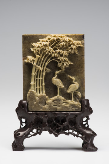 Lustra z brązu znane były w Chinach już w starożytności. Szczególny rozkwit przeżywały te wyroby w epoce Han i później w epoce Tang. Omawiany egzemplarz pochodzi z późniejszego okresu – panowania dynastii Yuan. Jego awers został wypolerowany i pełnił funkcję lustra, rewers zaś jest bogato rzeźbiony. W centralnym punkcie kompozycji umieszczony został guz z otworem, przez który przeciągano ozdobny sznur. Wokół wyrzeźbiona została scena rodzajowa w ogrodzie pod sosną i z żurawiem nad rzeką.