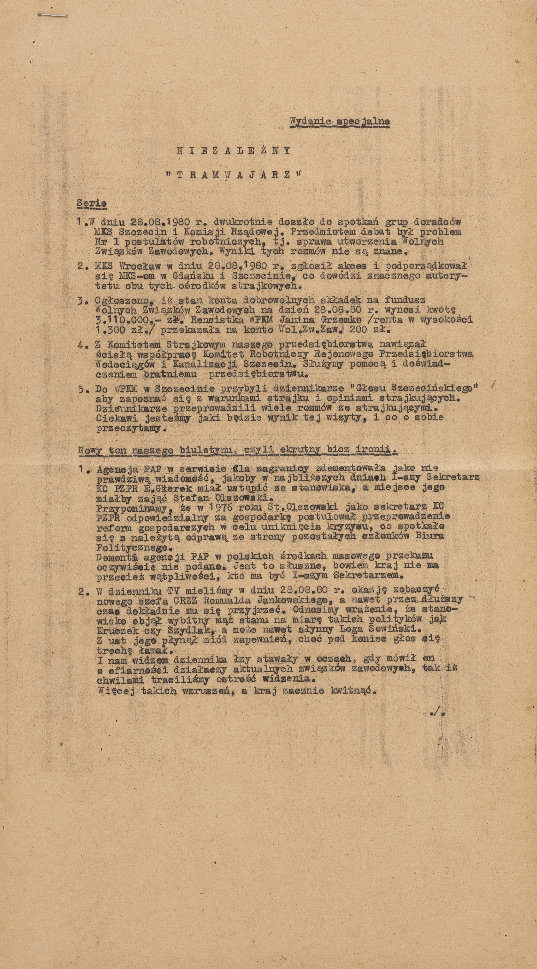 Wydanie specjalne biuletynu strajkowego Wojewódzkiego Przedsiębiorstwa Komunikacji Miejskiej Niezależny „Tramwajarz” to dwukartkowe pismo dotyczące wydarzeń z 27 i 28 sierpnia 1980 roku. Informuje przede wszystkim o stanie szczecińskich rozmów strajkujących z komisją rządową, sytuacji w innych strajkujących ośrodkach w kraju, jak również o funduszu Wolnych Związków Zawodowych, na który zbiórki rozpoczęły się 26 sierpnia czy wydarzeniach związanych bezpośrednio z zakładową komisją strajkową WPKM-u.
