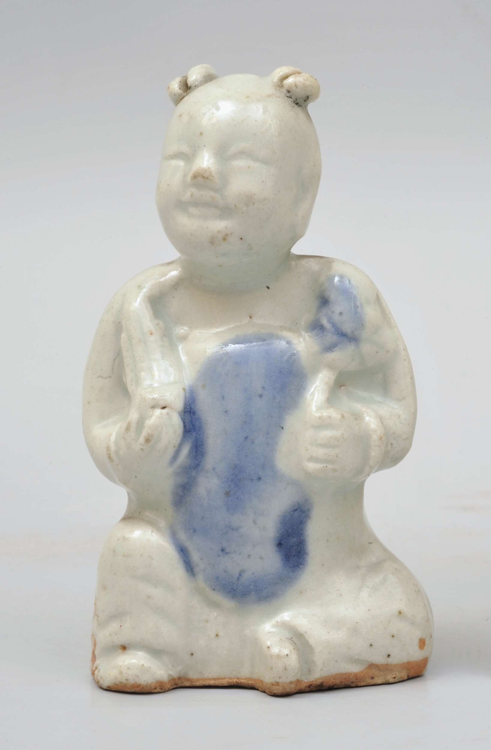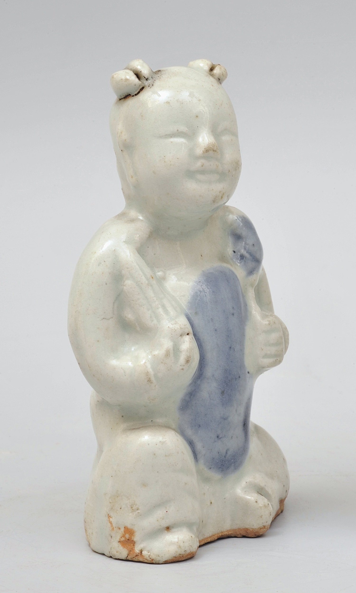 Niewielka porcelanowa figurka małego siedzącego chłopca. W lewej dłoni chłopiec trzyma kwiat lotosu, w drugiej niezidentyfikowany przedmiot. Przypuszczalnie figurka przedstawia jednego z nieśmiertelnych bliźniaków w panteonie bóstw taoistycznych, nazywanych He-He Er Xian. Przedstawienie pary bóstw symbolizuje szczęśliwe małżeństwo. Tradycyjnie bóstwa te dzierżą w dłoniach swoje atrybuty – kwiat lotosu i pudełko.
