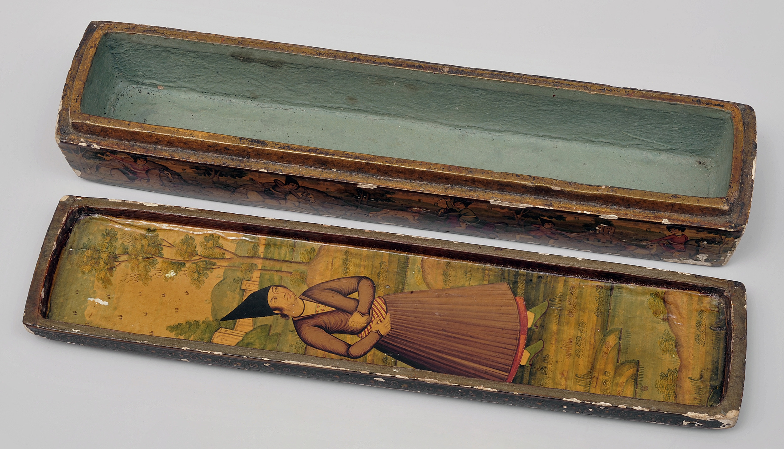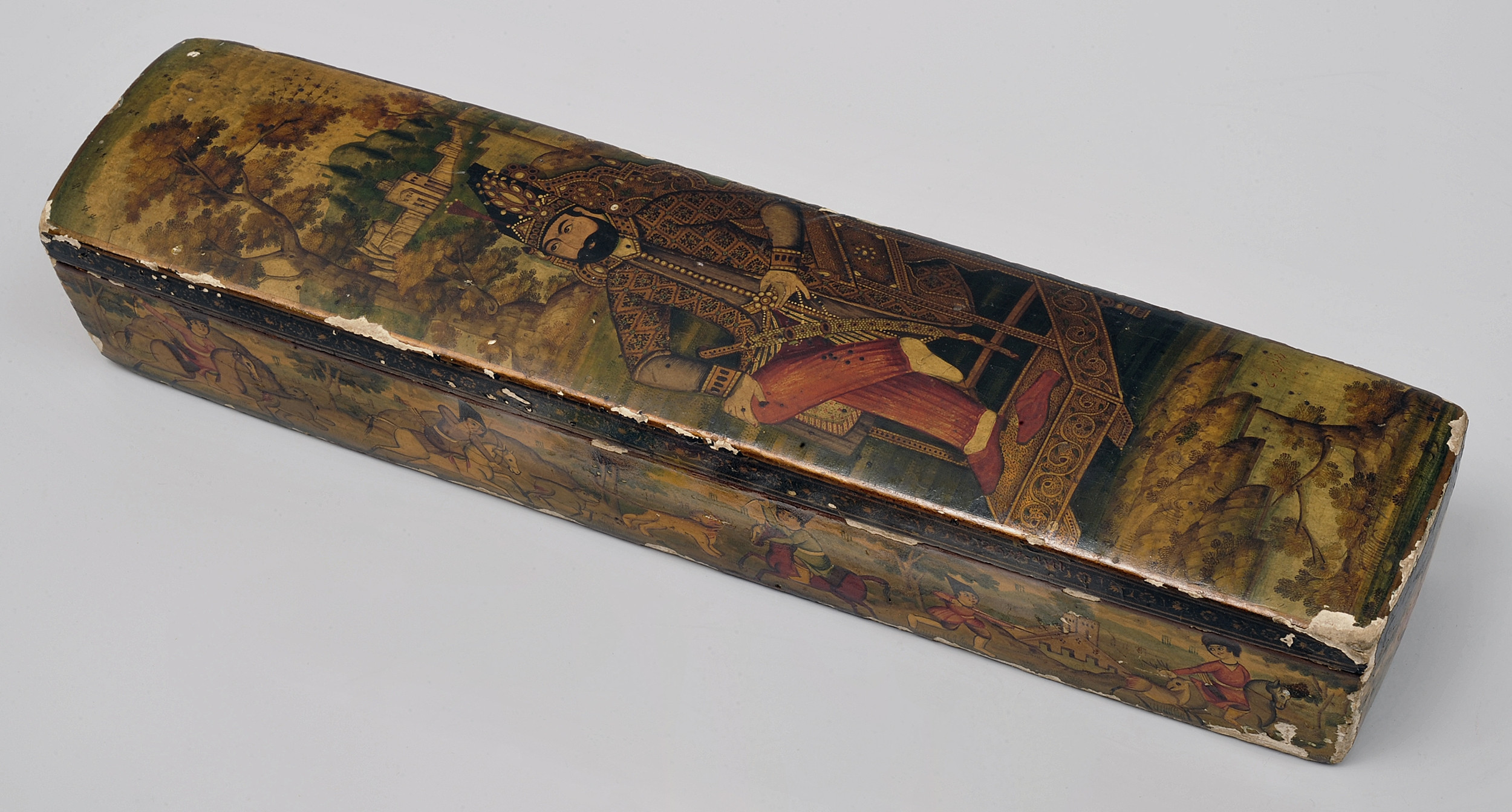 Prostokątne pudełko z pokrywką zdobione laką i malaturą. Określa się je qalam -dan, czyli futerał na narzędzia potrzebne skrybie. Drewniany obiekt składa się z podłużnego pudełka z okładziną z papier mâché i analogicznej w kształcie pokrywki. Ścianki wieczka i spód pudełka udekorowano laką lub jej imitacją, i pokryto złoconą wicią floralną. Wieczko zdobi przedstawienie zasiadającego na tronie sułtana Muhammada Shah Ghazi pośród zieleni, w tle zaś widoczna jest jego rezydencja. Od spodu wieka ukazano sługę na kontynuacji wspomnianego tła. Boki pudełka zdobią sceny myśliwskie.