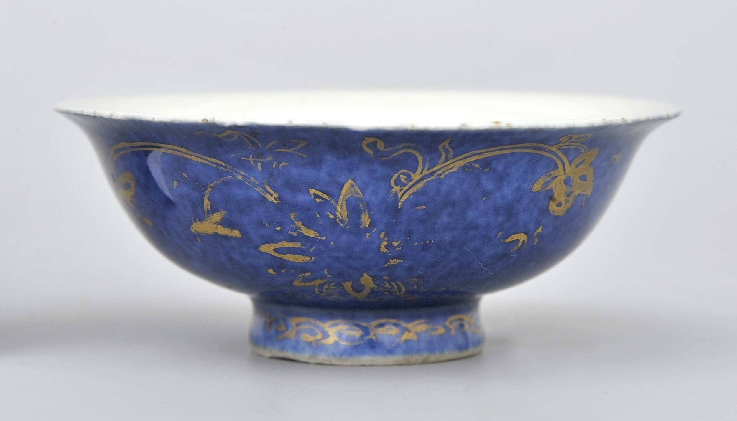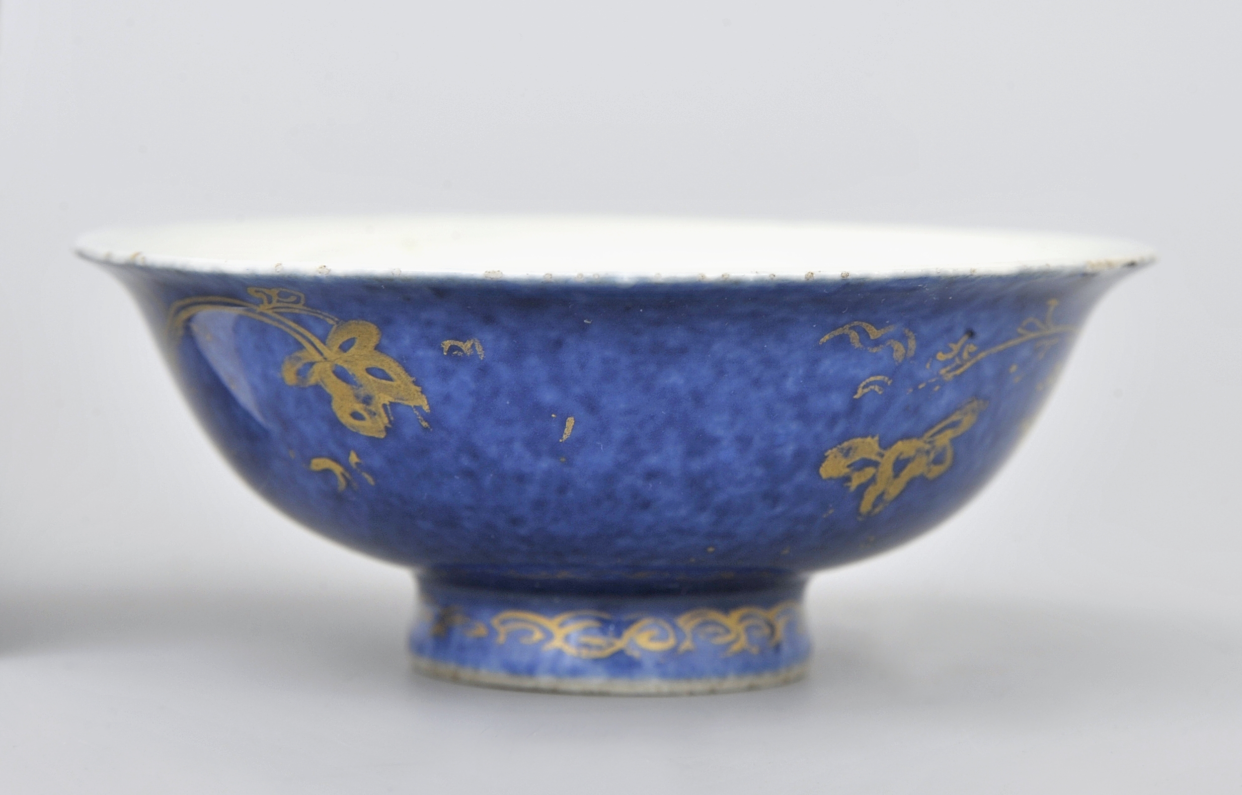 Porcelanowa pokrywka do czarki o kształcie odwróconej, płytkiej czarki na stopie, z delikatnie wywiniętą krawędzią wylewu. Niezwykły kolor pokrywki i głębia jej zdobienia powstała poprzez nadmuchiwanie przez rurkę i gazę rozdrobnionego proszku kobaltowego na powierzchnię naczynia, i następnie pokrycie jej szkliwem. Złotą dekorację wykonano po wypaleniu pokrywki malując ją odpowiednio przygotowanym złotem. Zachowała się jedynie fragmentarycznie - ze względu na charakter zdobień najbardziej narażona na zniszczenie. Przedstawia motywy floralne – głównie kwiaty lotosu. Na uchwycie pokrywki można dostrzec fragmenty ciągłego ornamentu o motywie chmur. Na denku uchwytu widnieje chiński znak węzła nieskończoności.