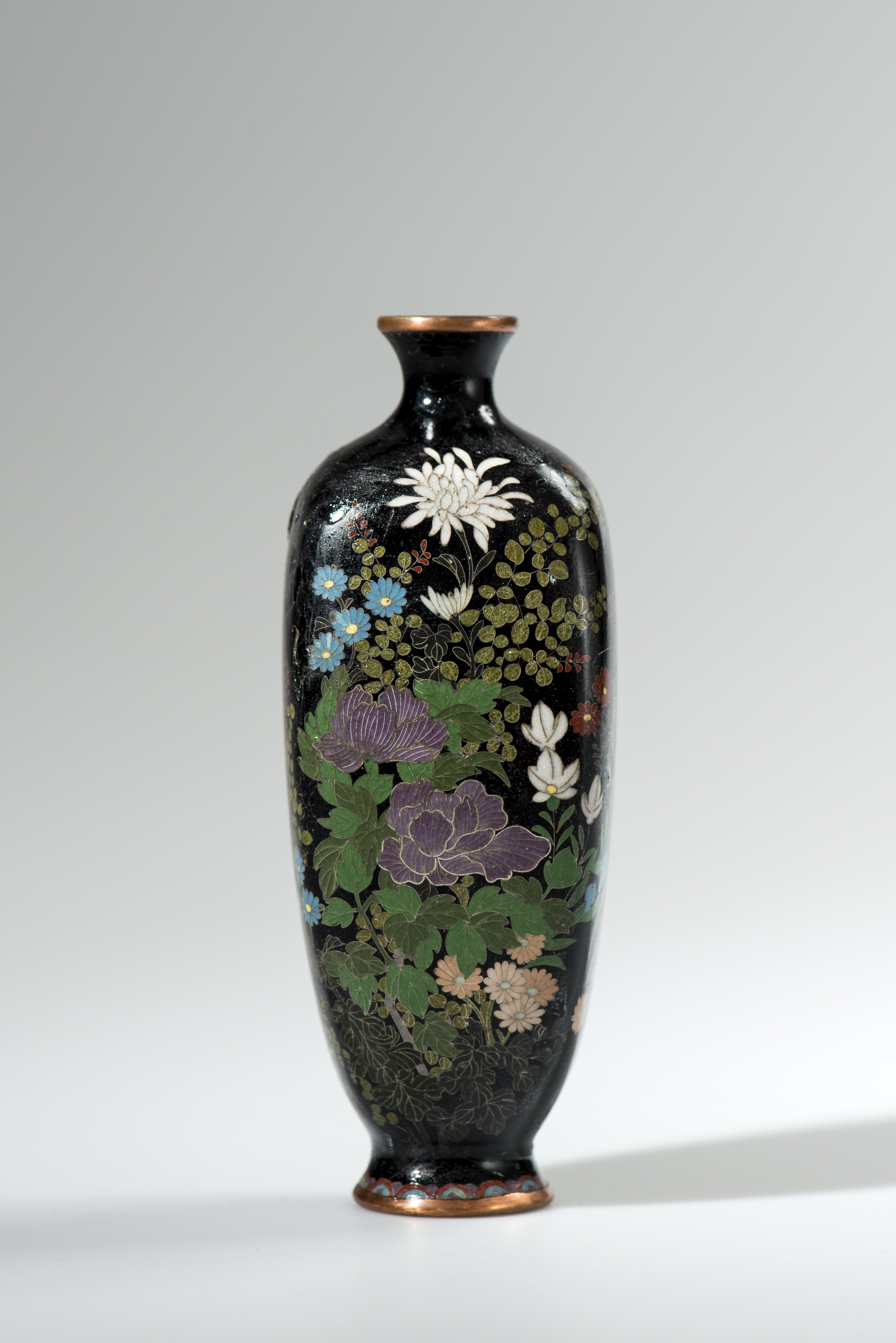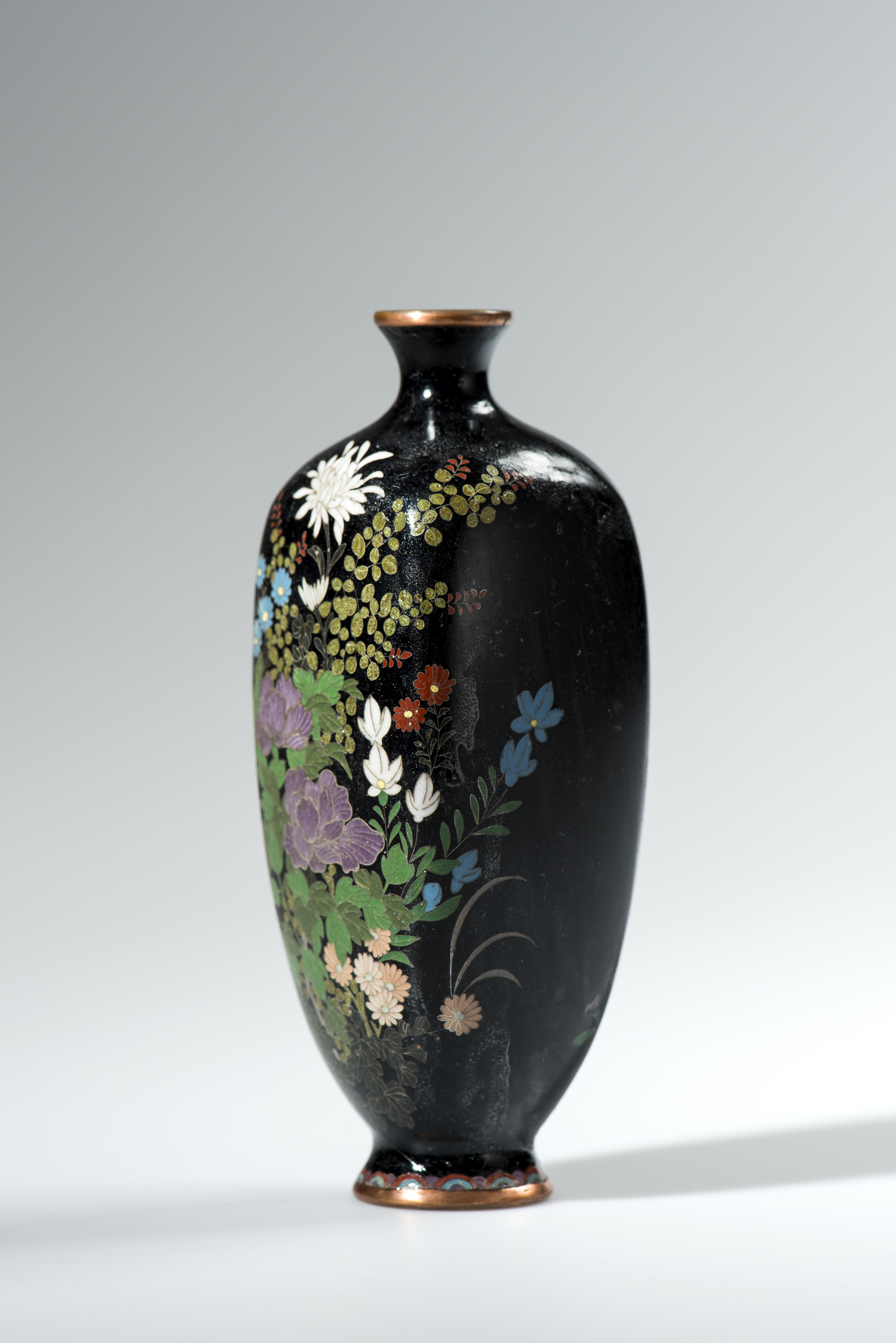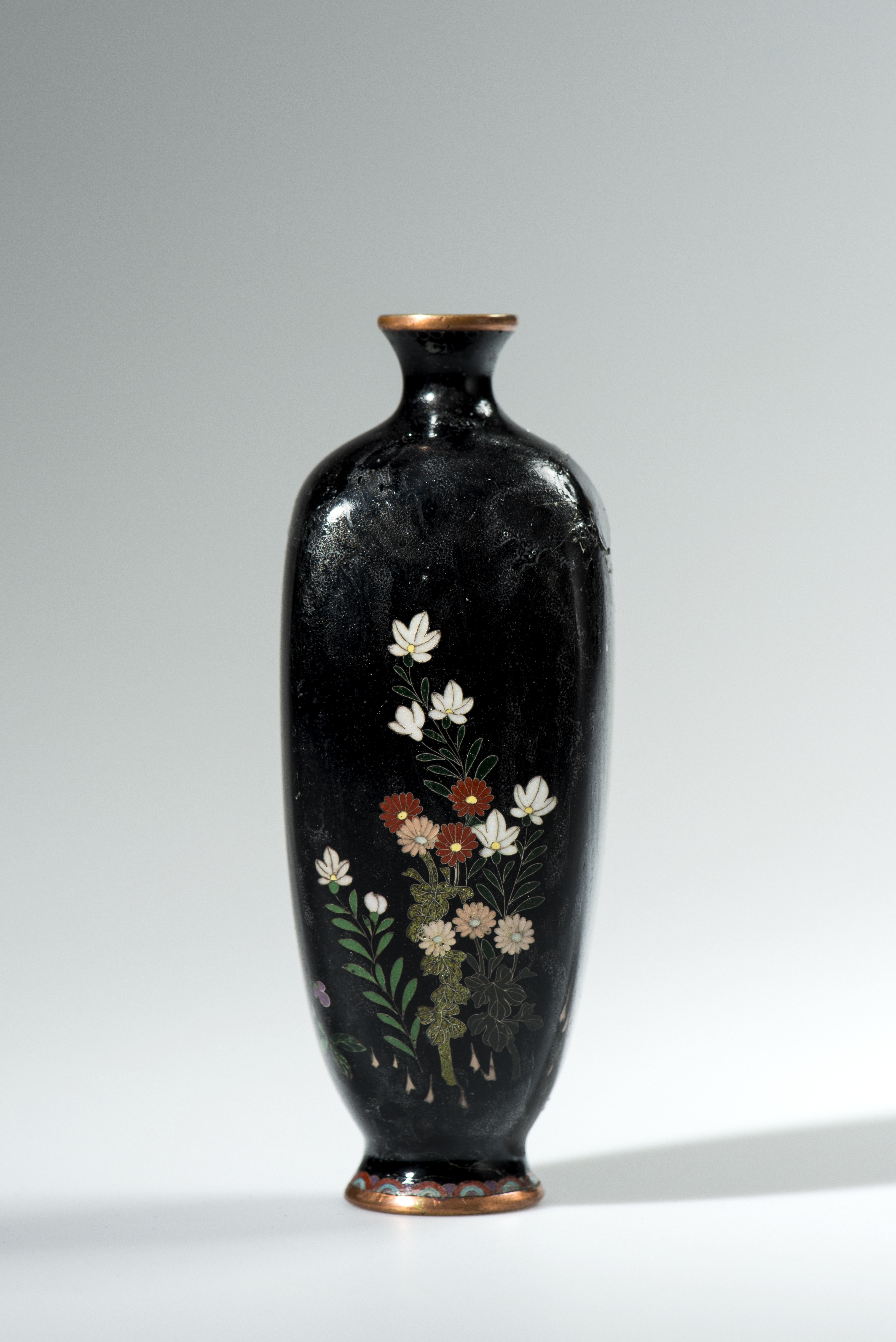 Flakonik ten należy do obiektów z dominującym czarnym tłem. Ciemne kolory emalii były trudniejsze do uzyskania niż żółte czy zielone. Do tworzenia komórek zastosowano w tym przypadku srebrny drut, co dało inny efekt niż na typowych wyrobach emalii komórkowej. Dekoracja dominuje po jednej stronie naczynia. Znalazły się na niej kwiaty jesienne, jak chryzantemy i dzwonki, ale też peonie, które są kwiatami wiosennymi.