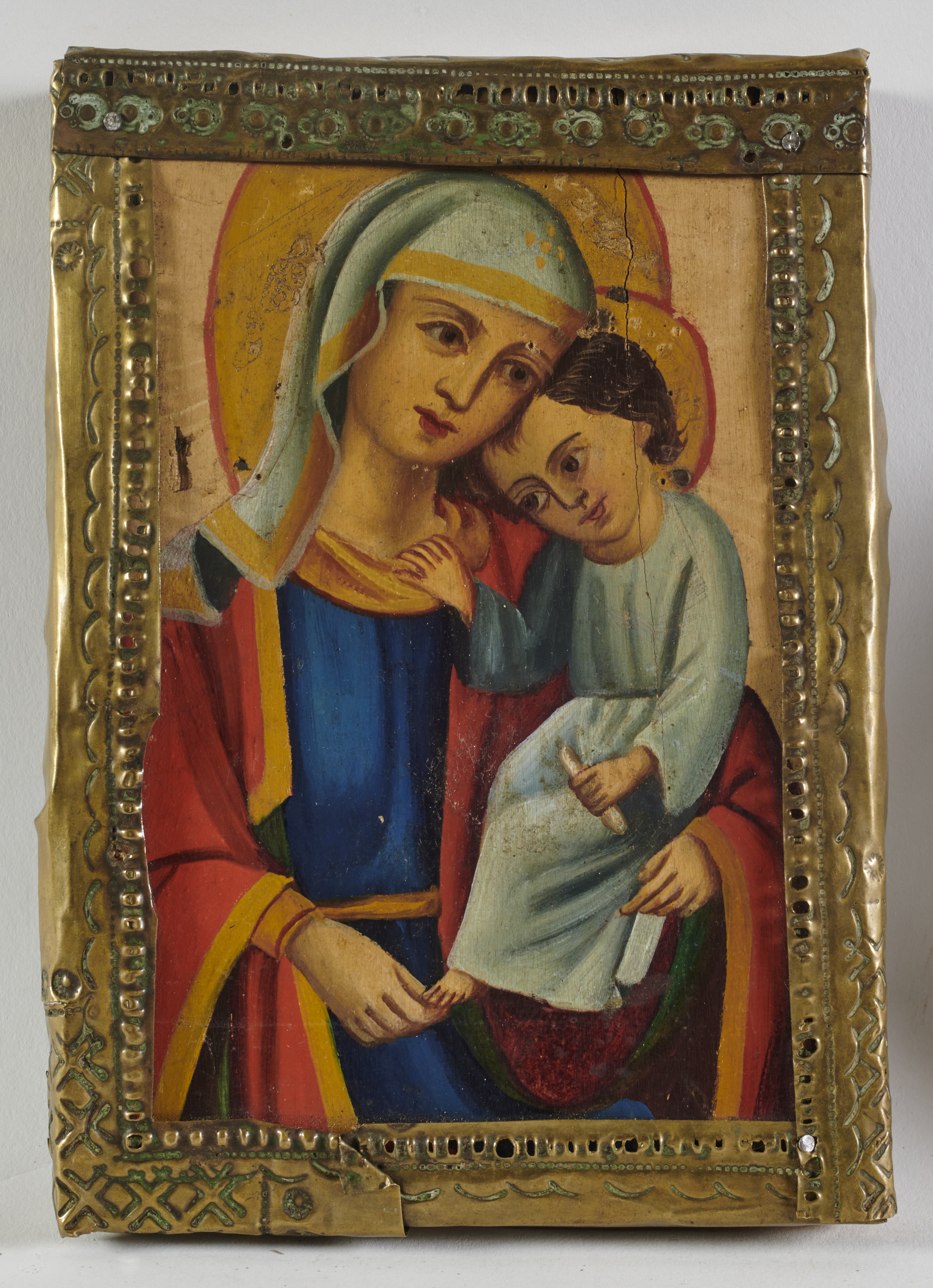 drewno, zaprawa kredowa, farba olejna, mosiądz