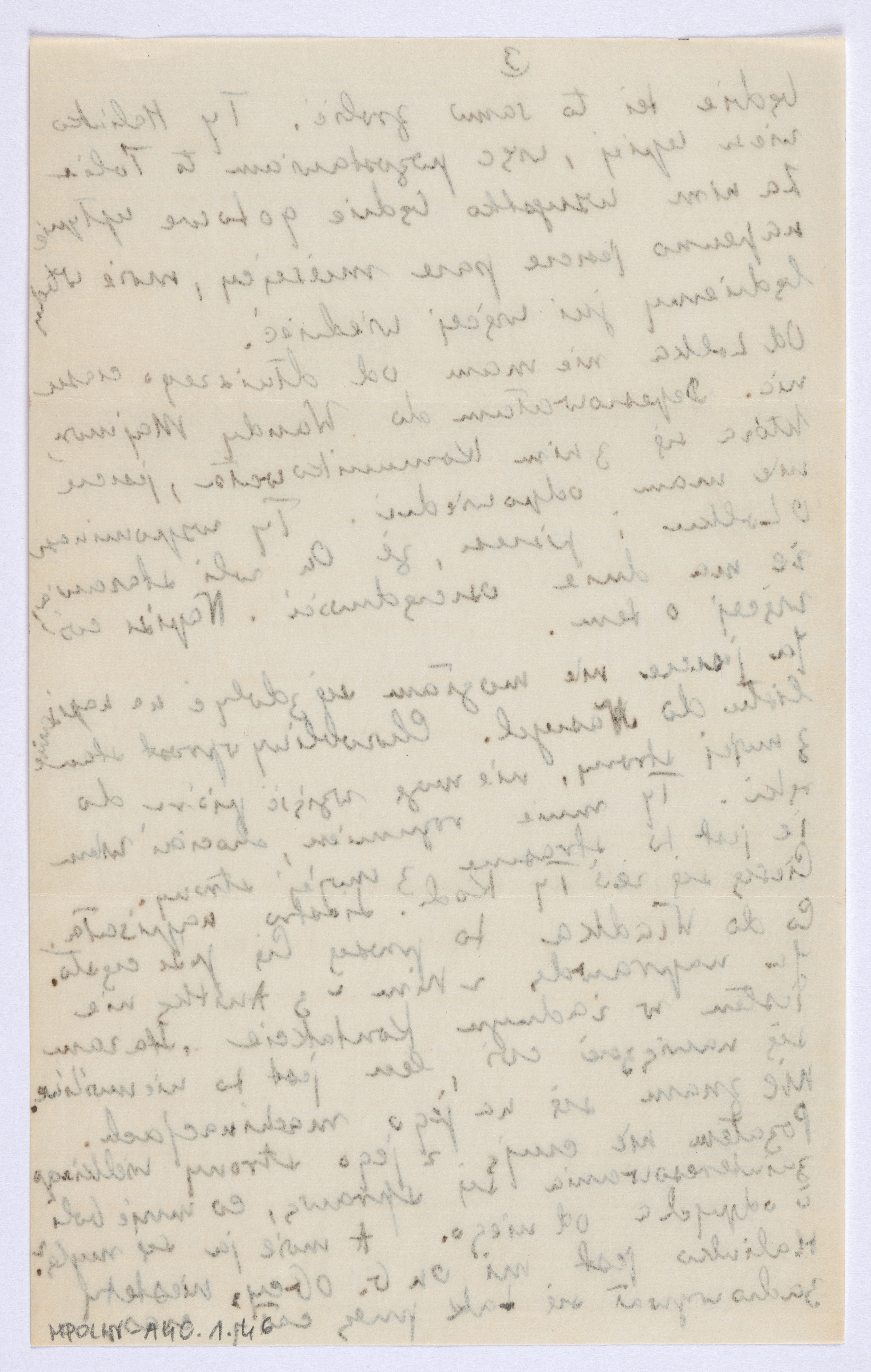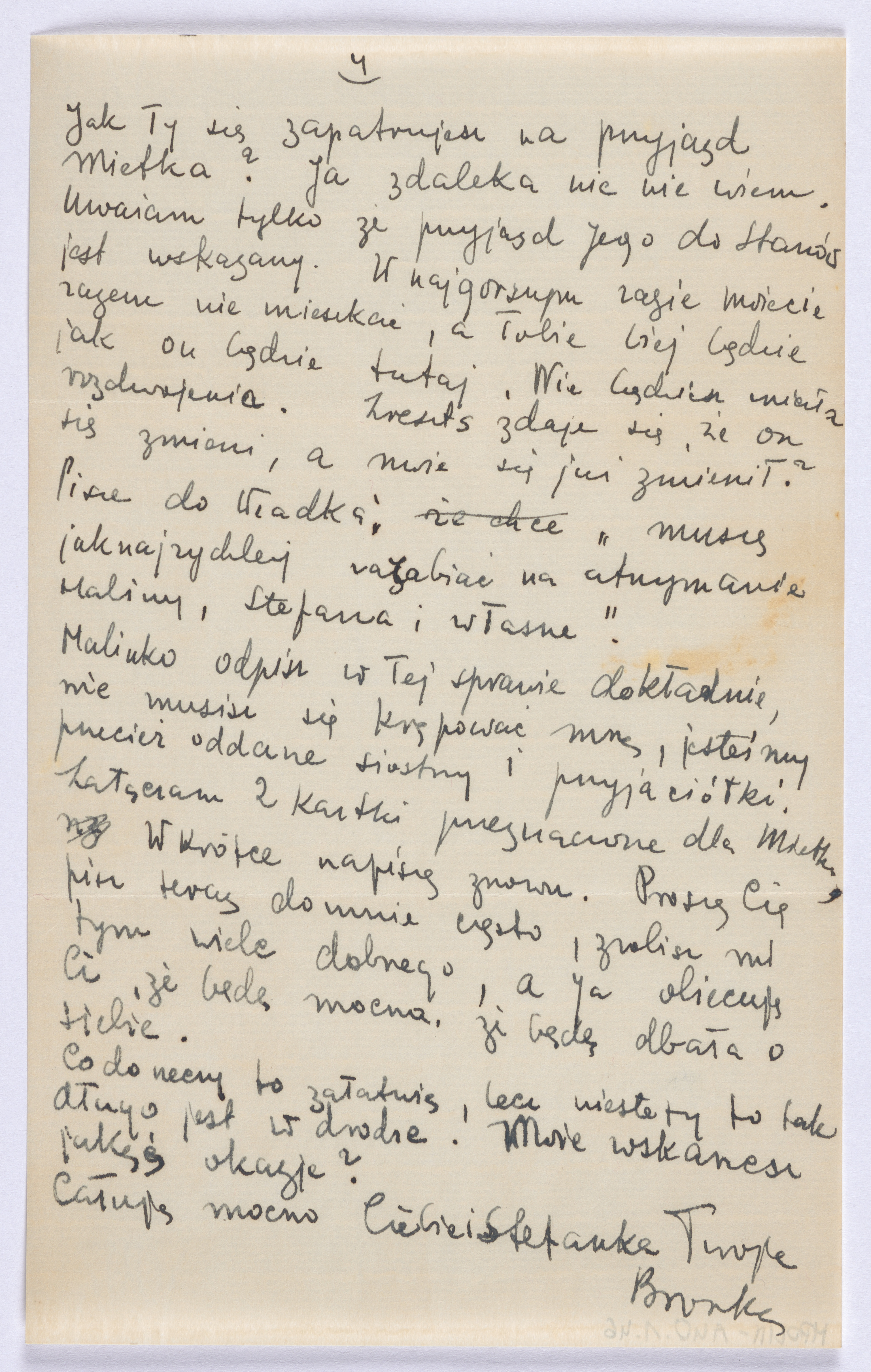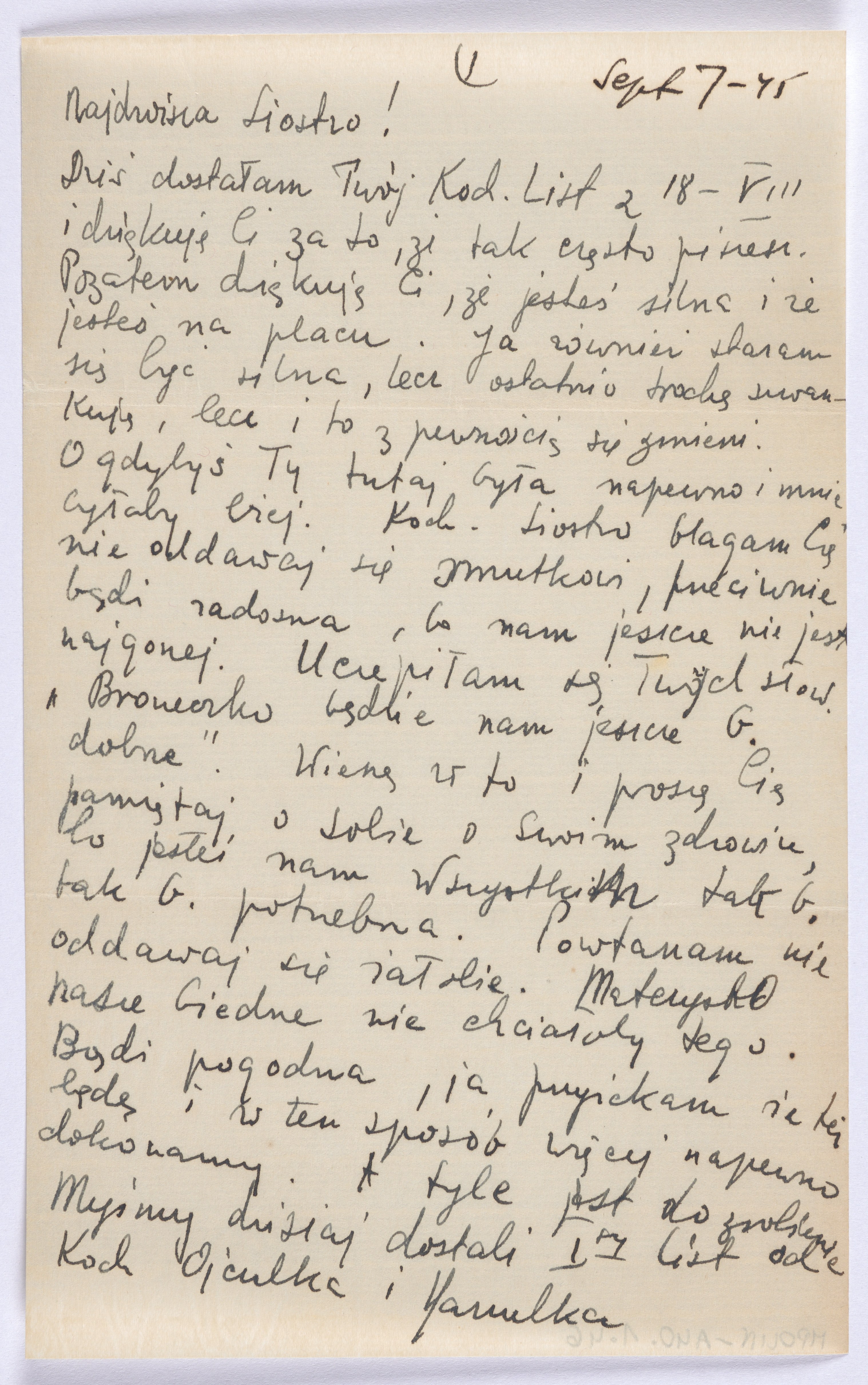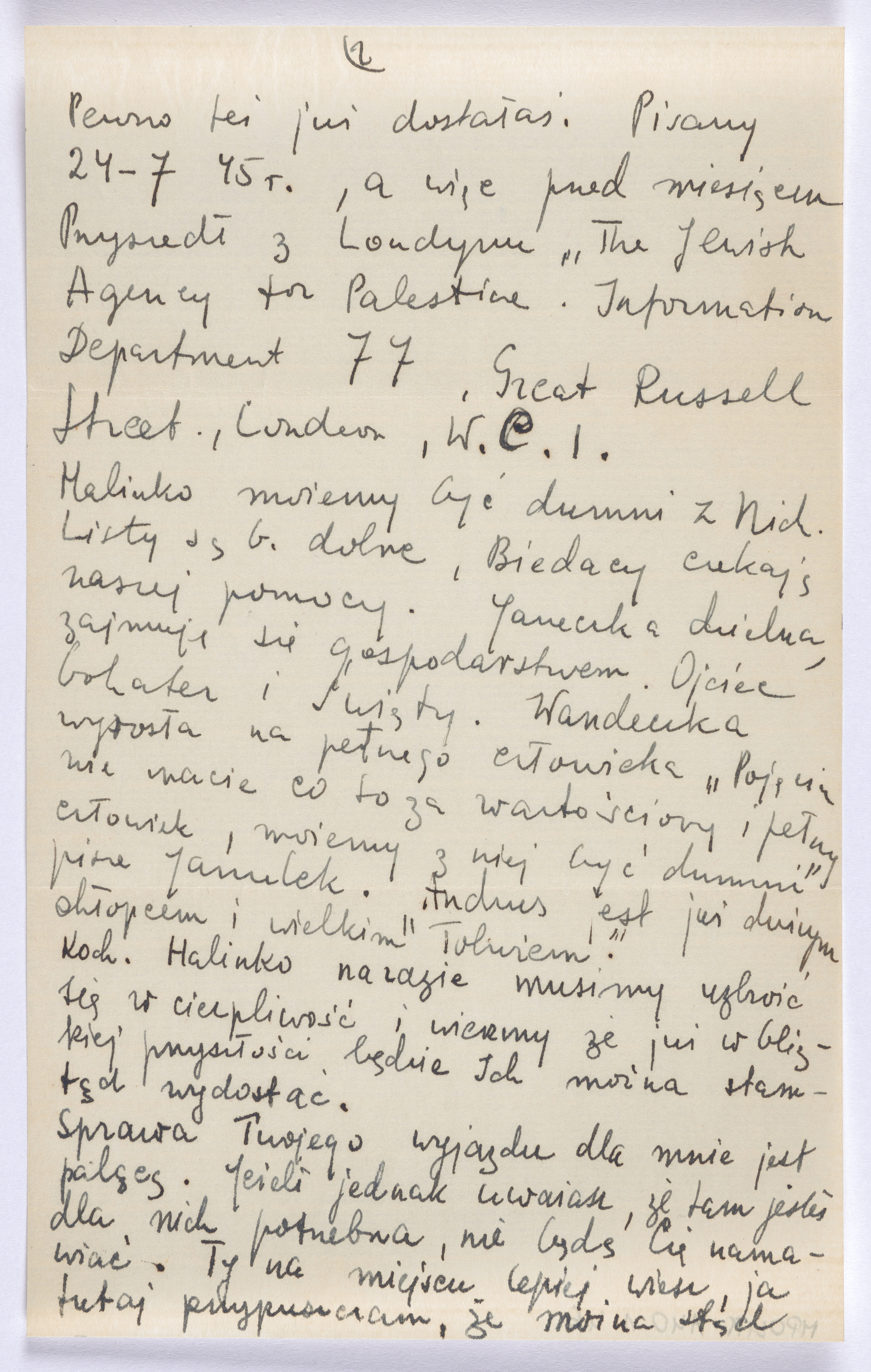 List Bronisławy Roller do siostry na 4 kartach. Z treści listu (pisownia oryginalna): „Powtarzam nie oddawaj się żałobie. Matczysko nasze biedne nie chciałoby tego. Bądź pogodna, ja przyrzekam że też będę i w ten sposób więcej napewno dokonamy. A tyle jest do zrobienia. Myśmy dzisiaj dostali Iszy list od Koch[anego] Ojczulka i Hanulka. Pewno też już dostałaś. Pisany 24-7 45 r., a więc przed miesiącem. Przyszedł z Londynu, The Jewish Agency for Palestine. Information Department 77, Great Russell Street, London, W.C.I. […] | Sprawa Twojego wyjazdu dla mnie jest paląca. Jeżeli jednak uważasz, że tam jesteś dla nich potrzebna, nie będę Cię namawiać. Ty na miejscu lepiej wiesz, ja tutaj przypuszczam, że można stąd będzie też to samo zrobić.”