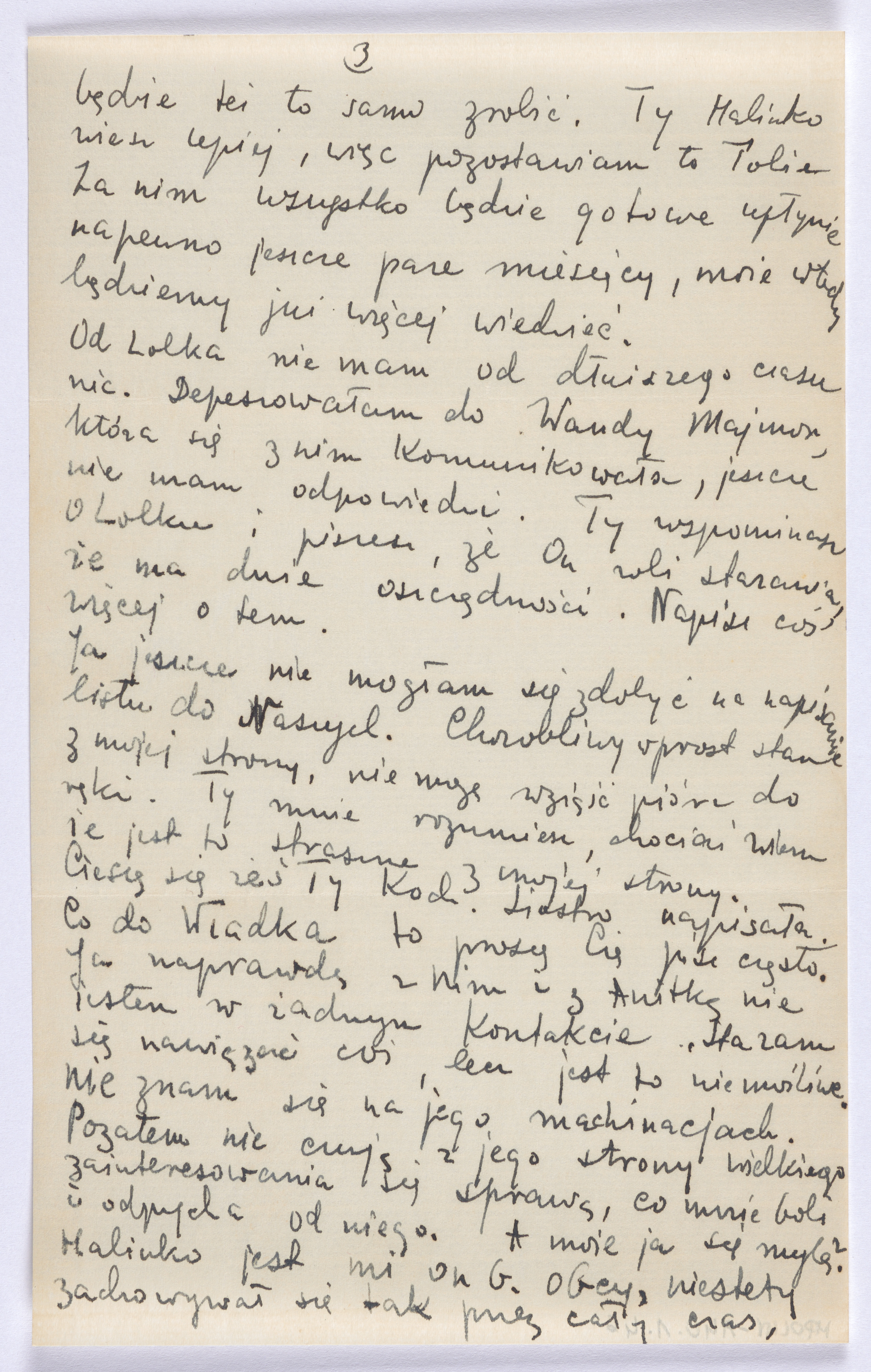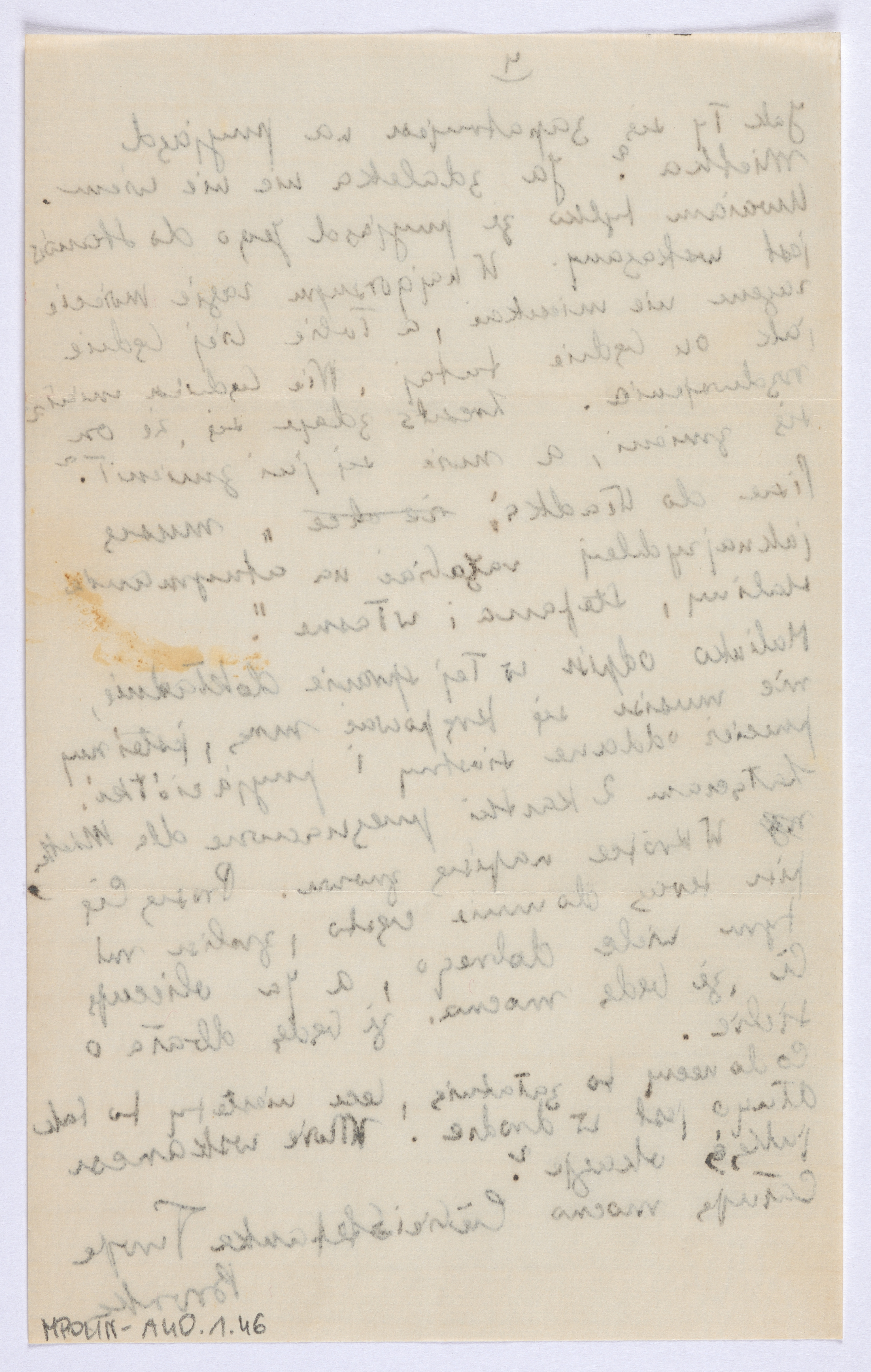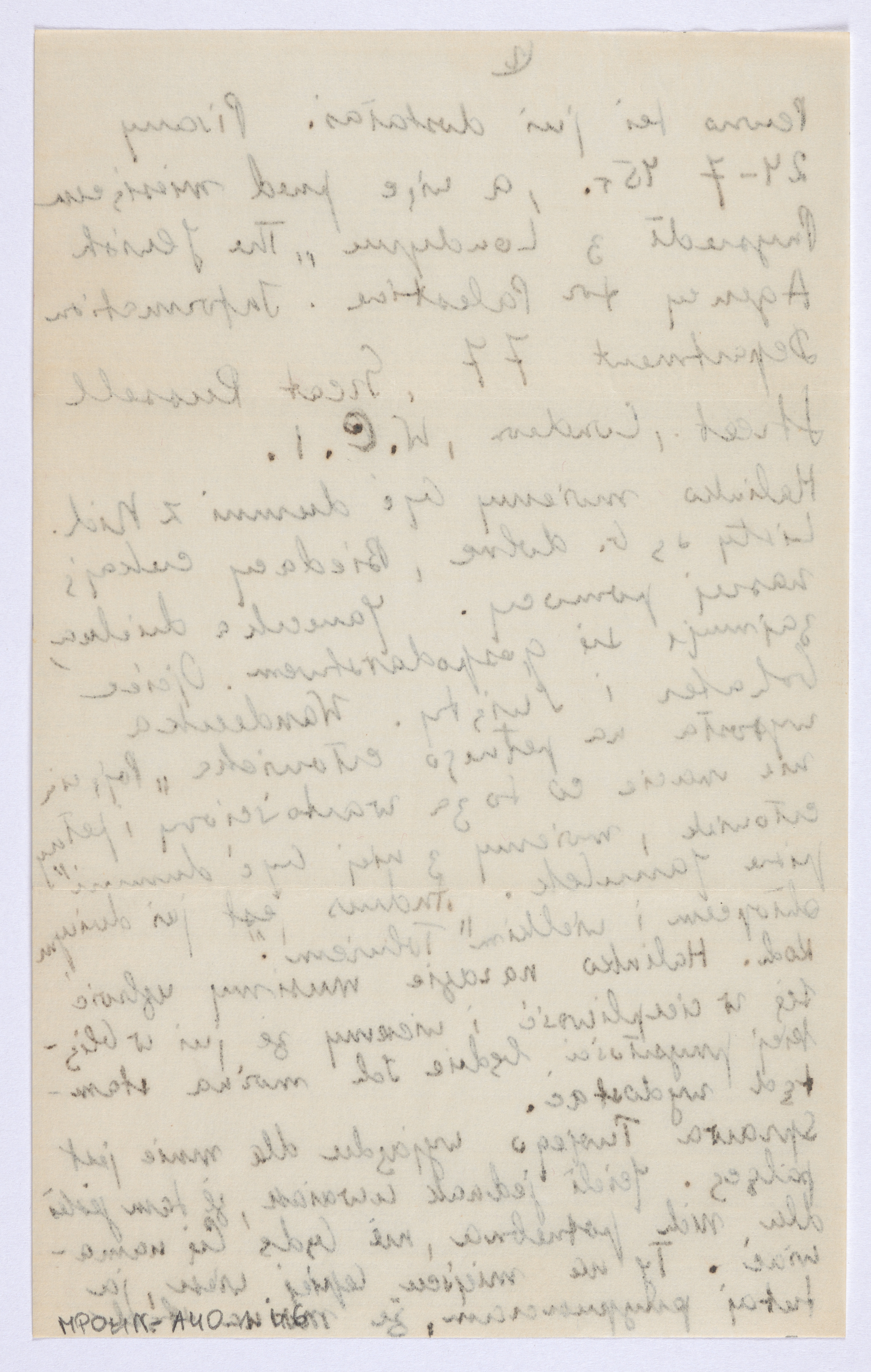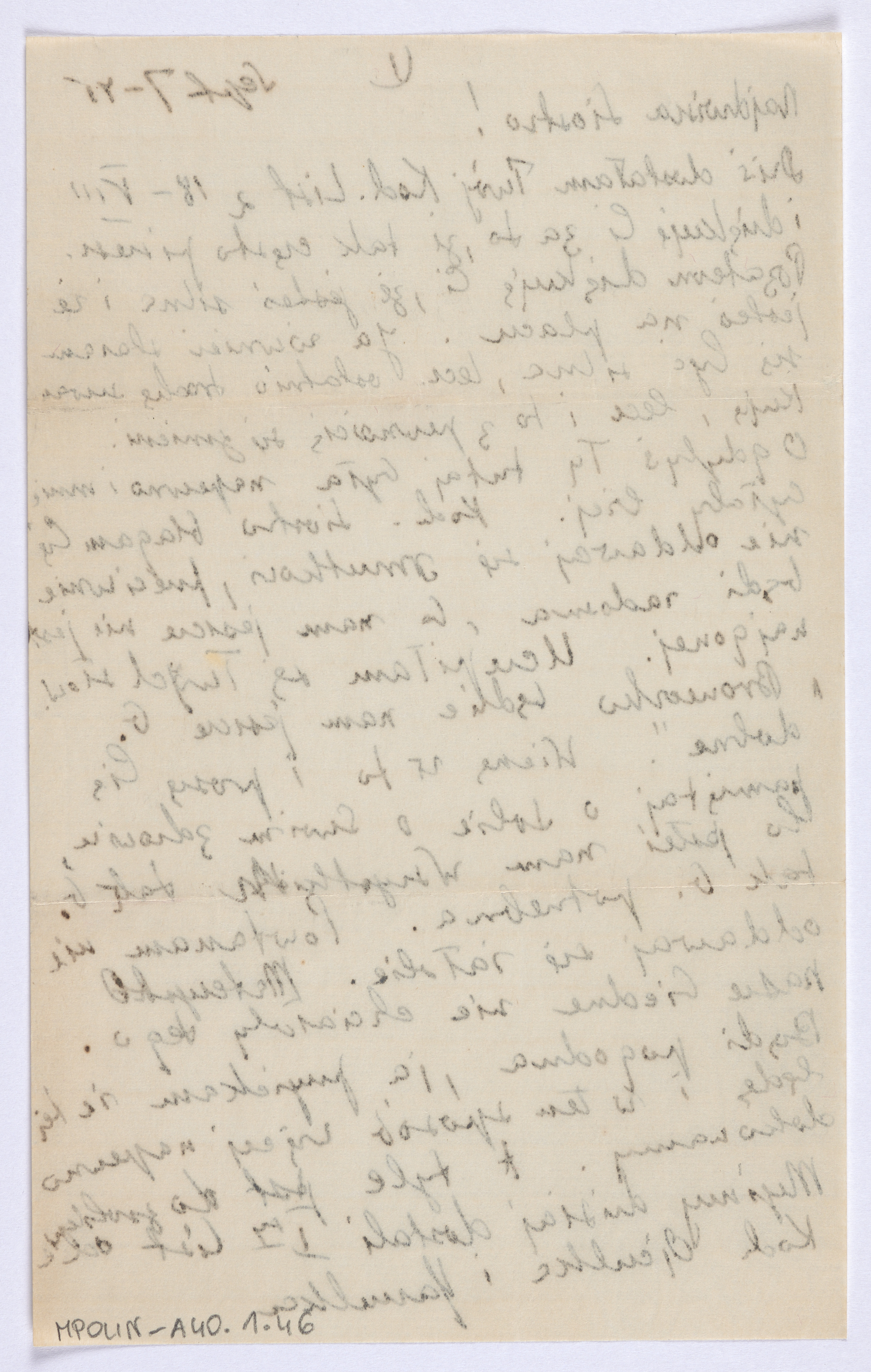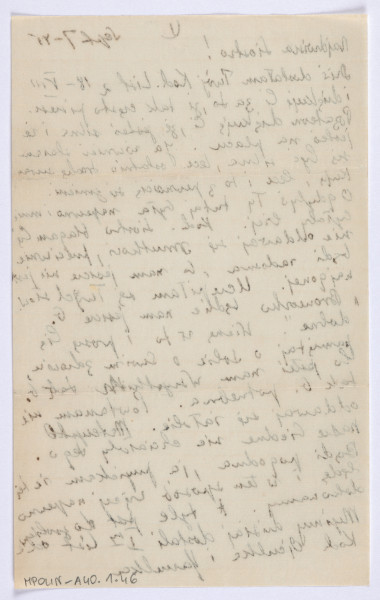List Bronisławy Roller do siostry na 4 kartach. Z treści listu (pisownia oryginalna): „Powtarzam nie oddawaj się żałobie. Matczysko nasze biedne nie chciałoby tego. Bądź pogodna, ja przyrzekam że też będę i w ten sposób więcej napewno dokonamy. A tyle jest do zrobienia. Myśmy dzisiaj dostali Iszy list od Koch[anego] Ojczulka i Hanulka. Pewno też już dostałaś. Pisany 24-7 45 r., a więc przed miesiącem. Przyszedł z Londynu, The Jewish Agency for Palestine. Information Department 77, Great Russell Street, London, W.C.I. […] | Sprawa Twojego wyjazdu dla mnie jest paląca. Jeżeli jednak uważasz, że tam jesteś dla nich potrzebna, nie będę Cię namawiać. Ty na miejscu lepiej wiesz, ja tutaj przypuszczam, że można stąd będzie też to samo zrobić.”