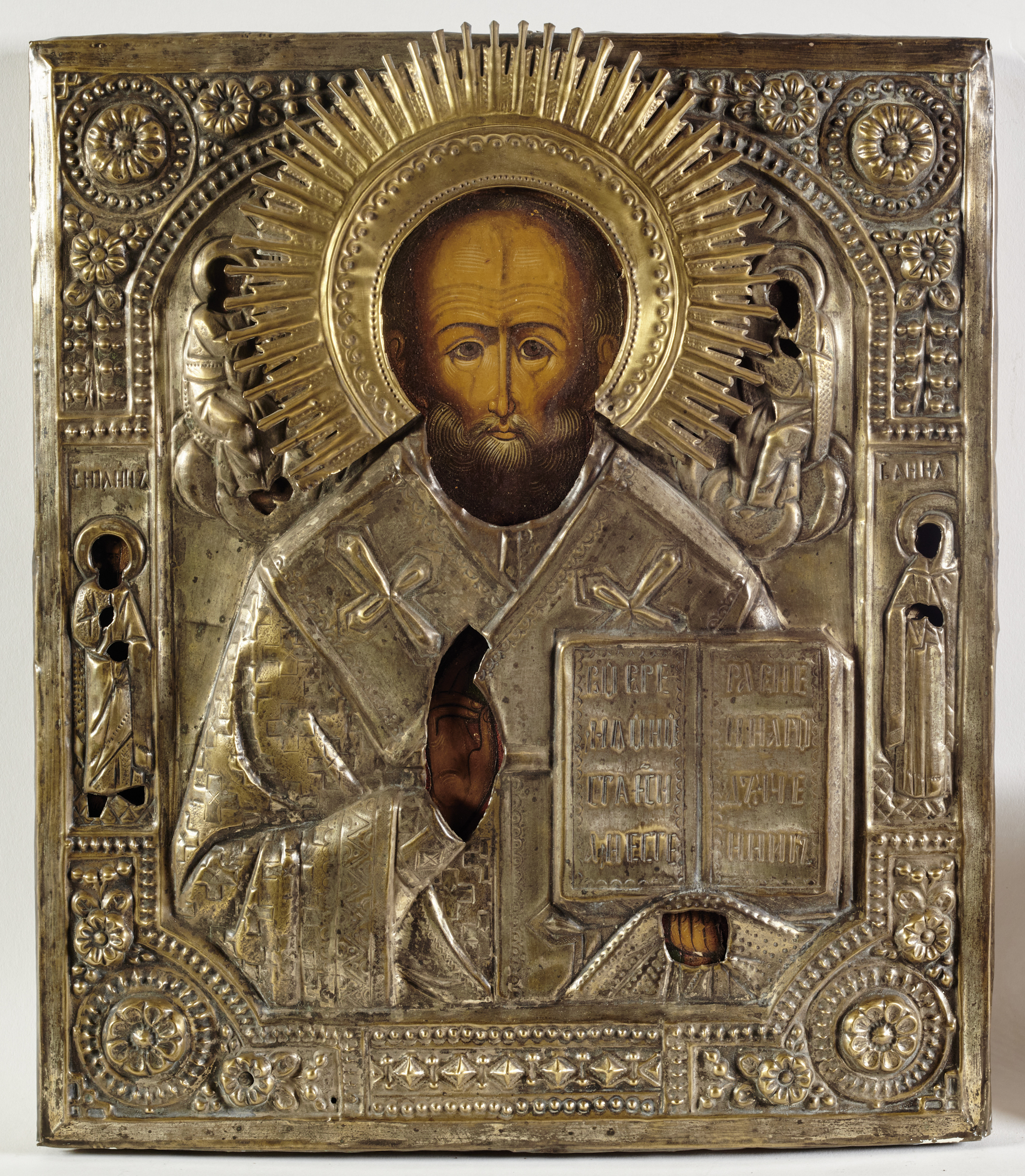 Czczony zarówno we wschodnim jak i zachodnim chrześcijaństwie Mikołaj Cudotwórca był arcybiskupem Mirry w Azji Mniejszej. Żył w III/IV w. w czasach cesarza Dioklecjana i Konstantyna Wielkiego i zasłynął wieloma cudami. Na wschodzie chrześcijaństwa jego kult rozwijał się już od V w. i dotarł na Ruś z Bizancjum. Wraz z kultem pojawiły się najstarsze wizerunki świętego, a przez wieki wykształciło się wiele wariantów jego obrazowania. Na większości ikon św. Mikołajowi już od X w. towarzyszą postacie Chrystusa i Bogurodzicy, którzy naznaczyli świętego na urząd biskupi i podają mu oznaki sprawowanego urzędu – Ewangelię i omoforion. Od XIV w. wizerunki Chrystusa i Bogurodzicy na ikonach św. Mikołaja powiązano w legendą. Mikołaj Cudotwórca miał być uczestnikiem pierwszego powszechnego soboru kościelnego w Nicei w 325 r., na którym zgodnie z opowieścią, miał spoliczkować heretyka Ariusza. Za to wykroczenie św. Mikołaja zdjęto z urzędu biskupiego. Wówczas zjawili się Chrystus z Bogurodzicą przywracając świętemu odebraną za karę godność. Ten legendowy wątek współistniał z innymi opowieściami o cudach św. Mikołaja, gdzie święty uznany był za pierwszego dobroczyńcę w każdej potrzebie, o czym świadczyły liczne obrazy.