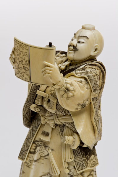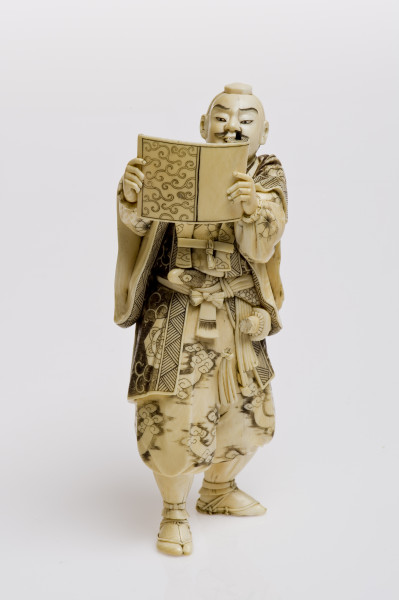 Miniaturowe rzeźby w drewnie lub kości, obecne są w kulturze japońskiej od ponad trzystu lat i należą do jednej z tych dziedzin sztuki japońskiej, która w Europie od drugiej połowy XIX wieku kojarzy się nieodmiennie z oryginalnością i niezwykłością twórczości japońskich artystów. Jest także uważana za zwierciadło japońskich obyczajów, wierzeń, historii, widzenia świata, stosunku do przyrody. Figurka przedstawiająca samuraja ze zwojem jest przykładem dekoracyjnej rzeźby, wykonywanej od 2 połowy XIX w. z kości słoniowej. Rzeźby te nazywane okimono (co po japońsku oznacza ozdobę, ornament), utrzymane były w realistycznej konwencji. Są one jednocześnie popisem wirtuozerii, przejawiającej się w dbałości o najdrobniejsze detale i niezwykle precyzyjnym ich oddaniu, tak by całość była nie tylko starannie opracowana, ale i dekoracyjna. Okimono przedstawiały różne bóstwa, postacie z dalekowschodniej mitologii i literatury, wojowników, postacie z ludu (tragarzy, handlarzy, ogrodników), gejsze itp. Te niewielkie, wolnostojące figury, rzeźbione w kości słoniowej, powstawały przede wszystkim dla kolekcjonerów z Zachodu, wśród których cieszyły się i nadal cieszą wielkim uznaniem. Tworzyli je mistrzowie netsuke, którzy zaczęli wykonywać większe okimono, bowiem zapotrzebowanie na tradycyjne elementy japońskiego stroju malało wraz z coraz powszechniejszym korzystaniem z europejskich ubiorów. Netsuke były to kunsztowne, miniaturowe rzeźby, wykonane z głównie z drewna lub kości słoniowej używane w Japonii od ok. XV w. Służyły jako breloki do zbalansowania przewieszonych przez pas obi sakiewek, tabakierek, przyborów do palenia, puzderek na leki (inrō) itp. Figurka przedstawia mnicha – wojownika Benkeia. Saito Musashibo Benkei (1155–1189) jako postać historyczna był bohaterem wielu legend i sztuk teatralnych, jako wzór lojalności i bohaterstwa. Figurka ze zbiorów toruńskiego muzeum jest ilustracją sceny ze sztuki „Kanjincho” („Lista subskrypcyjna”). Benkei odczytuje z pustego zwoju rzekomy list polecający ze świątyni, pełniący rolę glejtu. Ta brawurowa akcja uratowała życie Minamoto-no Yoshitsune. Benkei był postacią historyczną, ale później obrosła ona na wpół legendarnymi wydarzeniami, które zostały zobrazowane w sztukach teatralnych.
