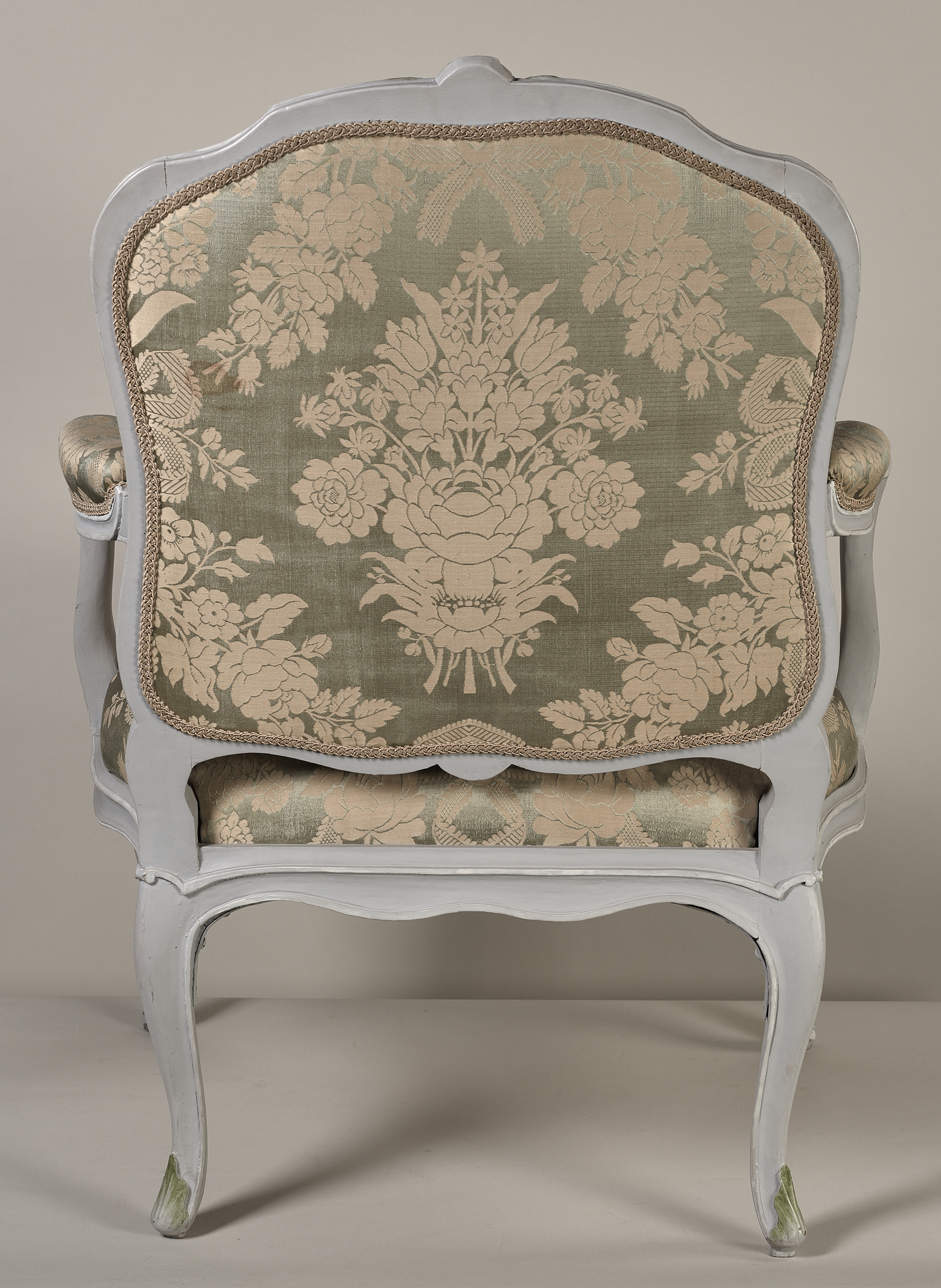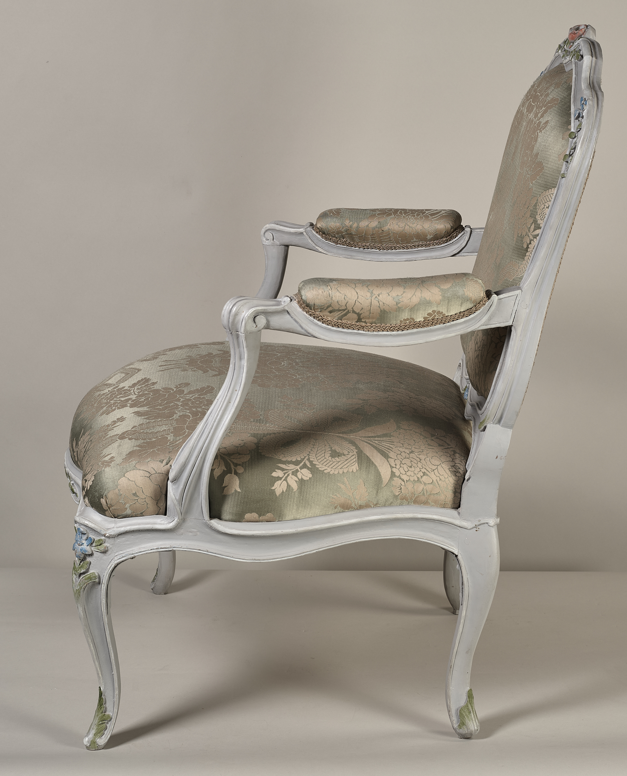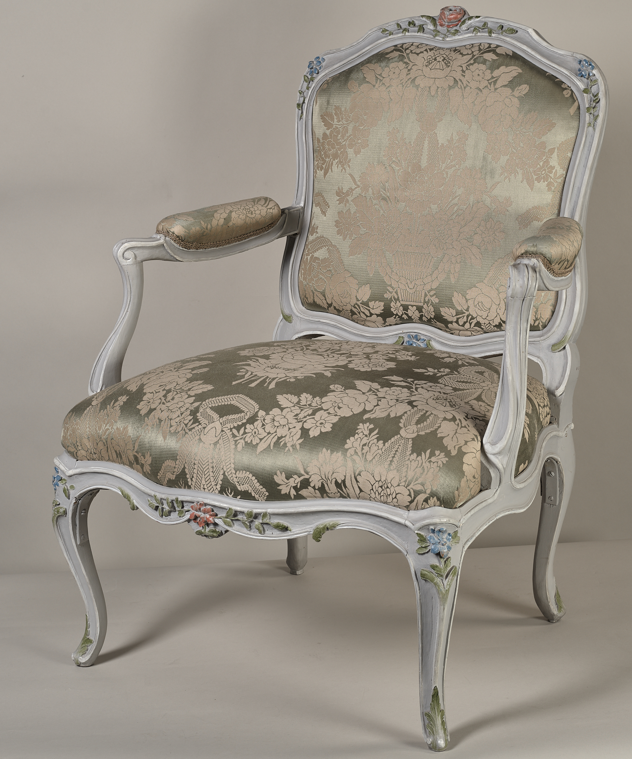 Prezentowany fotel należy do kompletu mebli znajdujących się na wyposażeniu neorokokowego Salonu Narożnego (Rogowego) w reprezentacyjnym zachodnim skrzydle łańcuckiej rezydencji. Fotel jest jednym z czterech (S.1383MŁ; S.1384MŁ; S.1393MŁ; S.4070MŁ) sygnowanych, wykonanych w warsztacie Etienne Saint-Georges (+1737), który pracował pod szyldem „Grand Saint - Georges” przy zamieszkałej przez stolarzy meblowych paryskiej rue de Cléry. Mistrz oznaczał swoje wyroby odciśniętą na drewnie sygnaturą „STGEORGE”, z kółkiem pod mniejszą od pozostałych literą T. Znaku tego używano przez dziesięć lat po śmierci Etienne, gdy warsztatem kierowała jego żona Jeanne-Catherine Gareau, mająca na utrzymaniu czwórkę dzieci. Syn stolarza, Jean Etienne Saint-Georges (1723-1790), ożeniwszy się w 1746 r. i uzyskawszy w 1747 r. uprawnienia mistrzowskie, przejął warsztat i zaczął używać własnej sygnatury JSTGEORGES. Pozwala to określić przedział czasowy wykonania prezentowanego mebla na lata 1725-1747, gdy płynne kształty siedzisk, oparć i nóg oraz kwiatowa dekoracja snycerska wyznaczały modę francuskiego rokoka, zwanego od imienia króla stylem Ludwika XV. Do Łańcuta takie sprzęty kupowała w XVIII w. Izabela z Czartoryskich, żona marszałka wielkiego koronnego Stanisława Lubomirskiego. Pod koniec XIX w., w czasie przebudowy zamku podjętej przez Romana i Elżbietę Potockich, projektowanej przez Armanda Beauque i Alberta Pio, wiele dawnych mebli odnowiono, zmieniając tapicerkę na nową . Elżbieta z Radziwiłłów Potocka w swoich wspomnieniach napisała: „Tapicerzy przyjeżdżali z Wiednia Tepser i z Paryża Bucour. Wyciągało się stare meble z pod strychu i z różnych służbowych pokoi – całe urządzenie w salonie Boucher i w salonie rogowym, konsola drewniana w galerii, stały porozrzucane i zamalowane brunatną farbą po garderobach i na nich lampy i buty czyścili.”