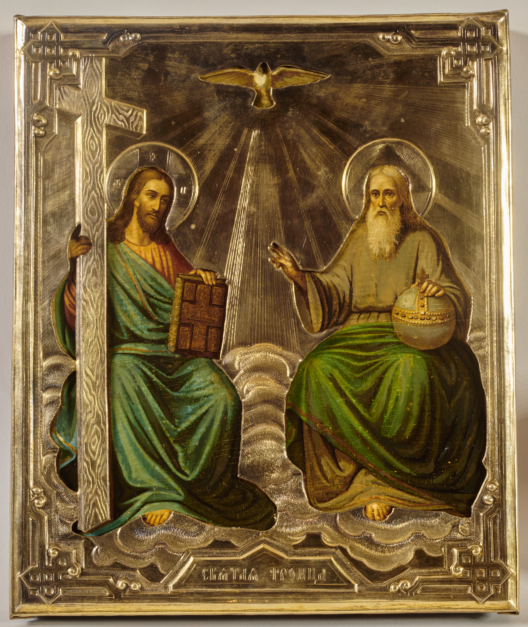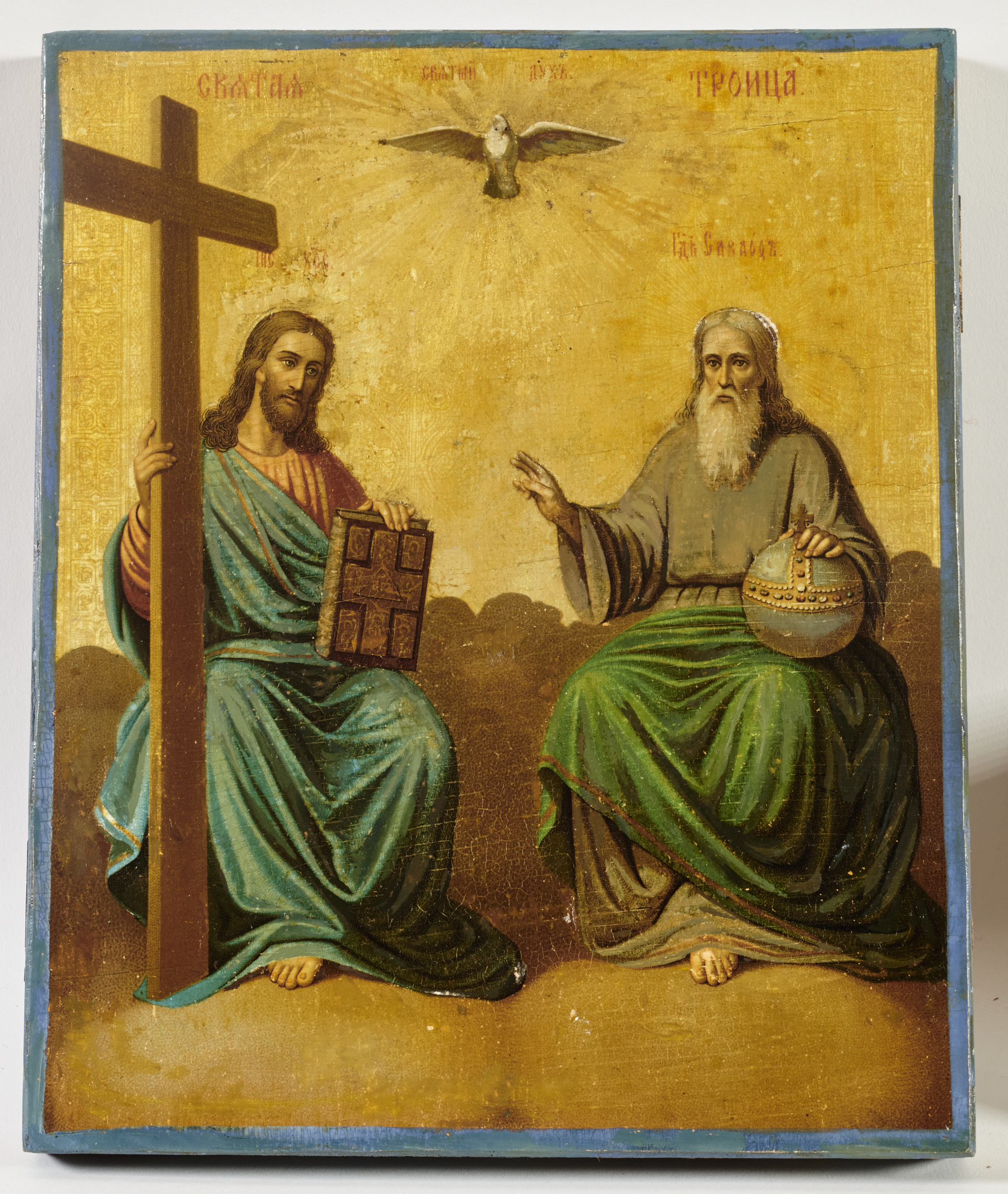 Prezentowana ikona należy do niekanonicznych wariantów Trójcy Świętej tak zwanej Nowotestamentalnej. W rosyjskim prawosławiu przedstawienie określa się jako „Współtronowanie”. Wizerunek ukazuje Trójcę Świętą w Postaciach Boga Ojca, Syna Bożego i unoszącego się nad nimi w formie gołębicy Ducha Świętego. Tego typu ikony pojawiły się we wschodnim chrześcijaństwie w XIV w. pod wpływem sztuki zachodnioeuropejskiej, rozprzestrzeniły się w Bizancjum i na Bałkanach. Na terenie moskiewskiego prawosławia najstarsza znana pochodzi z XVI w. (sobór Zwiastowania Pańskiego na moskiewskim Kremlu). Dopuszczalność obrazowania niewidzialnych Ojca i Ducha Świętego ustalił moskiewski sobór cerkiewny w latach 1553-1554. Uzasadnieniem dla wizerunku stała się Księgę Daniela. W proroczej wizji Daniel ujrzał Przedwiecznego Starca (Dn 7, 3-14). Sobór wyjaśnił, że malarze nie ukazują istoty Niewidzialnego Boga, a jedynie postać, w której On objawił się w Starym Testamencie. Jednakże sto lat później Wielki Sobór Moskiewski w 1667 r. całkowicie zakazał wykonywanie wizerunków Trójcy Świętej Nowotestamentalnej. Odwołano się do tekstu Jana Ewangelisty, który pisał, że bezcielesny i niewidzialny Bóg Ojciec (J 1, 18) został nam objawiony wyłącznie w osobie Syna Bożego. Zatem obrazowanie Boga Ojca jest możliwe jedynie w formie symbolicznej. Najstosowniejszą formą tego typu przedstawień jest obrazowanie Trójcy Świętej w postaci Syna Bożego Wcielonego, zatem widzialnego (Trójca Święta Starotestamentalna, np. słynna ikona Rublowa). Święty Synod Cerkwi Konstantynopolitańskiej ogłosiła zakaz wykonywania niekanonicznych wariantów wizerunku dopiero w 1776 r. Pomimo zakazów nadal we wschodnim chrześcijaństwie pojawiały się ikony Trójcy Świętej Nowotestamentalnej.