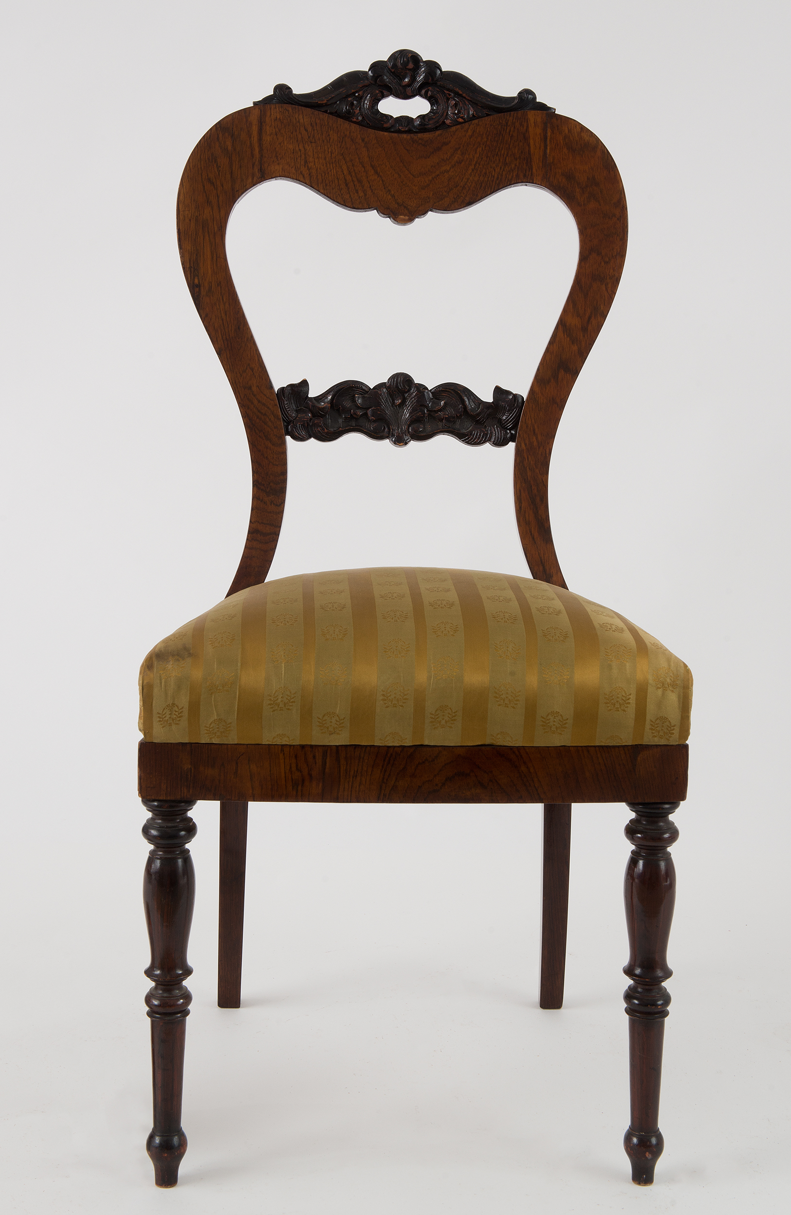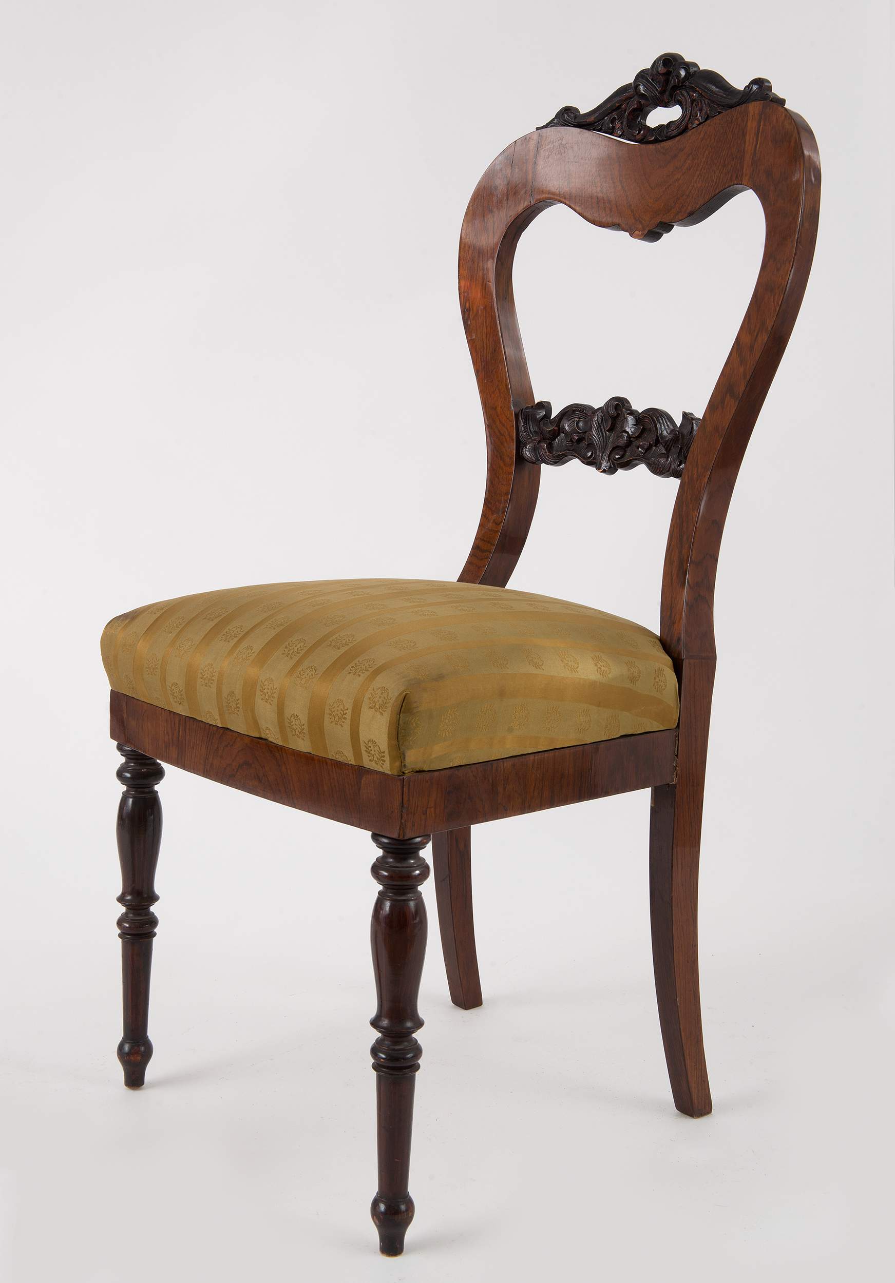 Krzesło o trapezoidalnym siedzisku, na czterech nogach z których przednie są tralkowo toczone, zaś tylne o przekroju kwadratowym, lekko zbieżne, nieco odgięte ku tyłowi, płynnie przechodzą ramiaki boczne oparcia, esowato odchylonego do tyłu. Oparcie ażurowe o kształcie balonowym, szersze u góry, w dolnej partii przewężone i związane rzeźbioną łączyną o motywach roślinnych. Szerokiego ramiak górny z wyraźnym ugięciem, od dołu ozdobnie podkrojonym, od góry ozdobiony ażurowym rzeźbionym zwieńczeniem o motywach roślinno-muszlowych. Ramiaki boczne oparcia zwężające się ku dołowi, tuż nad siedziskiem przełamane, poniżej przełamania przechodzące w tylne nogi. Okrzynienie proste. Ramiaki oparcia, oskrzynienie oraz tylne nogi pokryte fornirem palisandrowym, przednie nogi oraz elementy rzeźbione lakierowane, w kolorze ciemnobrązowym. Siedzisko tapicerowane, obite złotym adamaszkiem w parzyste kremowe pasy pokryte deseniem z wieńców laurowych.