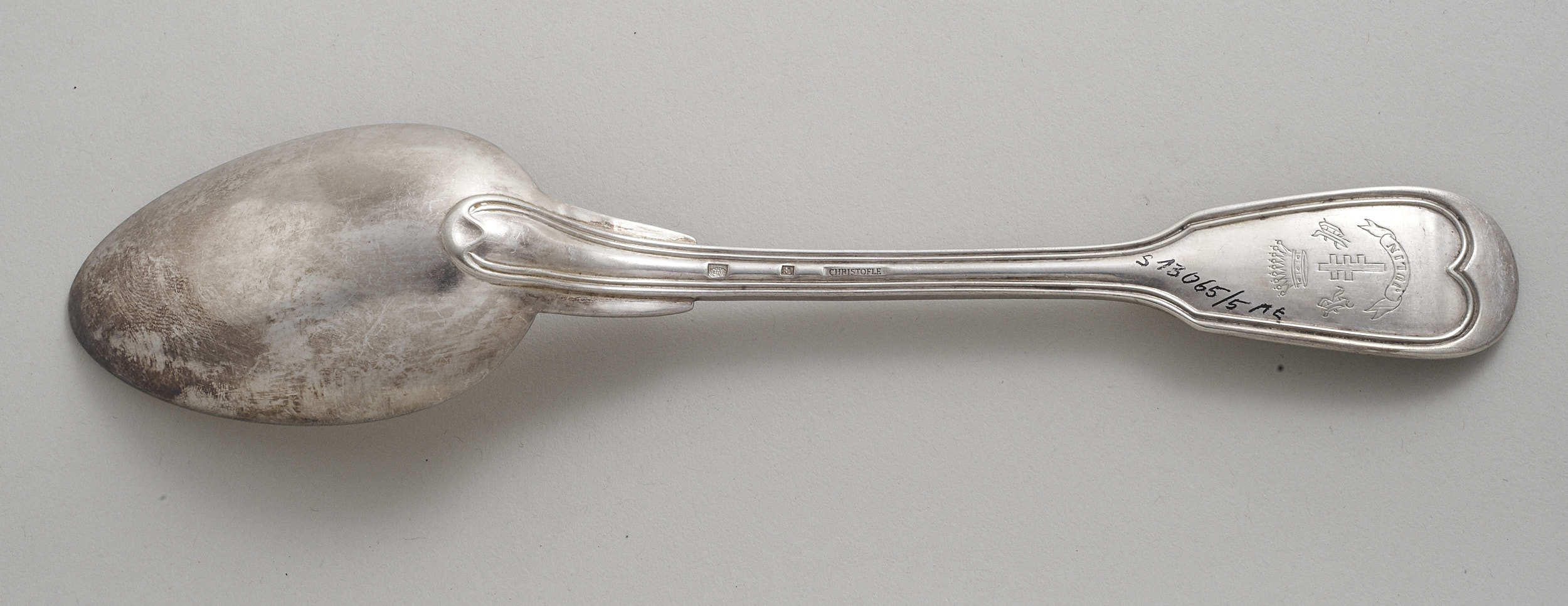 Łyżka z elipsowatym czerpakiem węższym przy zakończeniu i szerszym przy trzonku. Trzonek płaski z rozszerzonym zakończeniem ozdobiony podwójnym profilowaniem. Na rewersie w dolnej części trzonka widoczna korona hrabiowska a pod nią herb Potockich - Pilawa. Po bokach symetrycznie rozmieszczone litery R i P a pod herbem widoczna szarfa z napisem „Julin”. Ponadto na przewężeniu trzonka wybito punce i stempel producenta „Christofle”.