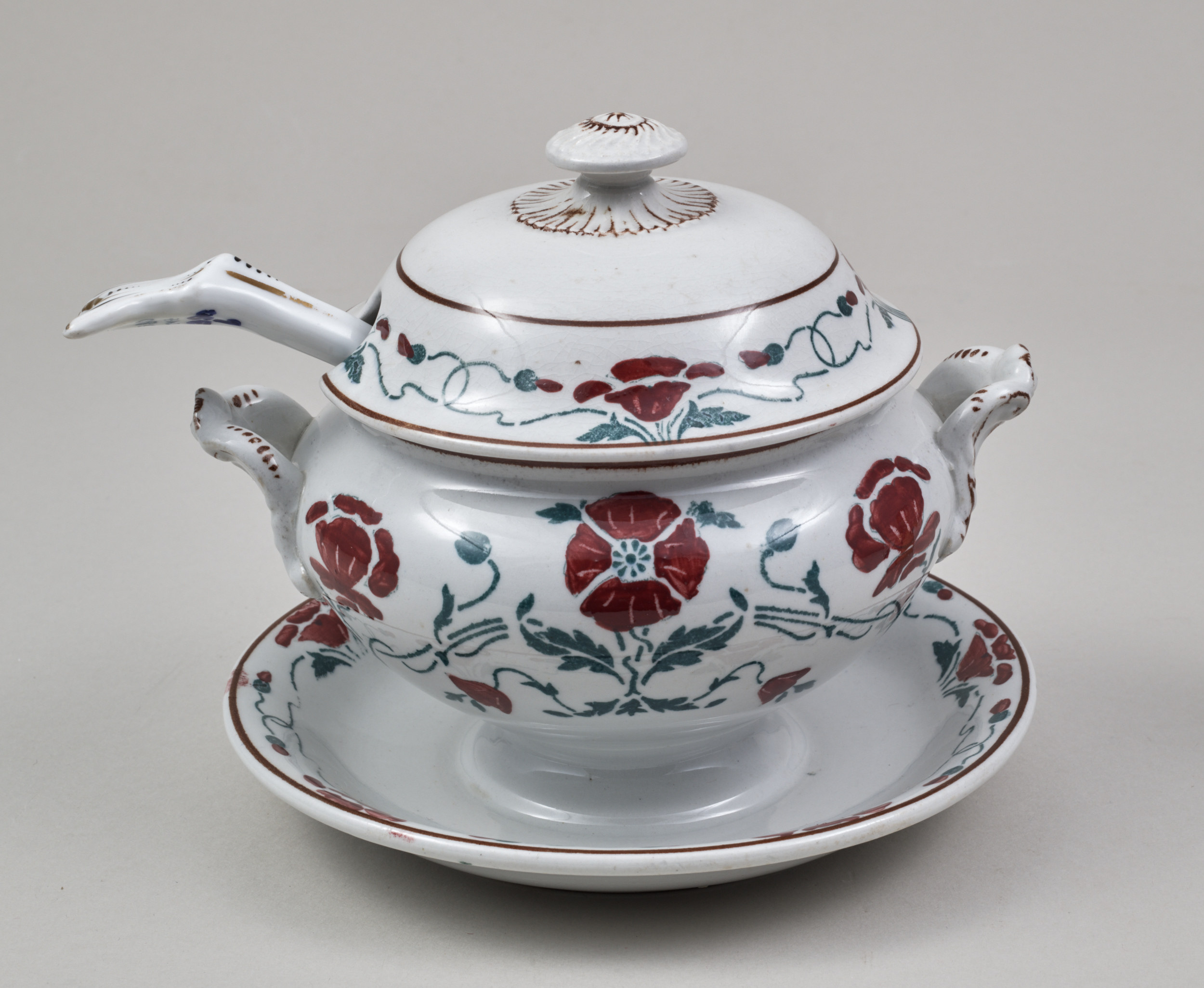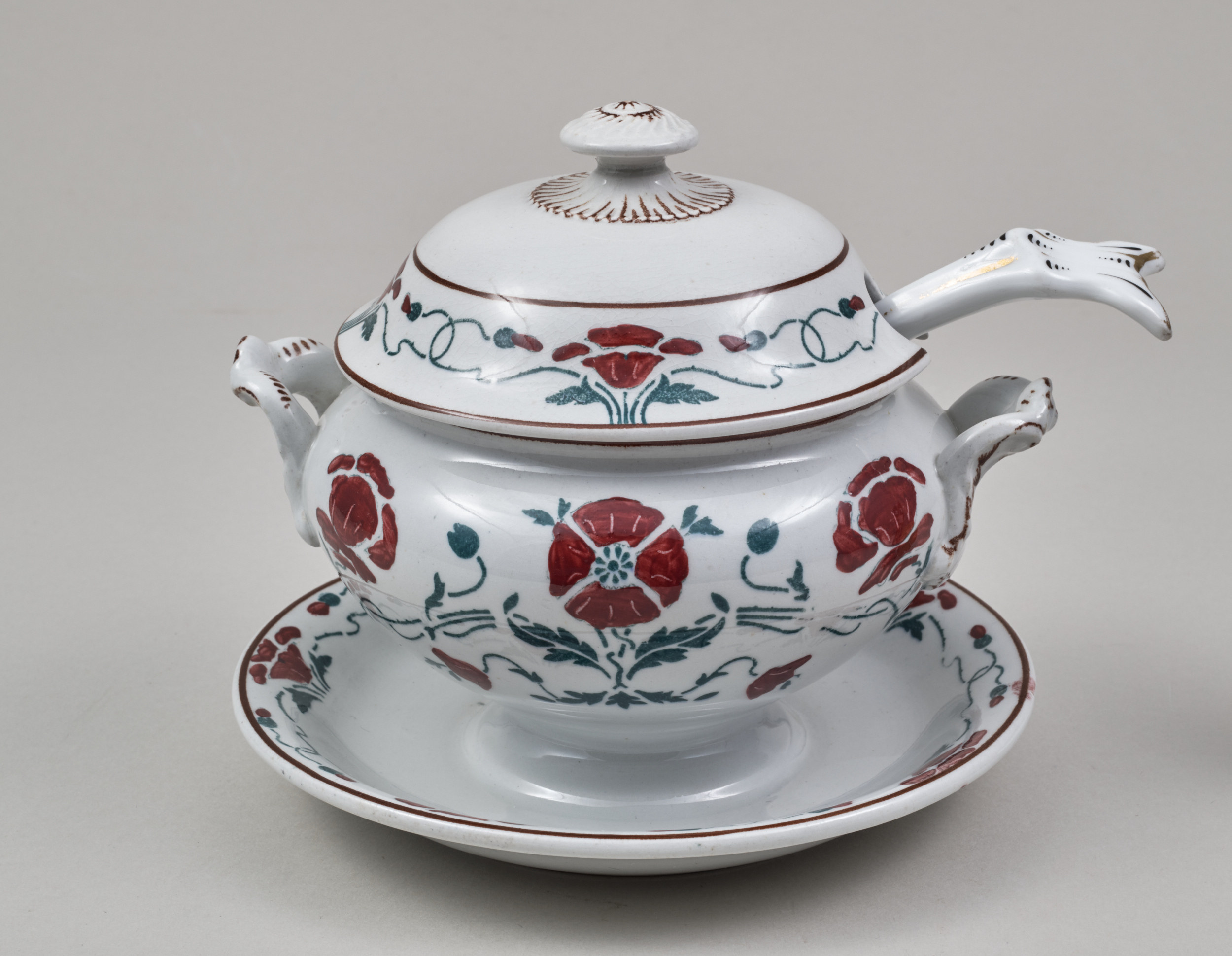 Sosjerka – niewielkie, fajansowe naczynie do sosów, założone na planie koła, składające się z pękatej wazki, jednorodnie połączone z miseczkowatą podstawką w rodzaju spodka i kopulastej pokrywki mającej wcięcie na łyżkę. Kształt wazki daje się porównać do odwróconego stożka. Otwór naczynia dość szeroki, a stopka tak mała, że w wypadku gdyby wazka była wolnostojąca, to nie zapewniłoby jej statyczności. Do szczytu wybrzuszenia wazki przylegają częściowo dwa poziome uchwyty, których kształt kojarzy się z ozdobny kartuszem (dwa esowate ramiona górą spięte guzem, a dołem wachlarzowatym grzebieniem). Uchwyty zdobi plastyczny motyw liści i kwiatu, częściowo podrysowanych brązem. Pokrywka uwypukla się na bliskiej odległości od brzegu i kończy guzowatym uchwytem, mającym za podstawę dużą drobnolistną rozetę, rozłożoną na spłaszczony szczyt wypukłości. Czoło uchwytu pokrywa reliefowana wirująca rozetka, częściowo podrysowana brązem. Brzeg pokrywki (wysunięty ku przodowi, poza obręb otworu wazki) przerywa w jednym miejscu dość głębokie wcięcie, mieszczące swobodnie wystający trzonek łyżki. Naczynie zdobi dekoracja malarska złożona z dwubarwnego wzoru maków, stylizowanych w duchu umiarkowanej secesji. Wzór kwiatowy naniesiony mechanicznie, przez szablon. Obydwie strony brzuśca wazki wypełnia umowny bukiet złożony z pięciu kwiatów, z których jeden stanowi oś kompozycji. Wokół brzegu miseczkowatego spodka i brzegu pokrywki biegnie podobny wzór przyjmujący układ pasowy. Na ogniwo tego składa się kwiat altermowany dwoma paskami. Dekorację malarska naczynia uzupełniają jeszcze 4 prążki, z których pierwsze dwa obrzeżają krawędź spodka i otworu wazki, a pozostałe dwa ujmują wzór zdobiący pokrywkę. Sygnatura warsztatu - kotwica w owalnym polu, pod nią napis: S.B. & S / ENGLAND oraz sygnatura magazynu londyńskiego SOUTH AUDLEY S/ T. GOODE & Co / LONDON. W. Pomiędzy nimi trzy małe, bordowe kropki. W dużej odległości od opisanych znaków występuje cyfra „4”, stemplowana w kolorze czarnym. Duża łyżka porcelanowa, biała odznaczająca się oryginalnym kształtem, dotyczącym szczególnie czerpaka i końcówki trzonka. Czerpak duży, głęboki, przypominający połówkę gruszki, węższym końcem skierowany ku przodowi, gdzie występuje załamanie w dół, powstałe jakby poprzez skośne ścięcie grubego prętu, którego przekrój kojarzy się z rybim ogonem. Dwom trójkątnym rożkom końcówki trzonka odpowiadają podobne dwa rożki sterczące od spodu czerpaka - w miejscu wyjścia trzonka. Te cztery różki umożliwiają poziome położenie łyżki. Łyżkę ozdabia minimalne złocenie, znajdujące się tylko na końcówce trzonka, gdzie występuje w postaci konturu i drobnych kresek podkreślających jego formę. Obiektowi temu brak znaku warsztatu, jest on najprawdopodobniej wyrobem czeskim z 1. poł. XIX w.