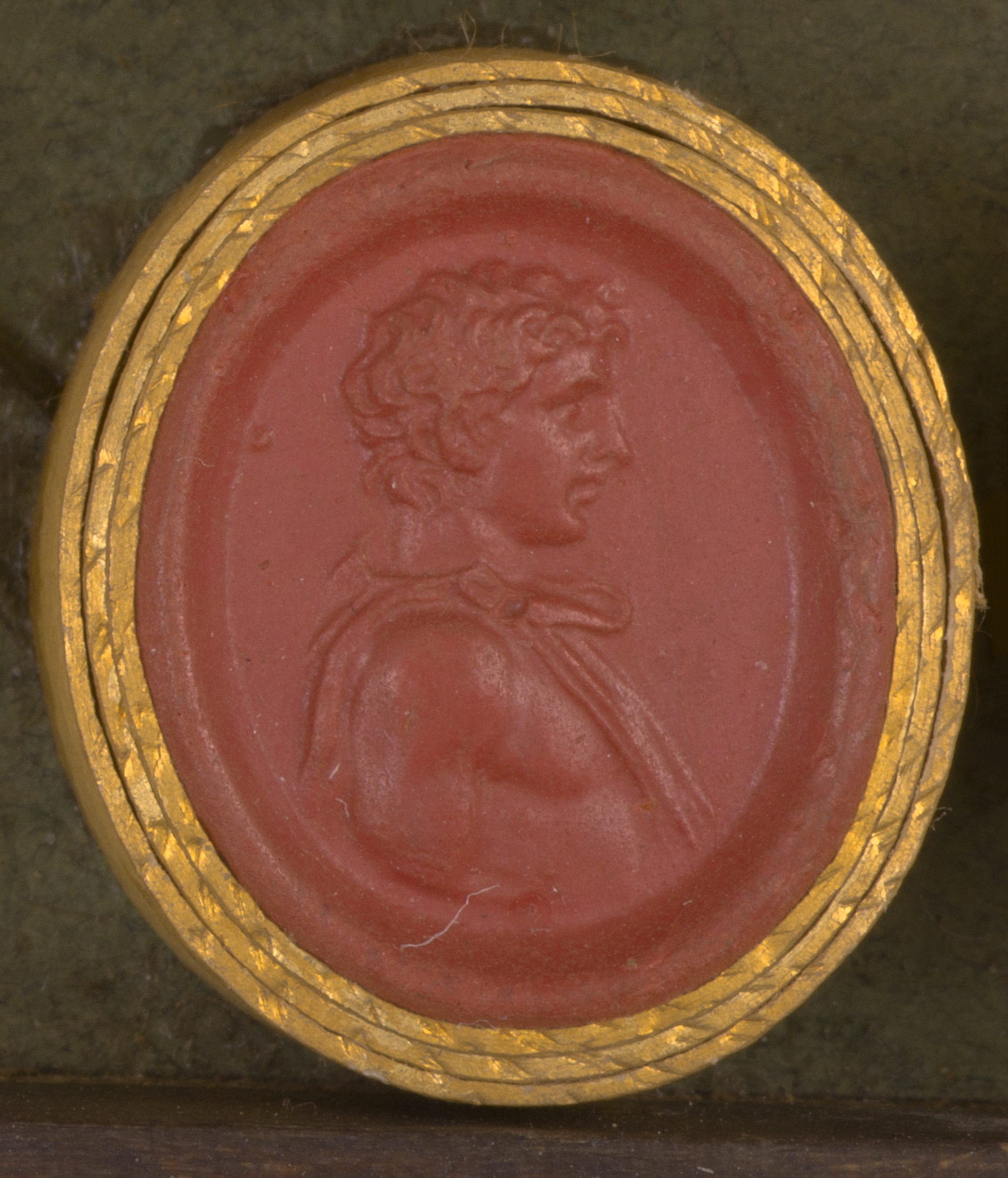 Na owalnym, wypukłym wycisku gemmy, na płaskim tle, obwiedzionym wysoką krawędzią przedstawiony jest prawy profil popiersia mężczyzny w krótkich kręconych włosach, z płaszczem zapiętym na prawym ramieniu. W daktyliotece Lipperta znajduje się wycisk z bardzo podobnym przedstawieniem, według badacza jest to postać Antinousa faworyta Hadriana. Bardzo możliwe, że Antinous został tu ukazany jako Herakles. Wycisk jest identyczny jak opisany w „Dactyliothecae universalis” Philippa Daniela Lipperta.