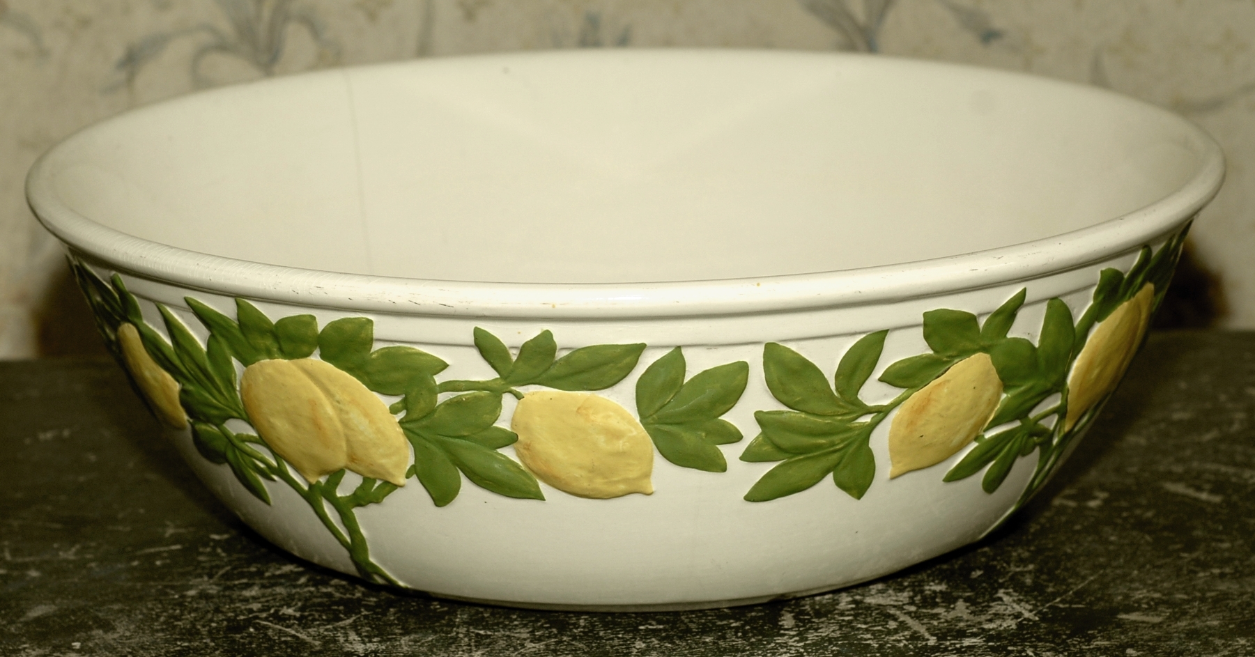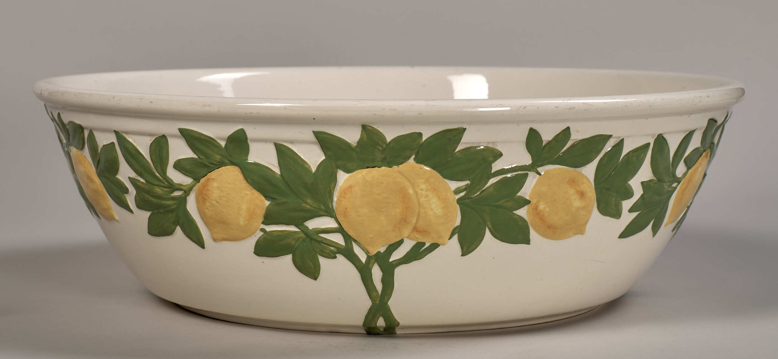 Miednica toaletowa, okrągła, z serwisu toaletowego. Dekoracyjny motyw w górnej części naczynia zdobiony plastycznym roślinnym ornamentem owocującego cytrynowego drzewa. Kolorystycznie upiększony żółto, pomarańczowy oraz zielony na białym tle. Na dnie miednicy drukowany czarny znak fabryczny, napis niebieskim lakierem: S.9564 MŁ.