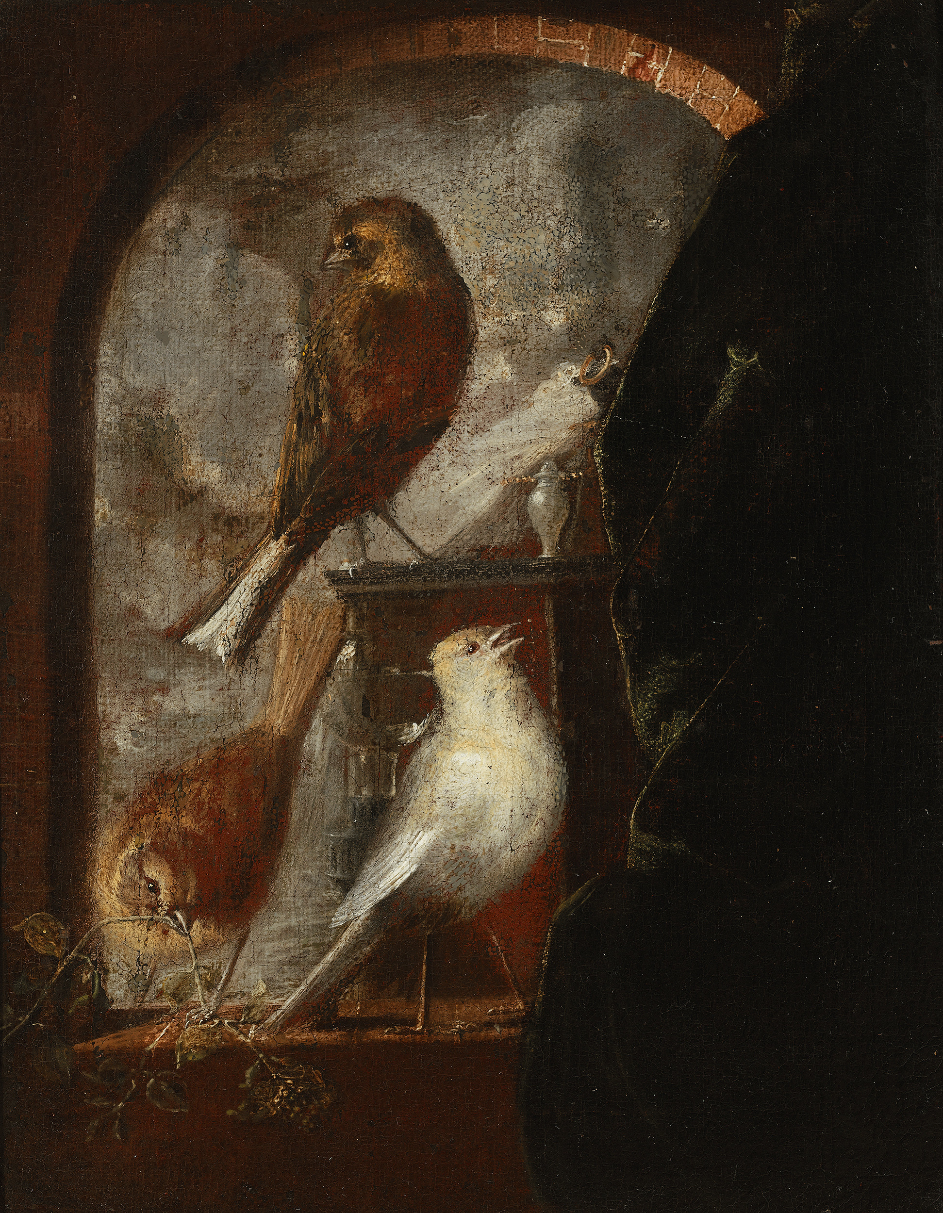 Tajemniczy układ ciemnej draperii przysłaniającej blisko połowę kompozycji drugie pół pozostawia wystarczająco wyeksponowane by dostrzec nań trzy ptaki. W obrębie zakończonej arkadką wnęki przedstawione są trzy ptaszki (raczej – mimo tradycyjnego tytułu – nie są to trznadle). Dwa przechadzają się na parapecie. Ten po lewej trzyma w dziobie gałązkę, drugi śpiewa. Trzeci spoczął na wysokim szklanym pucharku i cieszy się dobrym widokiem na najbliższe otoczenie. Zaobserwowana przez malarza historyjka w ostatecznym efekcie przypomina ilustrację do jakiejś bajki/baśni. Ten pieczołowicie wykończony obraz niesie w sobie treści, których interpretacje mogą być liczne i wielorakie.