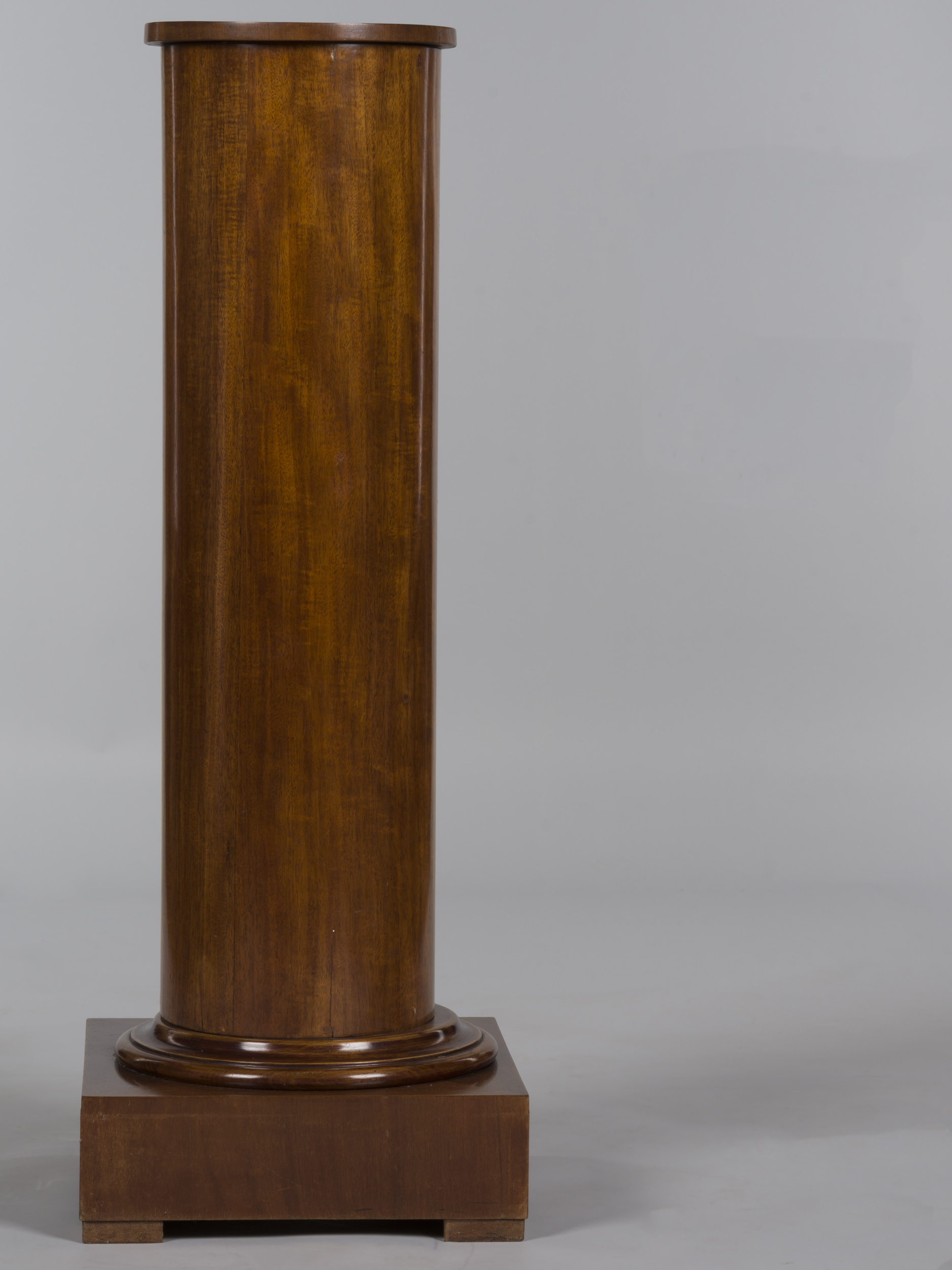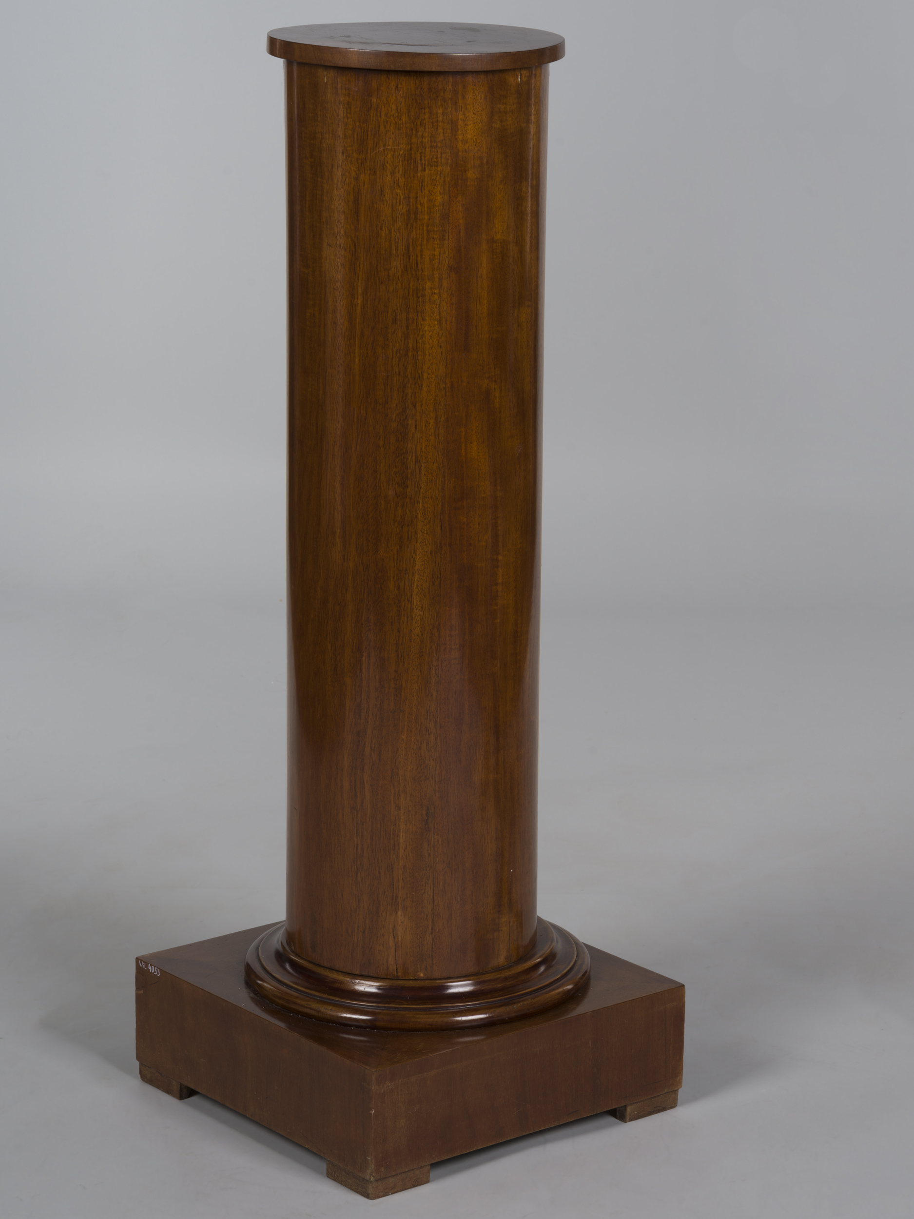 Postument na niskiej kwadratowej podstawie o czterech płaskich, prostych nóżkach. Podstawa pusta w środku. Trzon postumentu cylindryczny, opatrzony u dołu toczoną płaską bazą składającą się w przekroju od góry do dołu z simy i odwróconej simy. Zwieńczenie postumentu stanowi okrągły, lekko wystający drewniany blat.