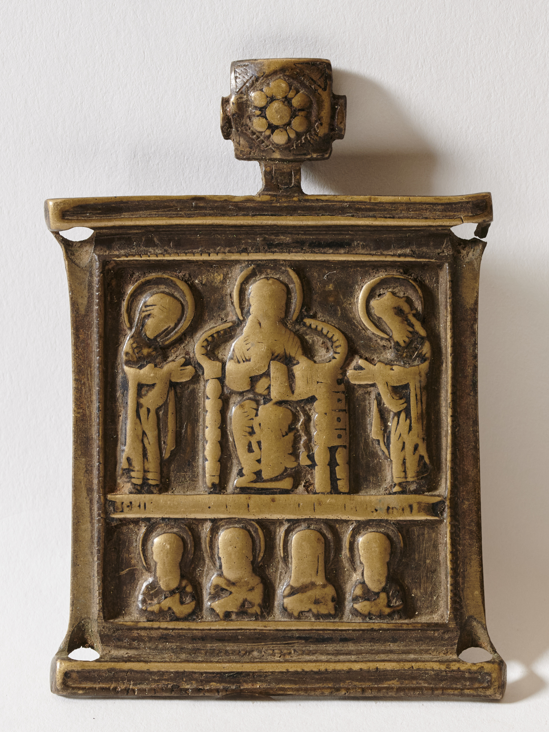 Odlewane z mosiądzu ikony były znane na ziemiach Rusi od początku przyjęcia chrześcijaństwa. Później zostały one spopularyzowane przez staroobrzędowców, którzy nie uznali reformy liturgicznej moskiewskiego patriarchy Nikona w latach 1654 – 1659. Prezentowany obiekt stanowi środkowe skrzydło trójdzielnej ikony (tryptyku) z przedstawieniem Deesis. Z greckiego języka Deesis oznacza błagalną prośbę – modlitwę, którą Kościół za pośrednictwem świętych zanosi przed tronującym Zbawicielem. Początki ikonografii wizerunku sięgają we wschodnim chrześcijaństwie VI-VII w. Przedstawienie jest tematem jednego z rzędów przegrody ołtarzowej zwanej ikonostasem, ukształtowanej na Rusi w XVI – XVII w. W podstawowym wariancie ukazane są trzy osoby: tronujący Chrystus – Pantokrator Wszechwładca i zwracający się do niego najwięksi orędownicy ludzkości: Bogurodzica i św. Jan Chrzciciel. Uobecniają oni tajemnicę Wcielenia Zbawiciela dokonaną z udziałem Bogurodzicy i poświadczoną przez Jana, gdy nastąpiło wylanie Ducha Świętego na Syna Bożego podczas chrztu w Jordanie. Oprócz klasycznego trójosobowo „trymorphonu” w górnej części ikony: tronującego Pantokratora, Bogurodzicy i Jana Chrzciciela; w dolnej części kompozycji umieszczono wybranych świętych szczególnie czczonych w środowisku staroobrzędowców: Leoncjusza Rostowskiego, św. Mikołaj oraz Zozyma i Sawacjusza Sołowieckich.